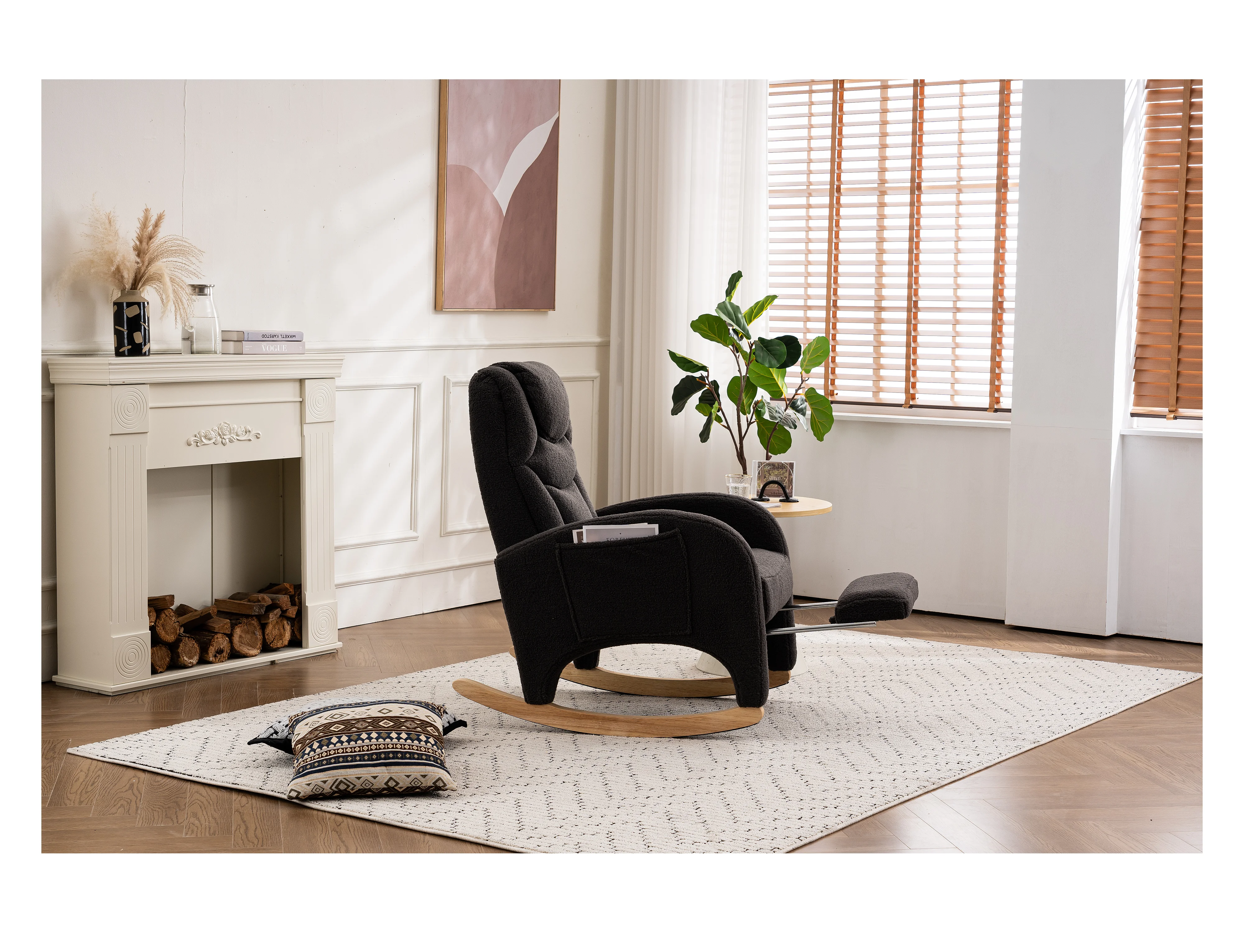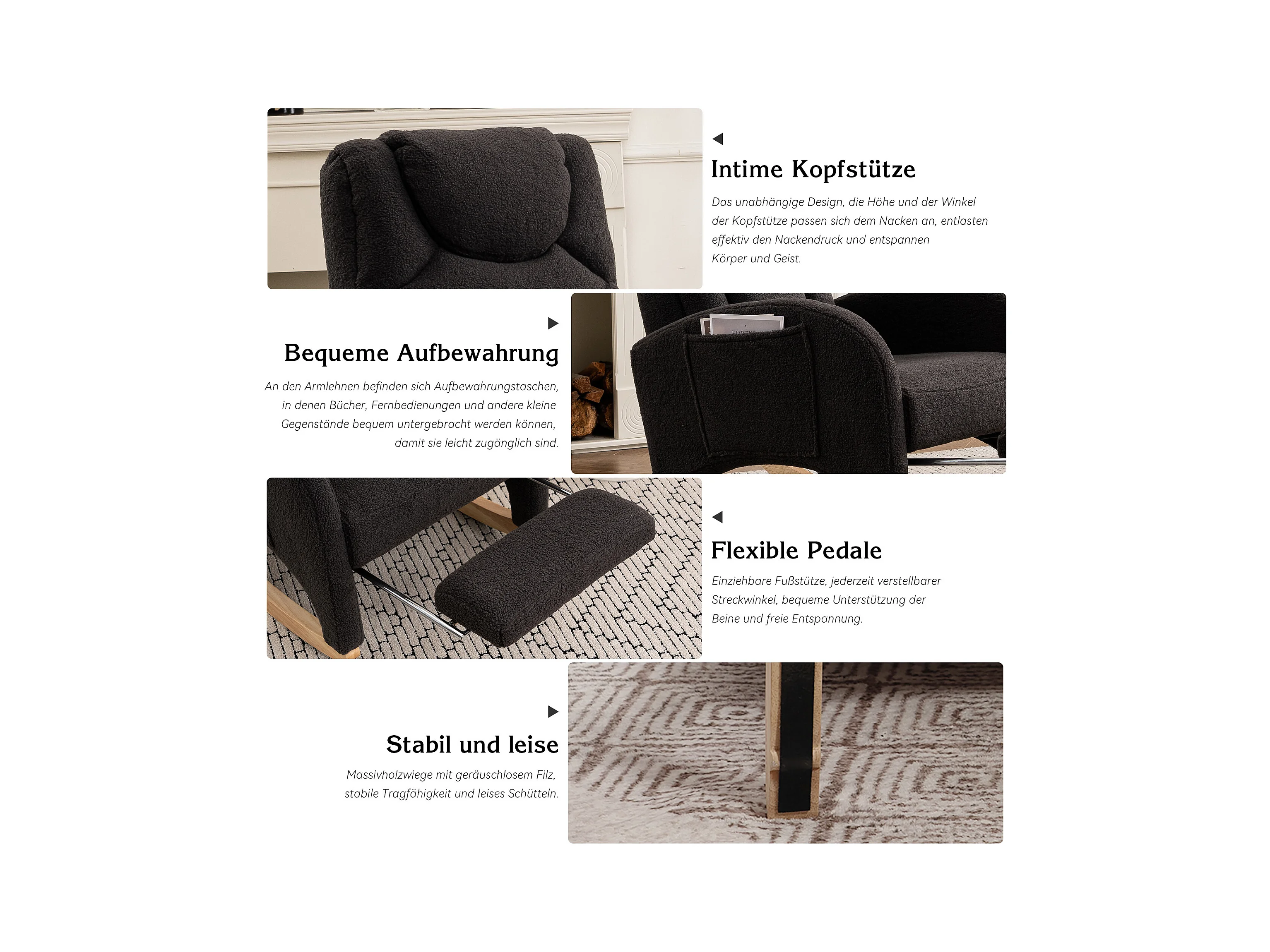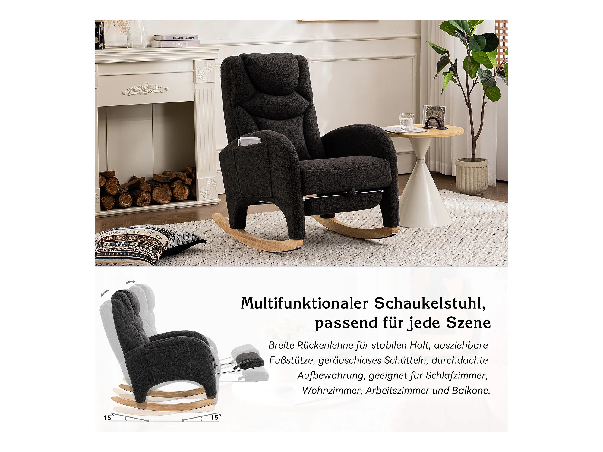 Schommelstoel met poef, Relaxfauteuil, hoge rugleuning, in donkergrijze pluche stof (66x125x101 cm)