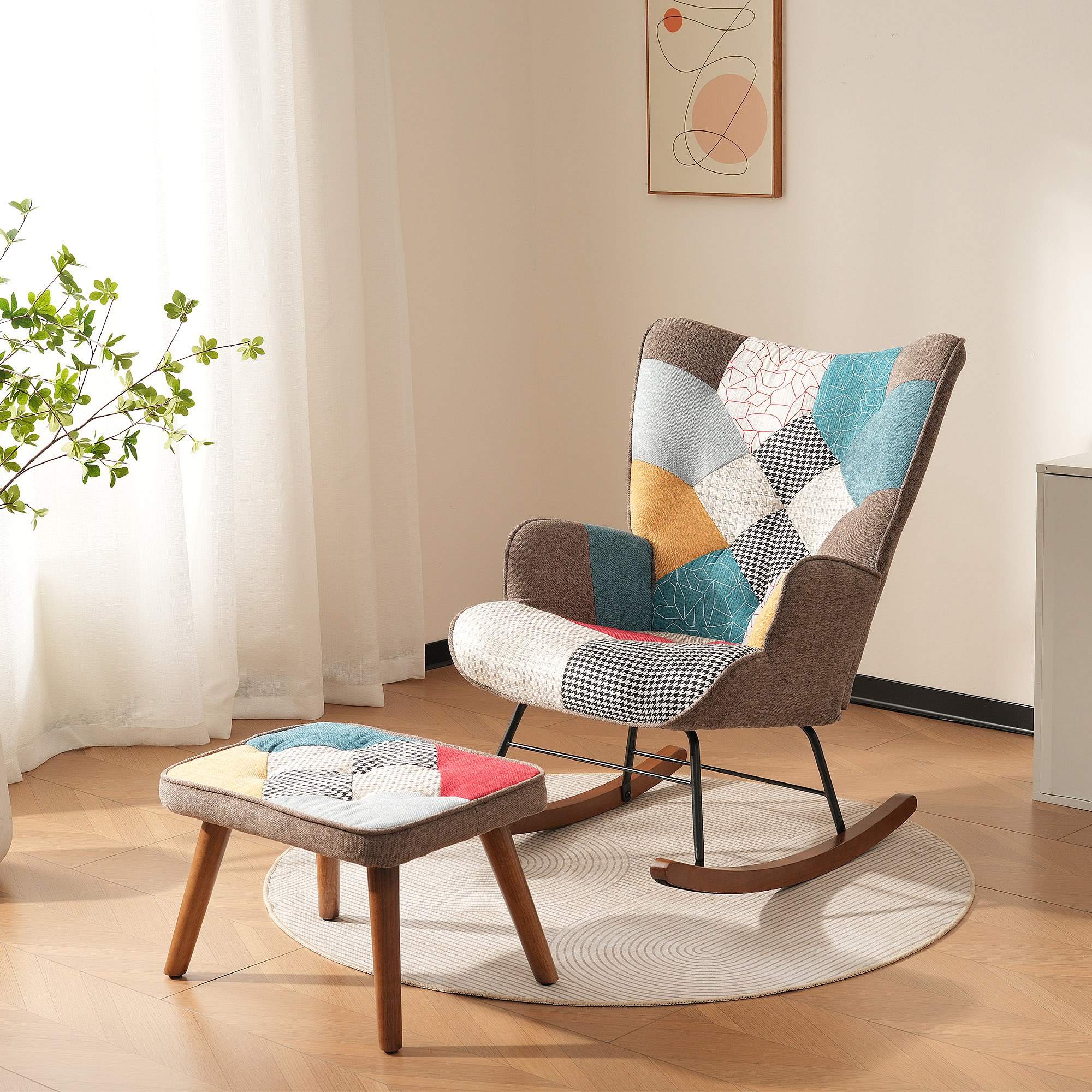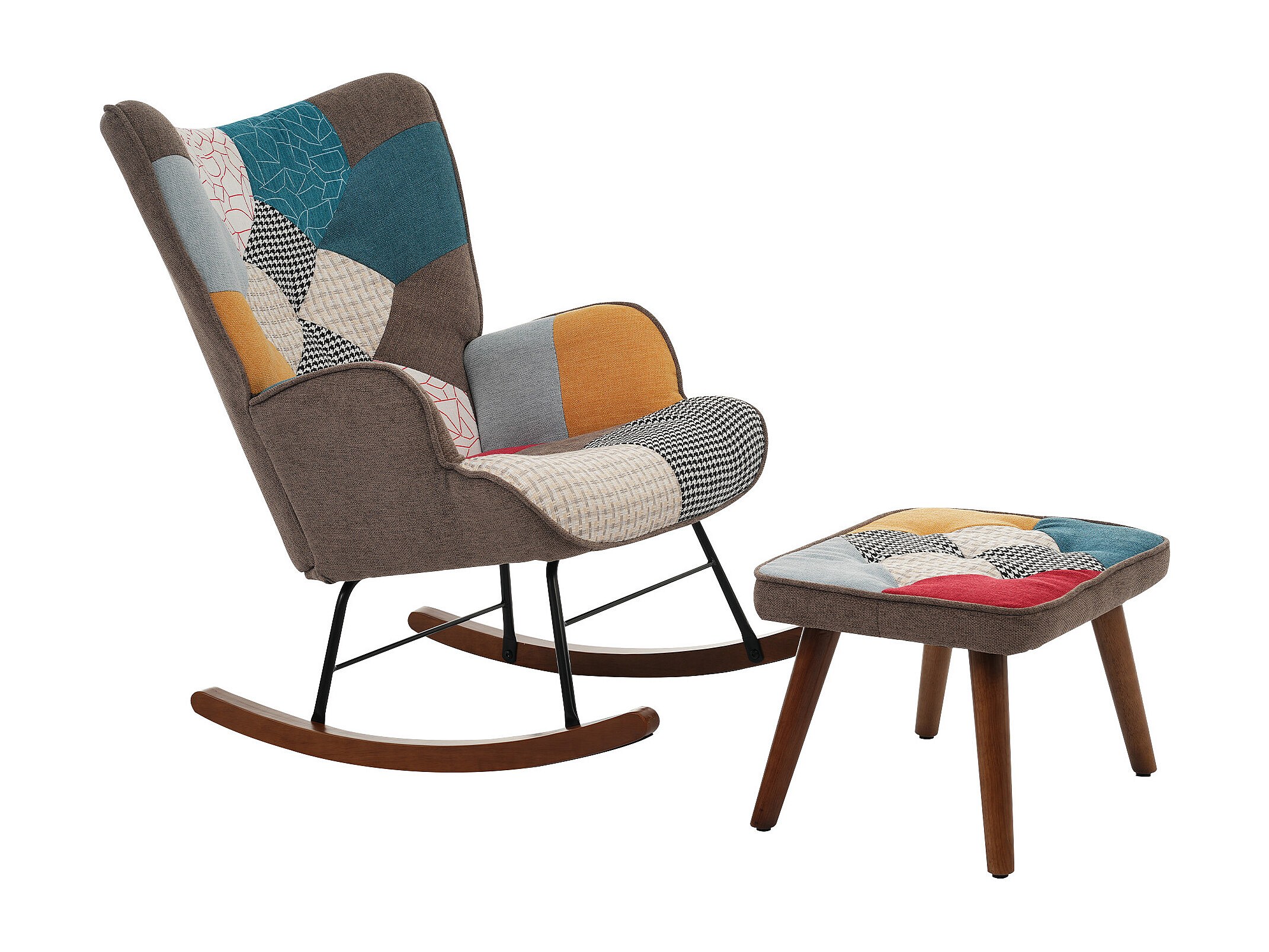 Schommelstoel met voetenbank patchwork stof