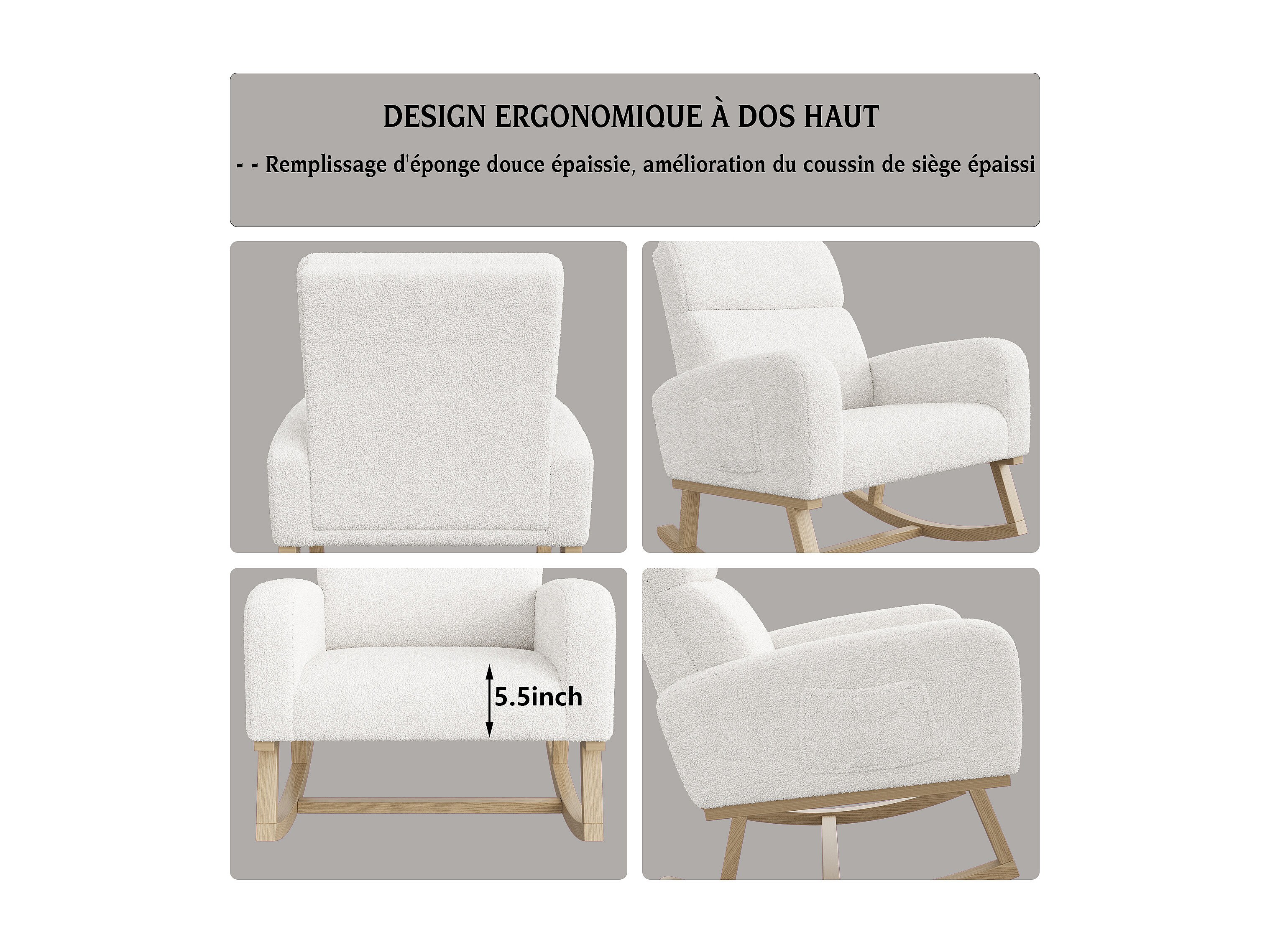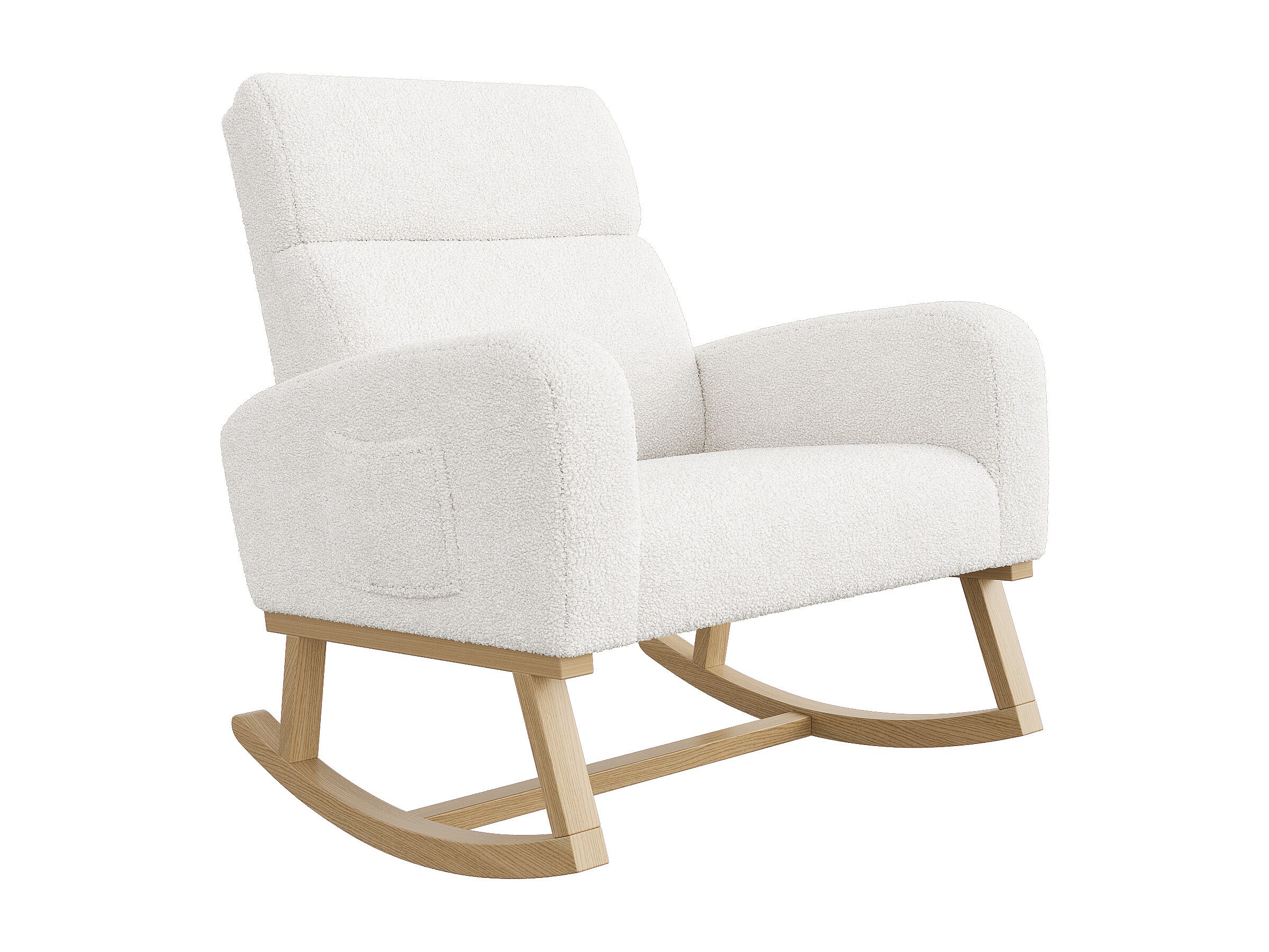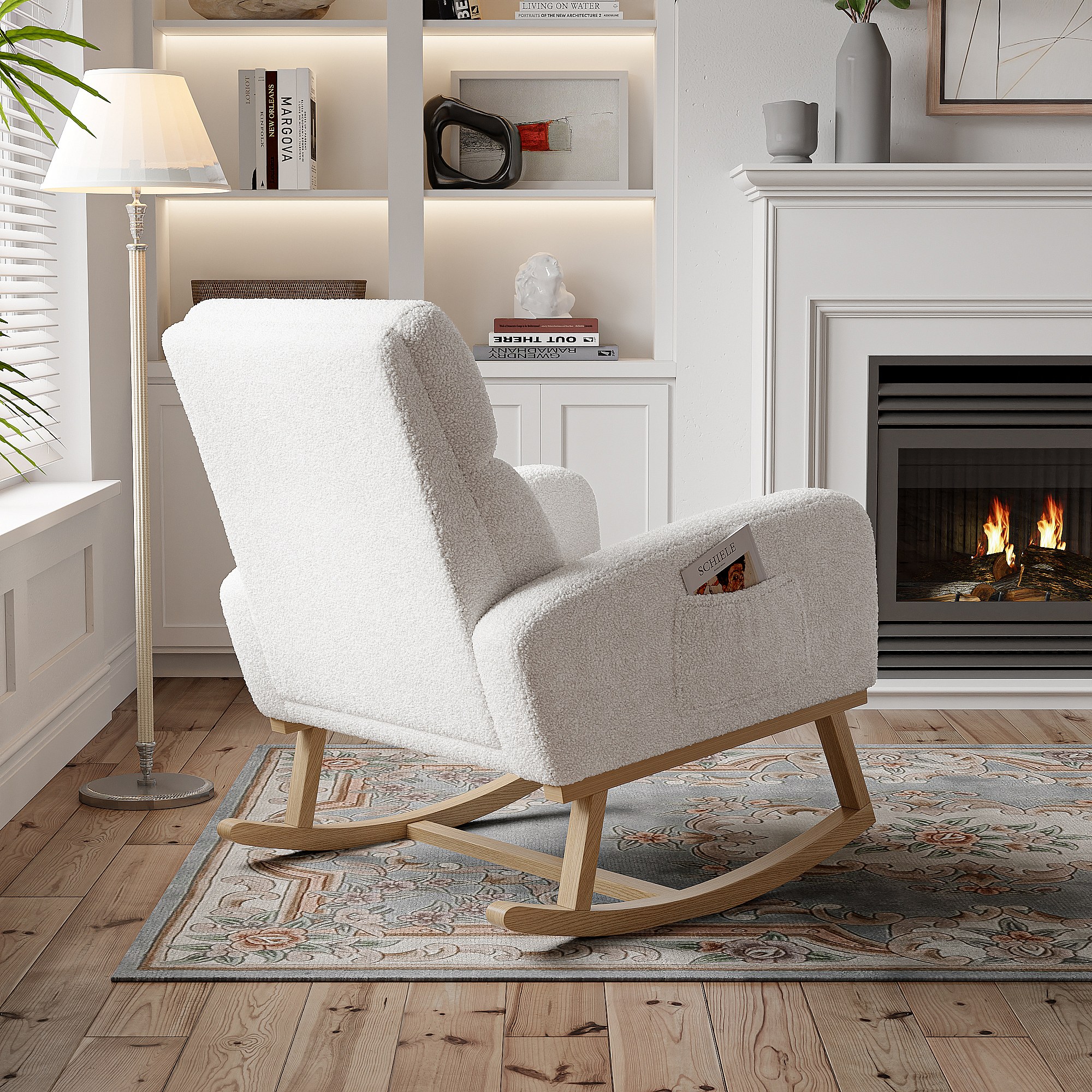 Schommelstoel, relaxstoel, met zakken en houten poten, beige Teddy fluweel