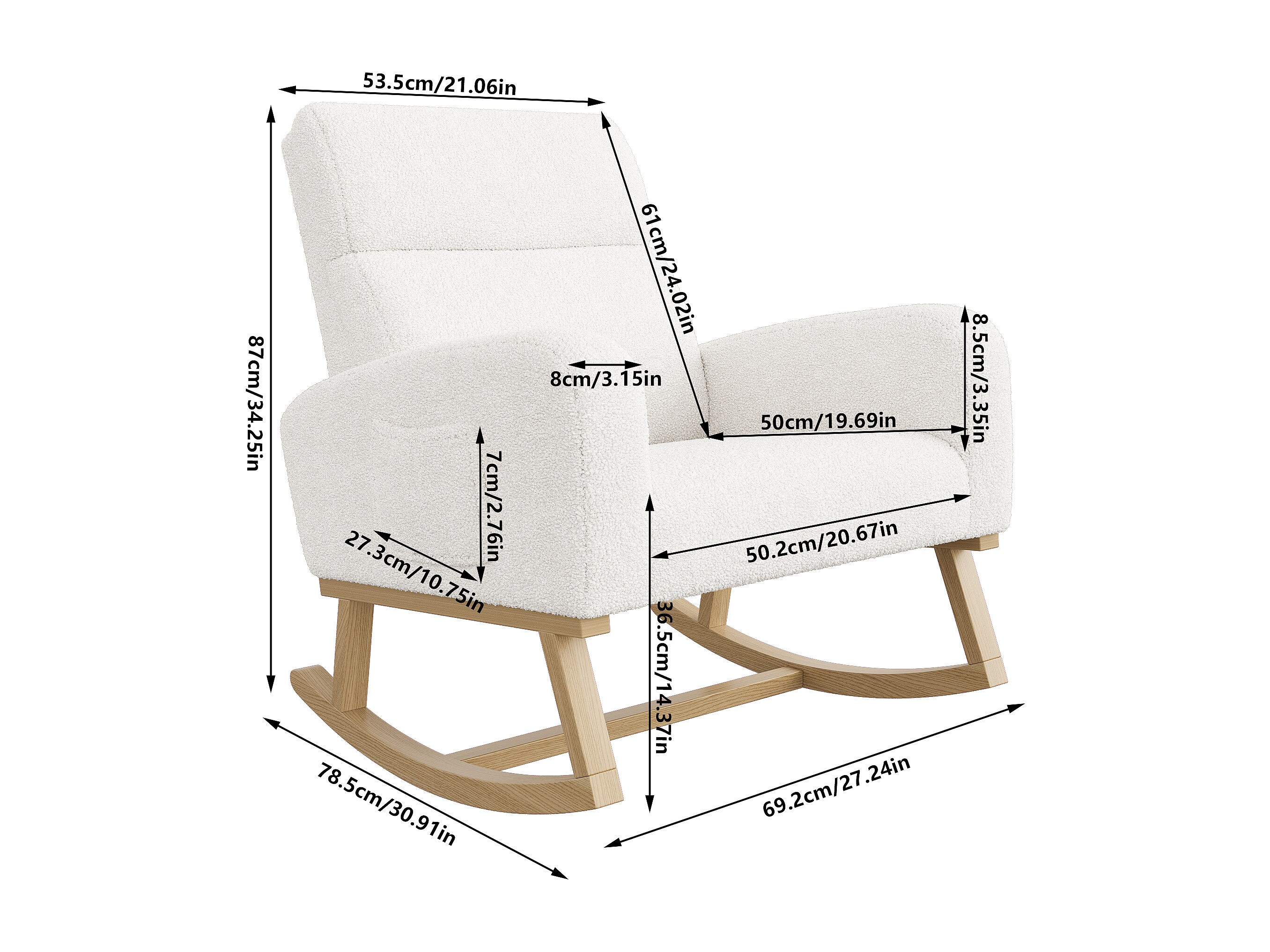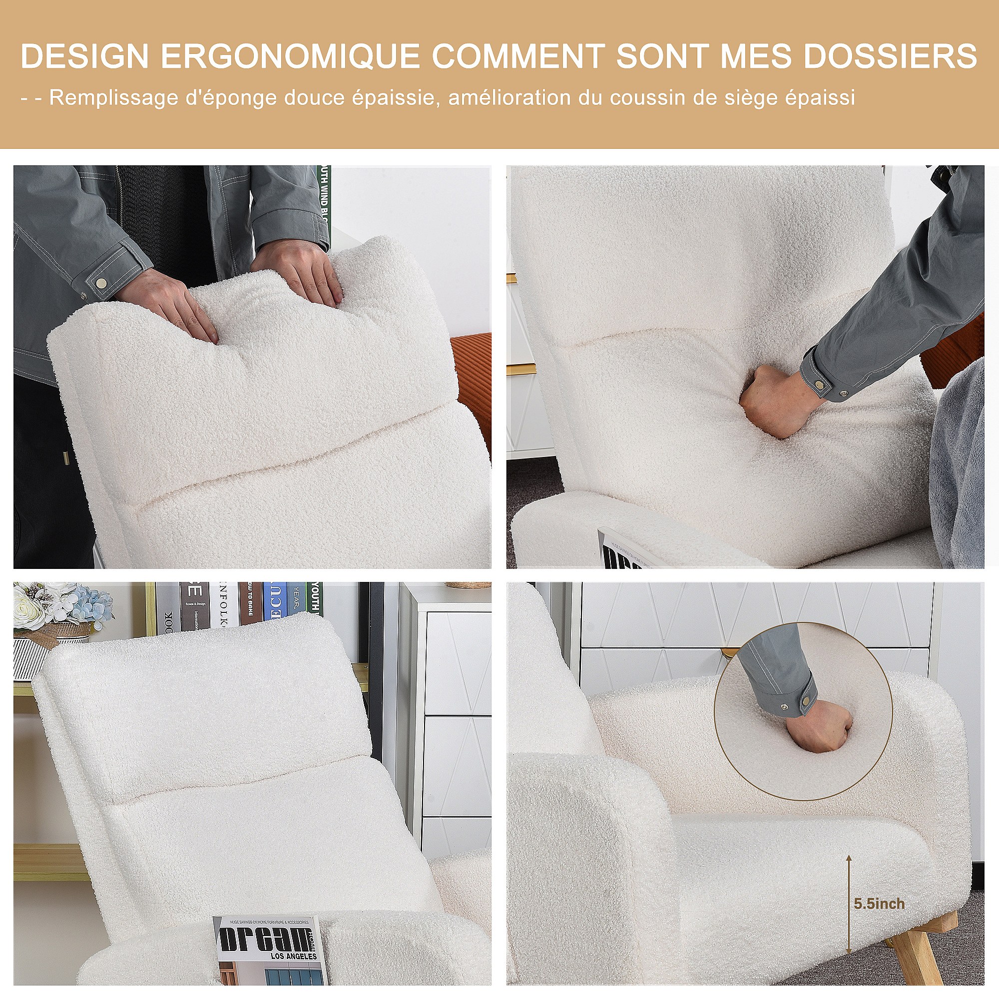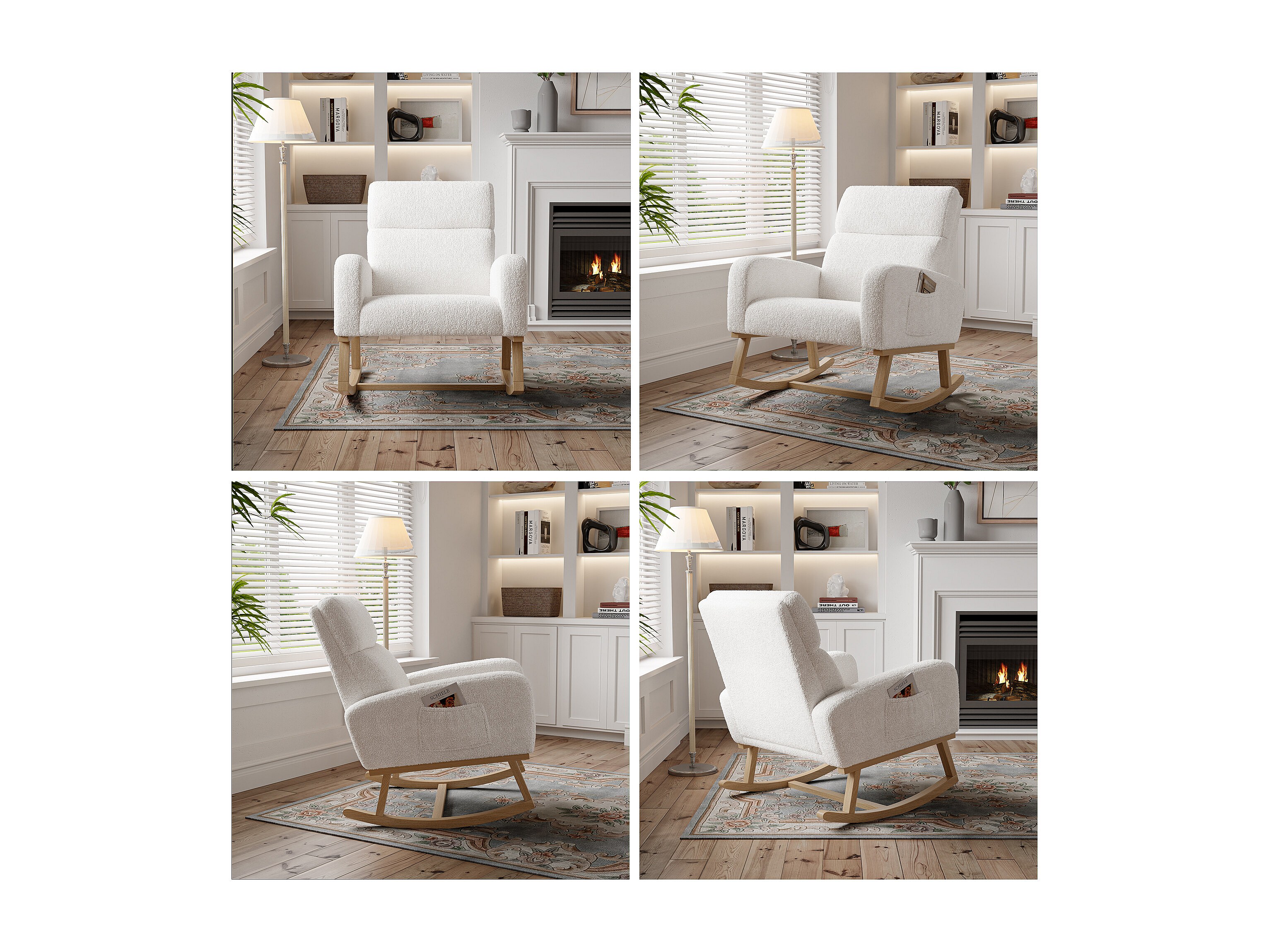 Schommelstoel, relaxstoel, met zakken en houten poten, beige Teddy fluweel