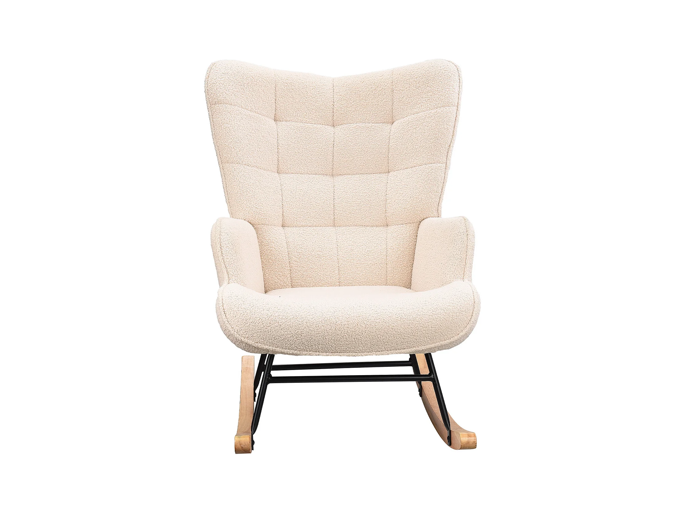 Beige schommelstoel van teddystof met gecapitonneerde rugleuning, comfortabel en modern design voor woonkamer of slaapkamer