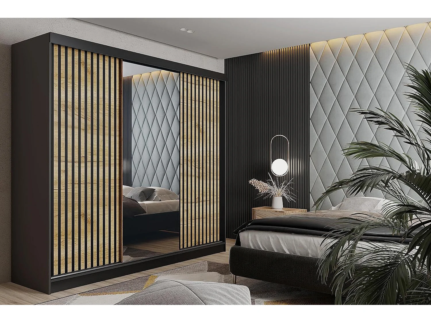 Schuifdeurkast met spiegel en lamellen MALANI 200 - Grafiet + Eiken Craft Goud