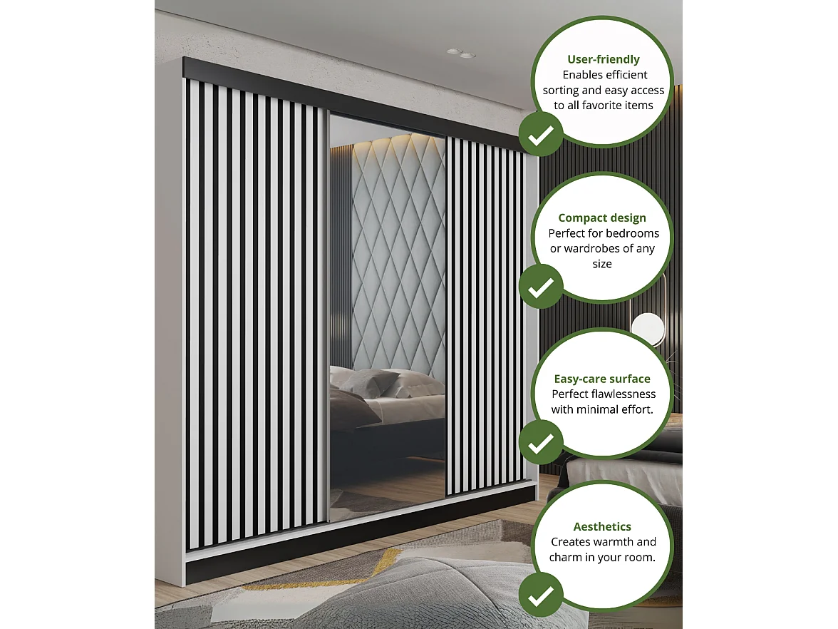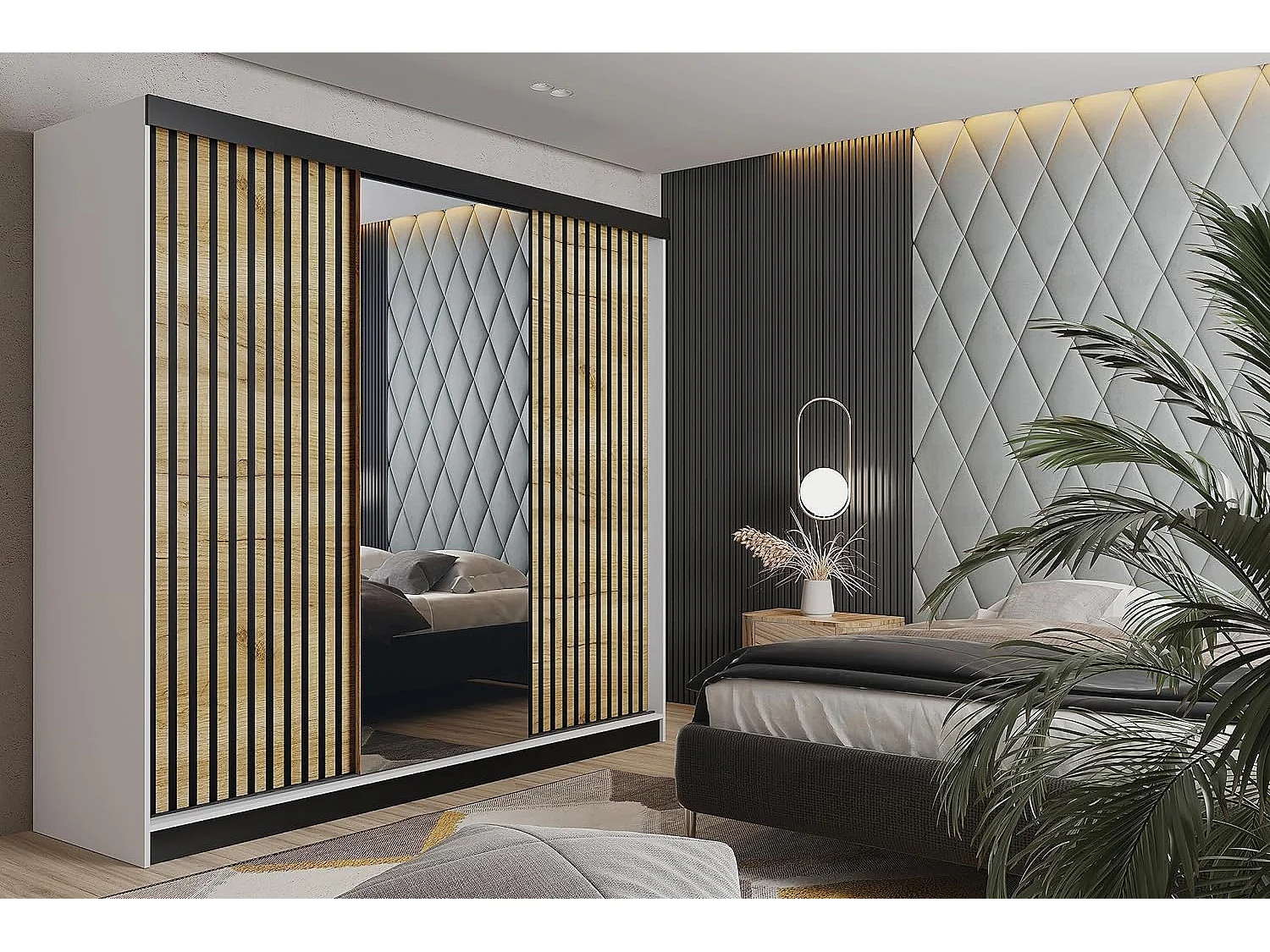 Schuifdeurkast met spiegel en lamellen MALANI 200 - Wit + Eiken Craft Goud