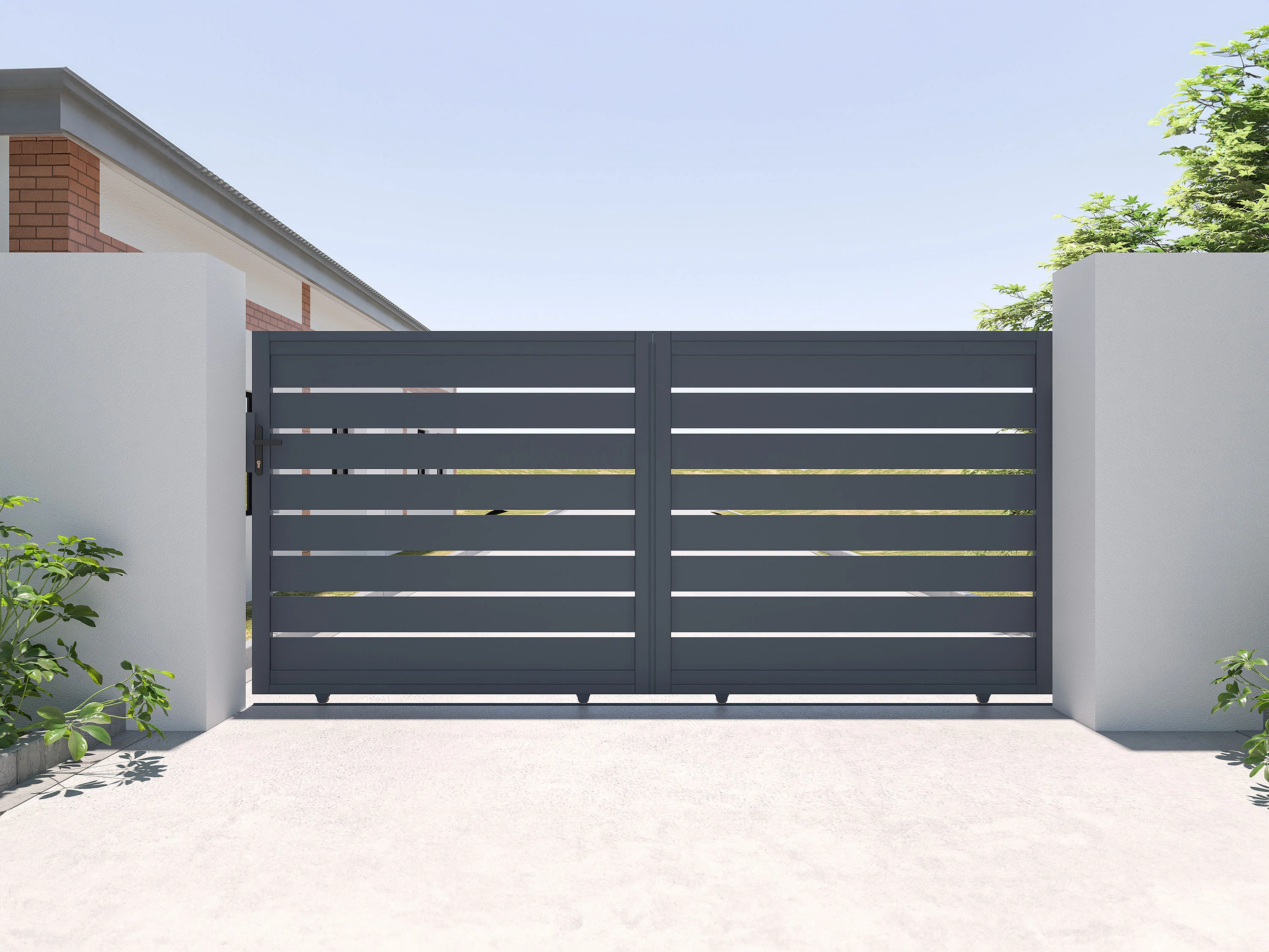Schuifpoort in opengewerkt aluminium L374 x H165 cm donkergrijs - PRIMO