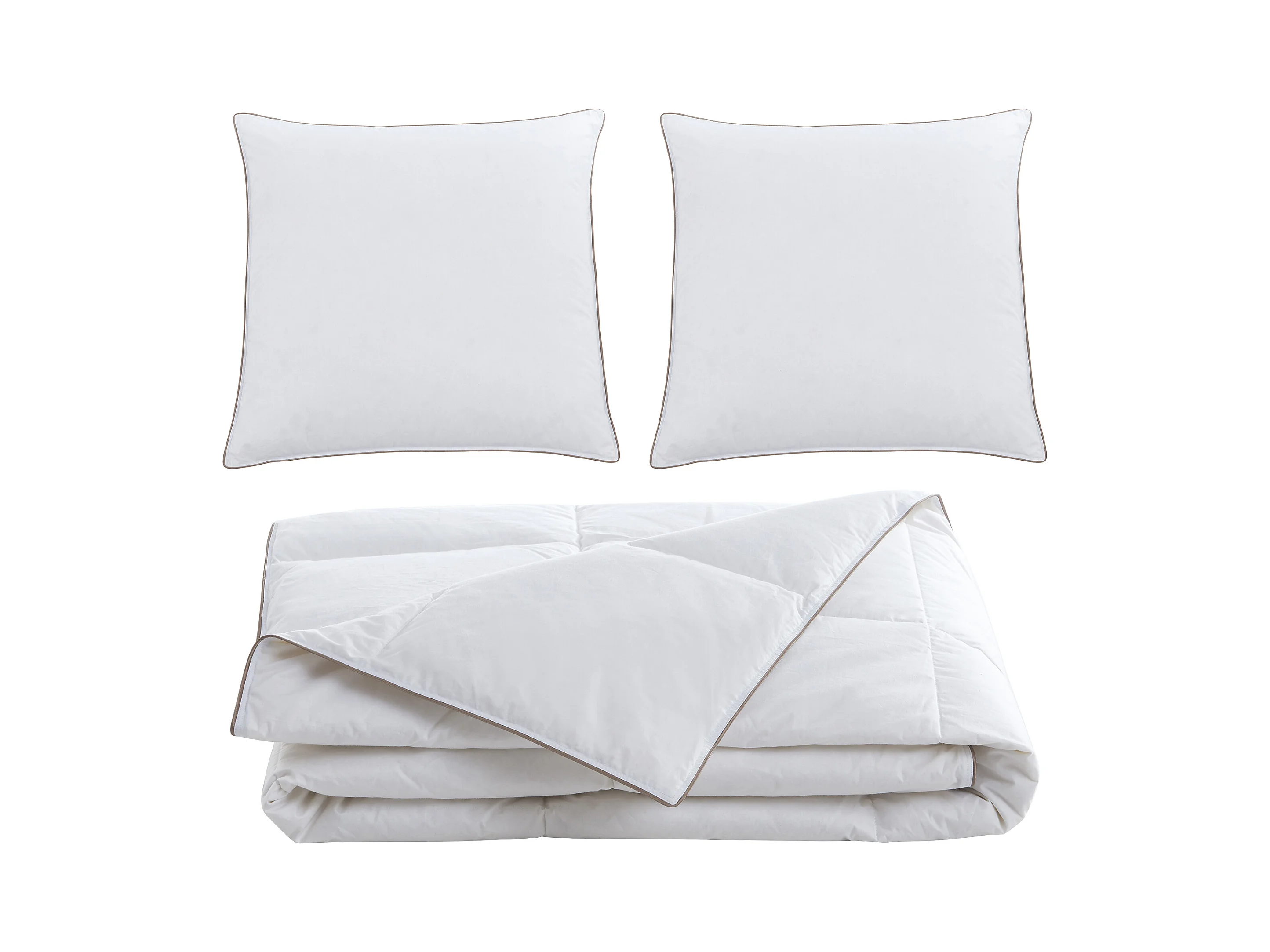Set dekbed 240 x 260 cm + 2 hoofdkussen 65 x 65 cm met antimijtbehandeling, tijk van 100% perkalkatoen en vulling van veren en dons - Wit met taupegrijze paspel - FEATH van PALACIO