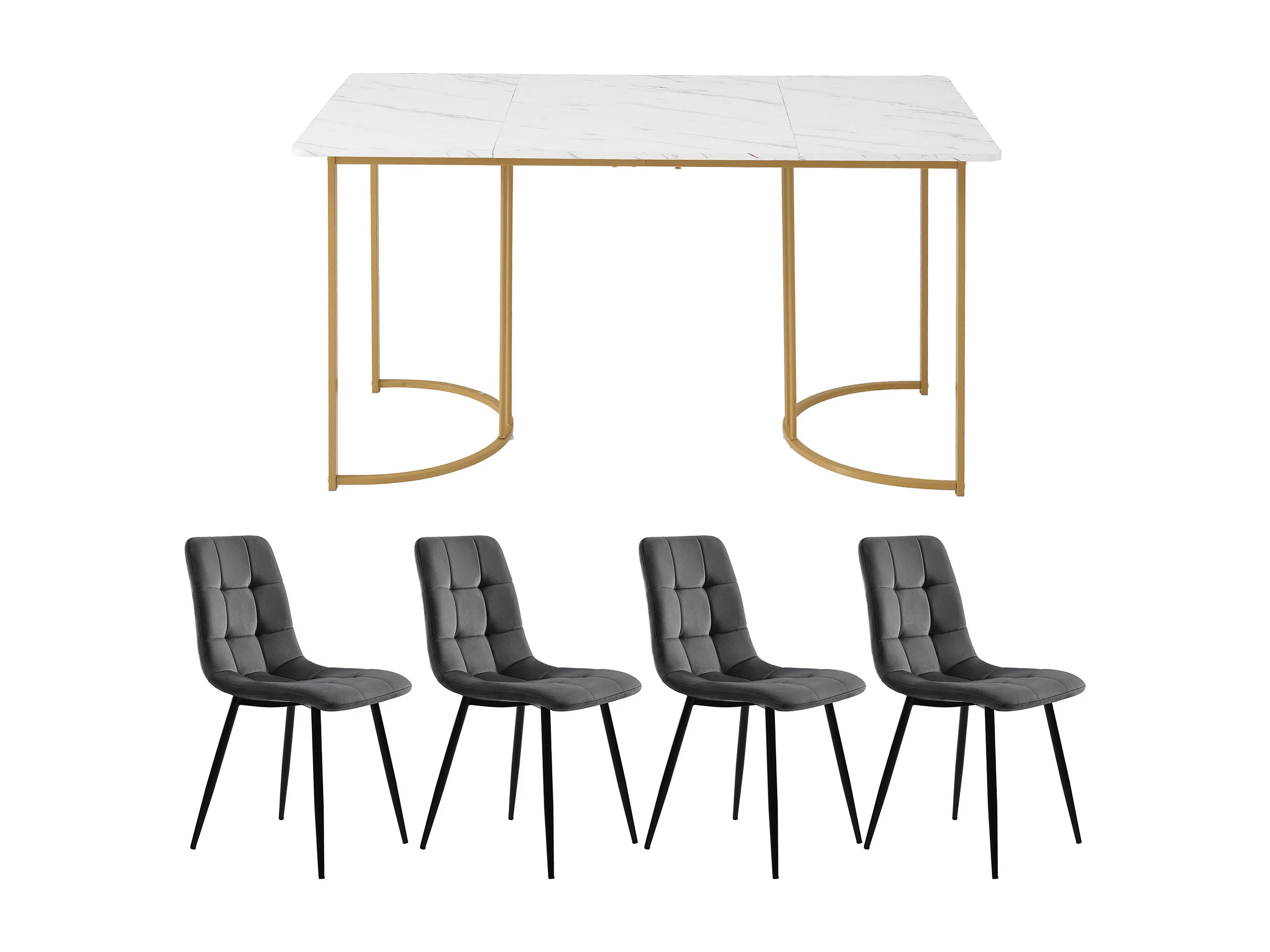 Set van 140x80 cm tafel en 4 donkergrijze fluwelen stoelen - gouden metalen tafelpoten - wit MDF blad