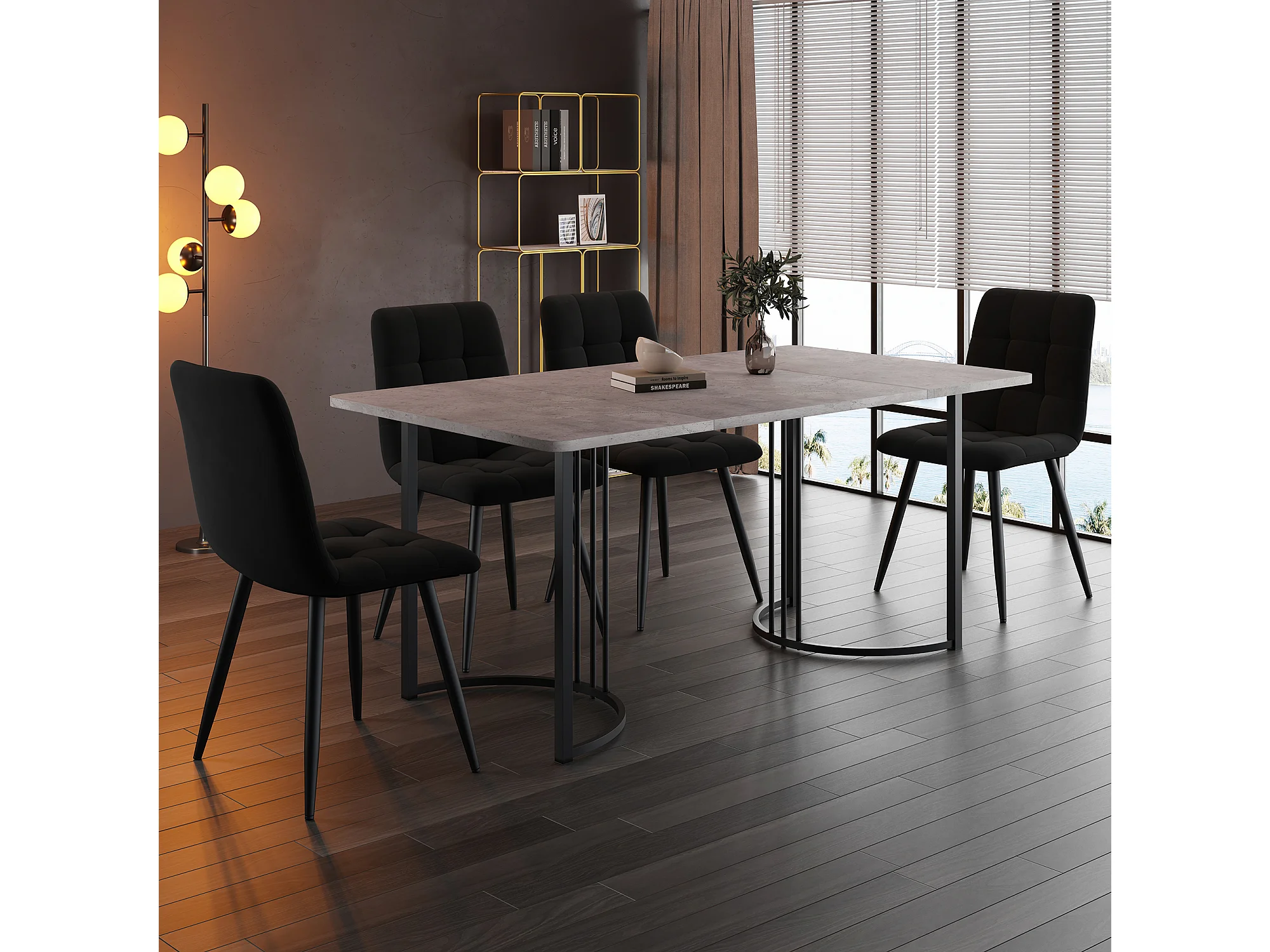 Set van 140x80 cm tafel en 4 zwarte fluwelen stoelen - zwarte metalen tafelpoten - grijs MDF blad