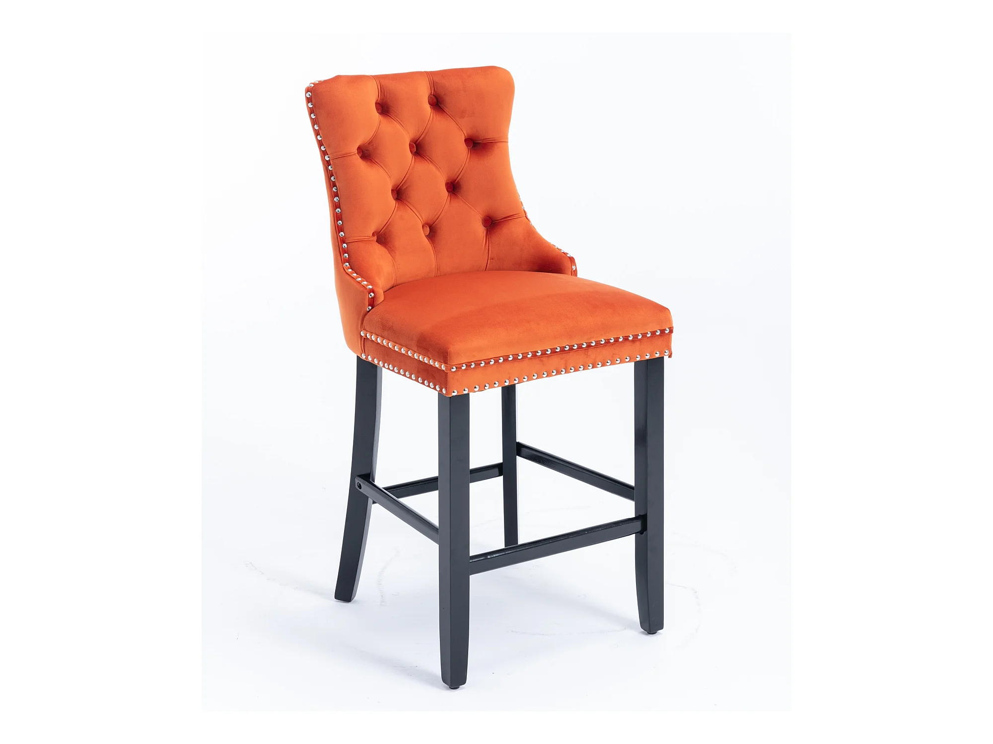 Moderne barkruk, gestoffeerd, massief hout, houten onderstel, chromen klinknagels, fluweel, oranje (60x50x103 cm)