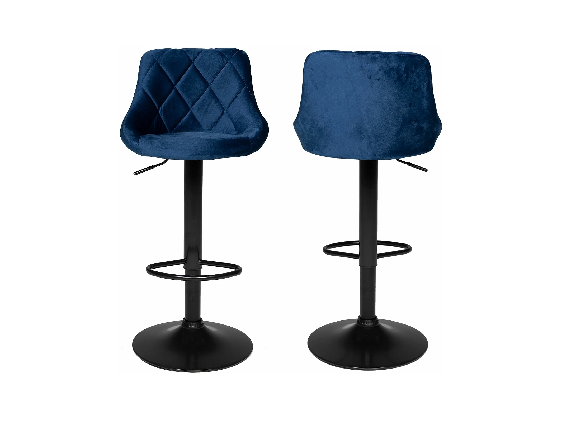 Set van 2 barkrukken van blauwe fluweel, draaibaar en in hoogte verstelbaar