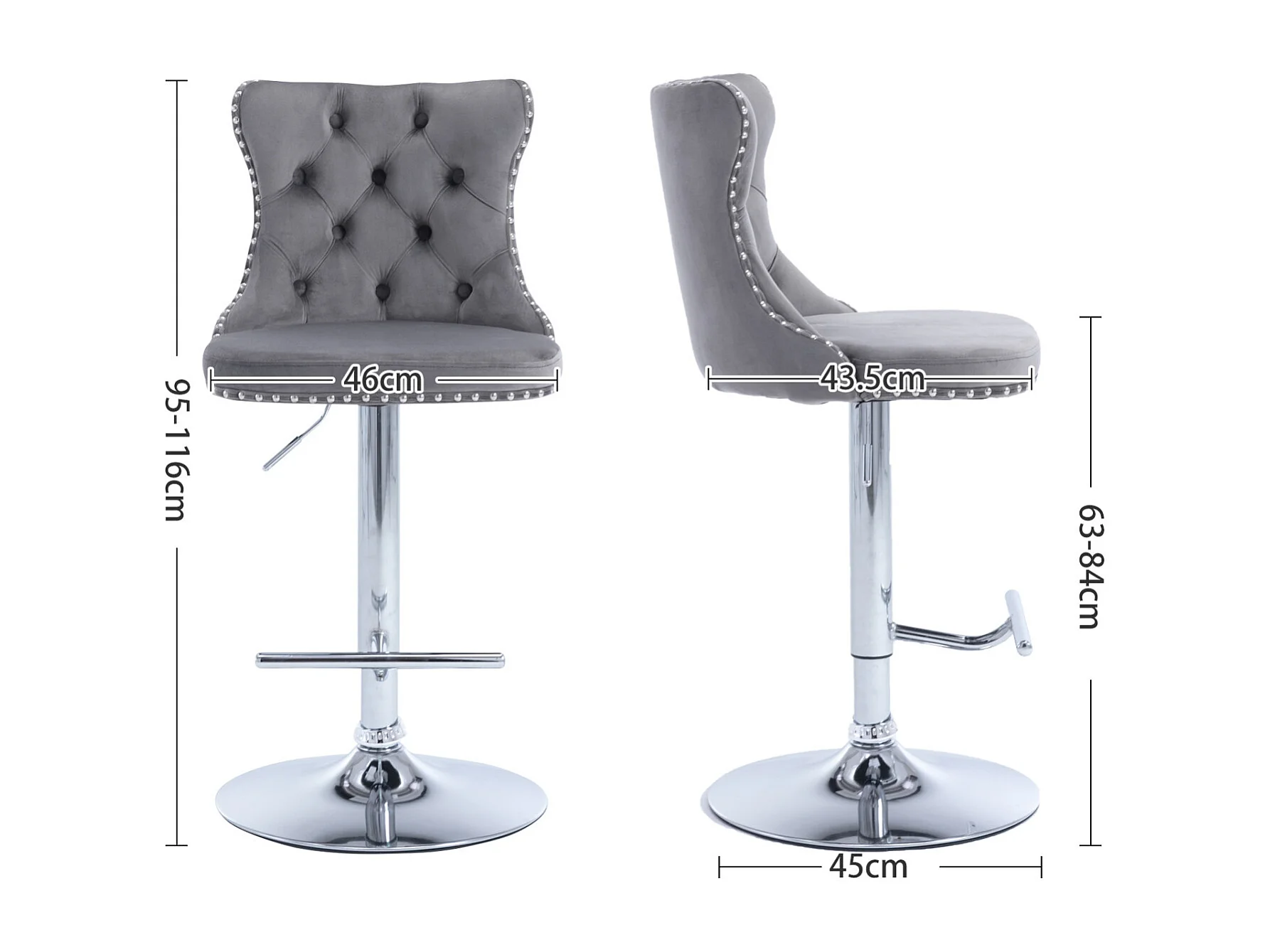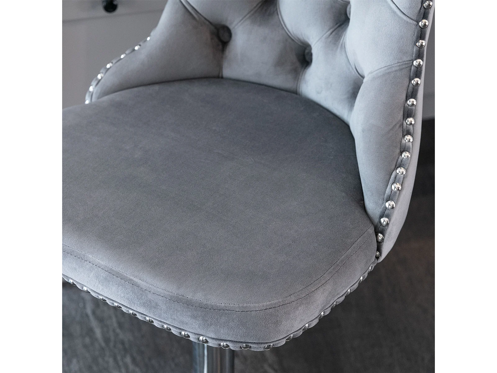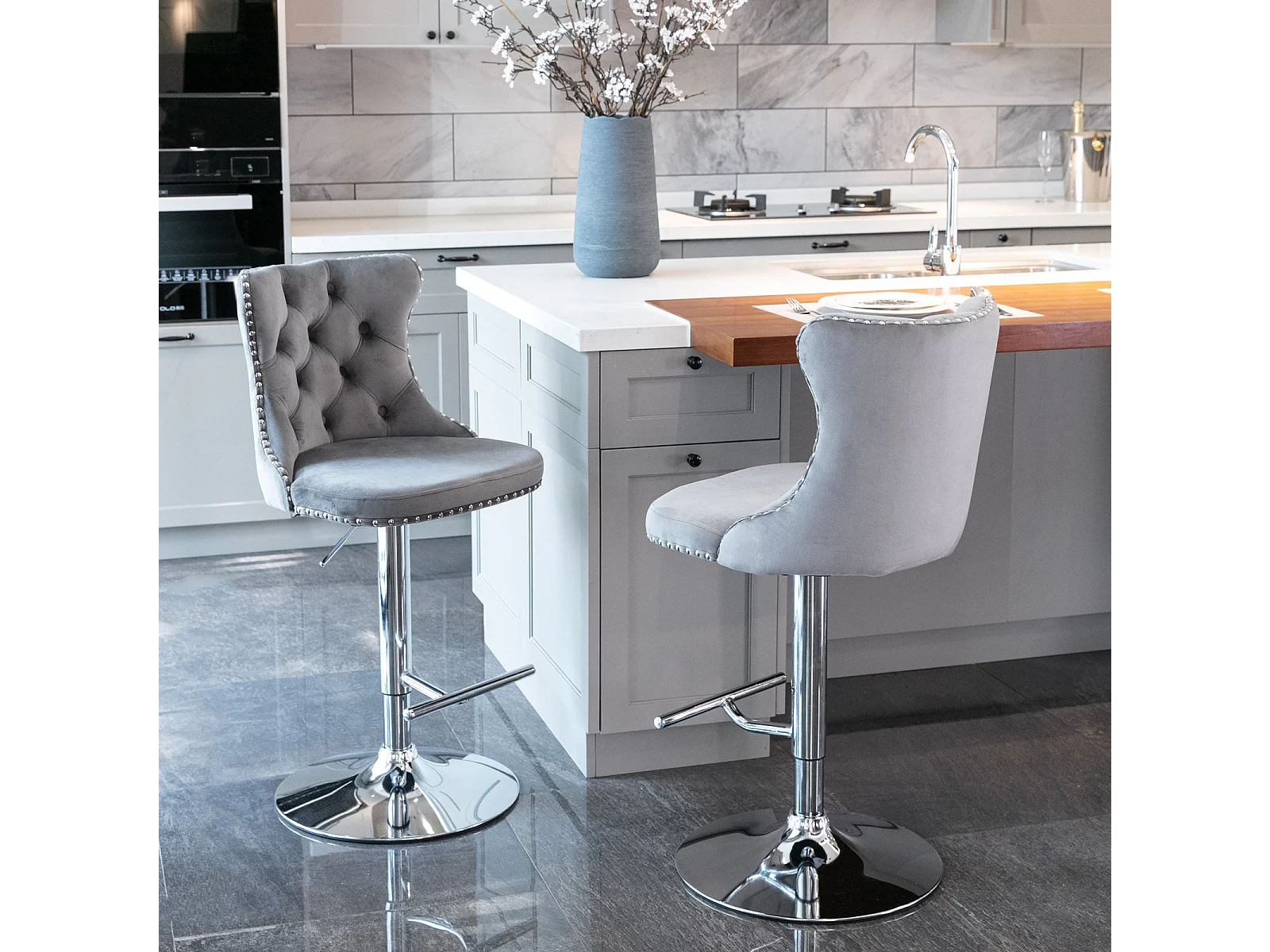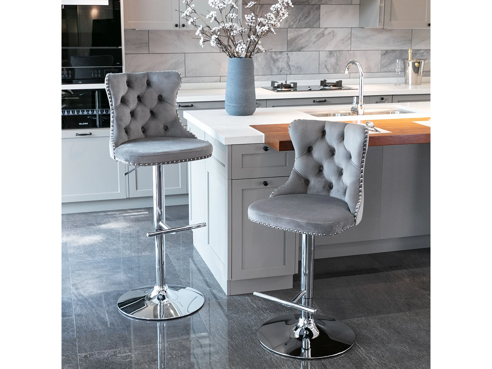Set van 2 draaibare barkrukken in fluweel - Verstelbare hoogte van 63,5 tot 84 cm - Grijs en zilver