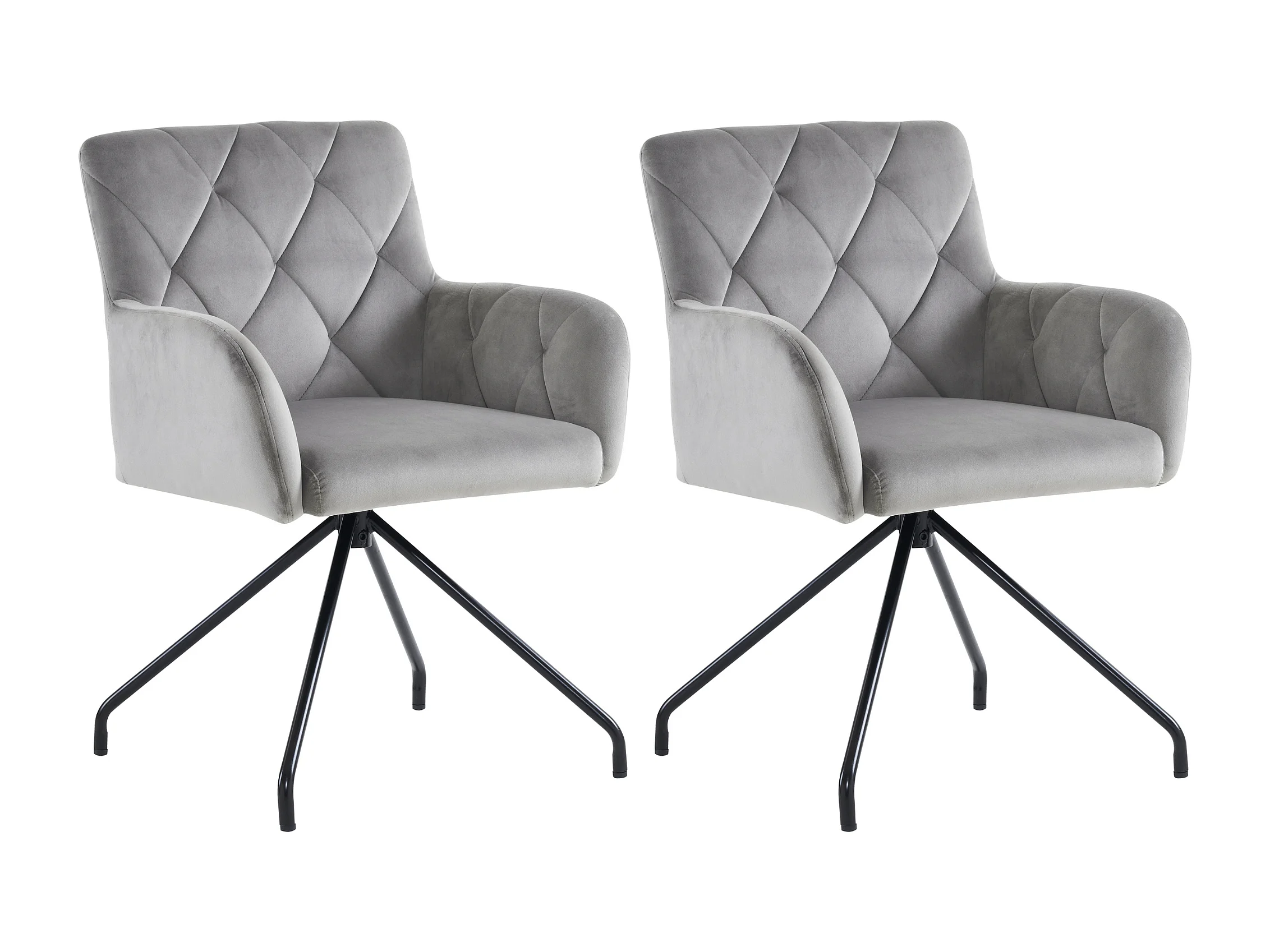 Set van 2 eetkamerstoelen, lichtgrijs fluweel, stoel met rugleuning met ruitpatroon, zwarte metalen poten