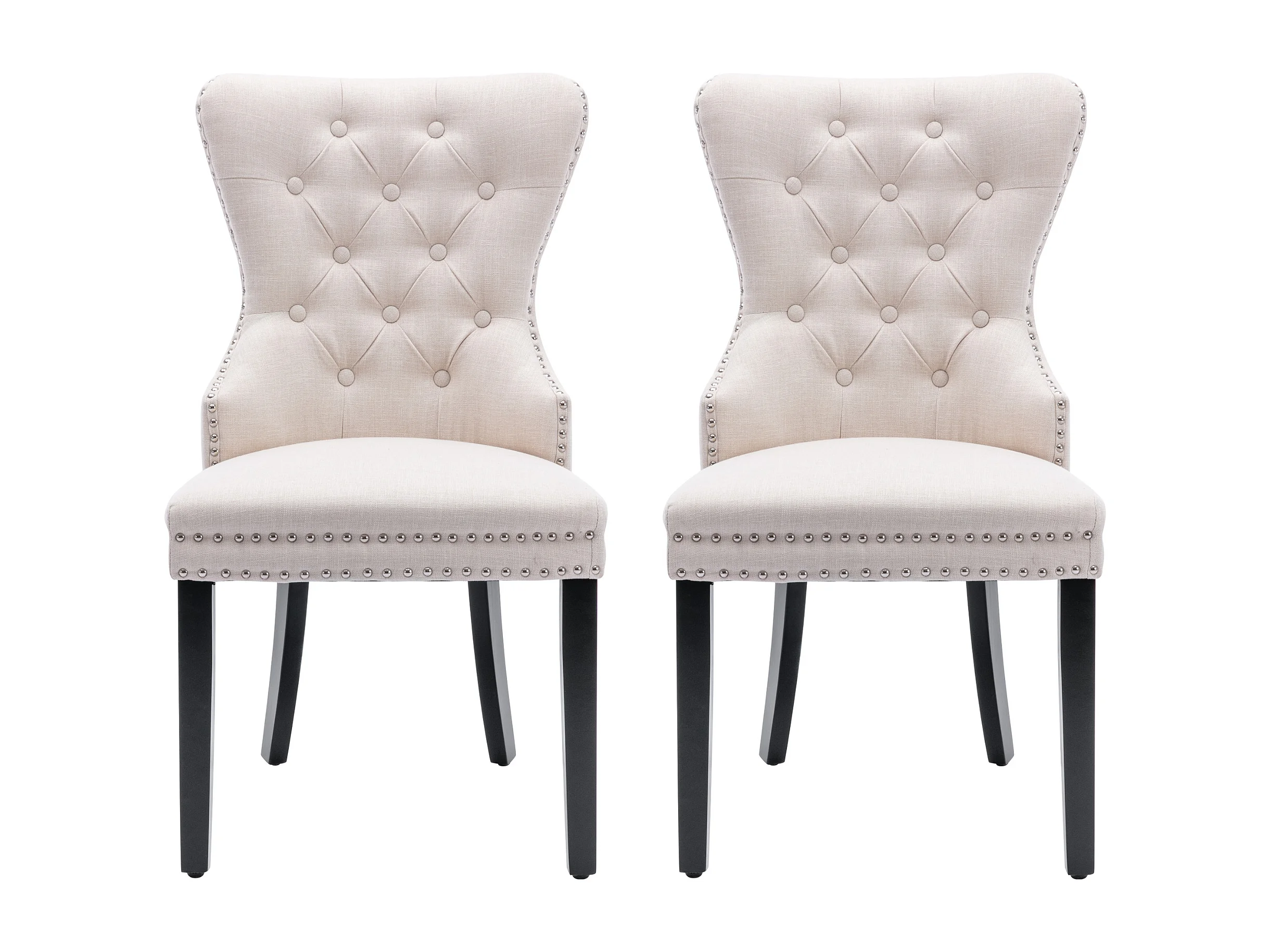 Eetkamerstoel van linnen, set van 2, met eikenhouten poten, decoratieve knopen, chromen studs, keukenstoel, woonkamer, lounge, beige (afmetingen: 50 x 54 x 97 cm)