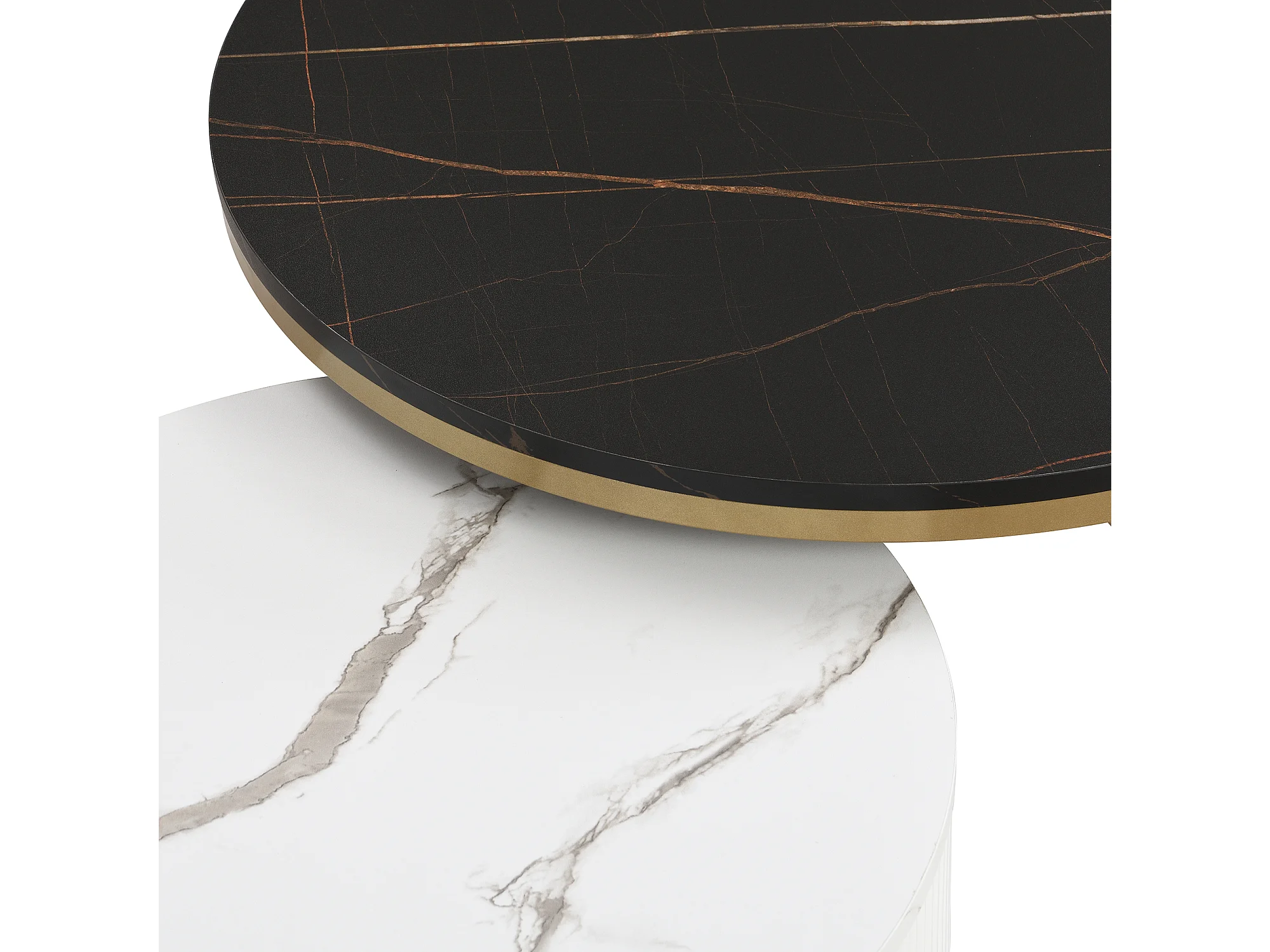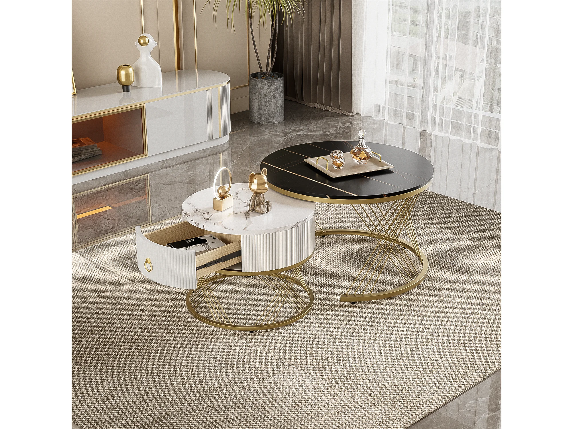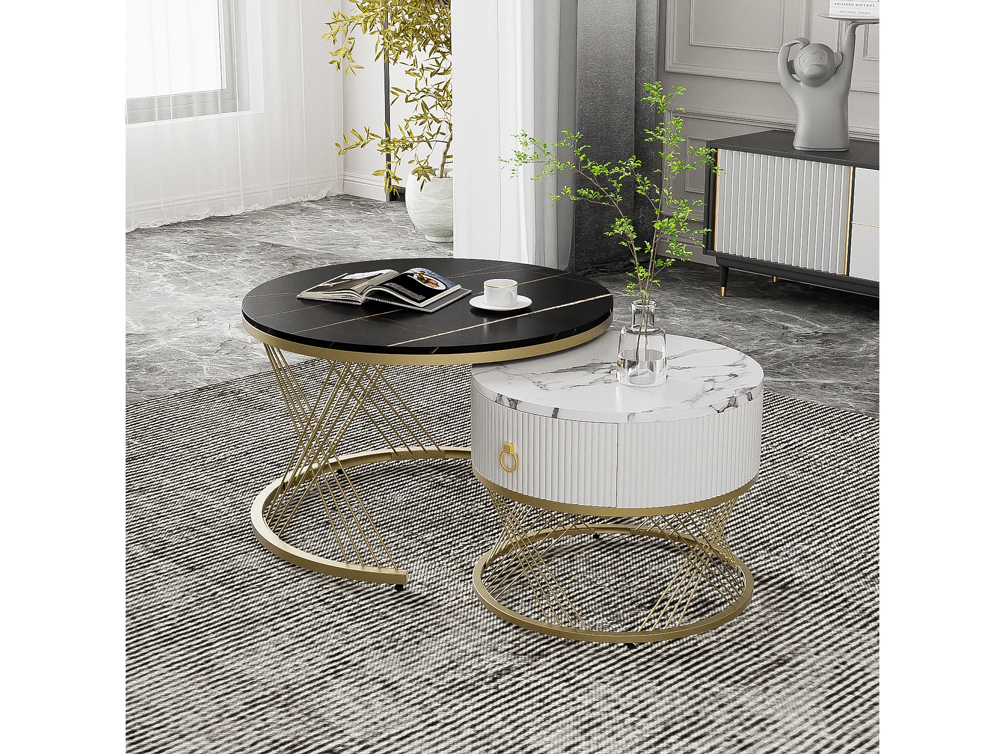 Set van 2 in elkaar passende salontafels, salontafel met lade, wit, wit & zwart