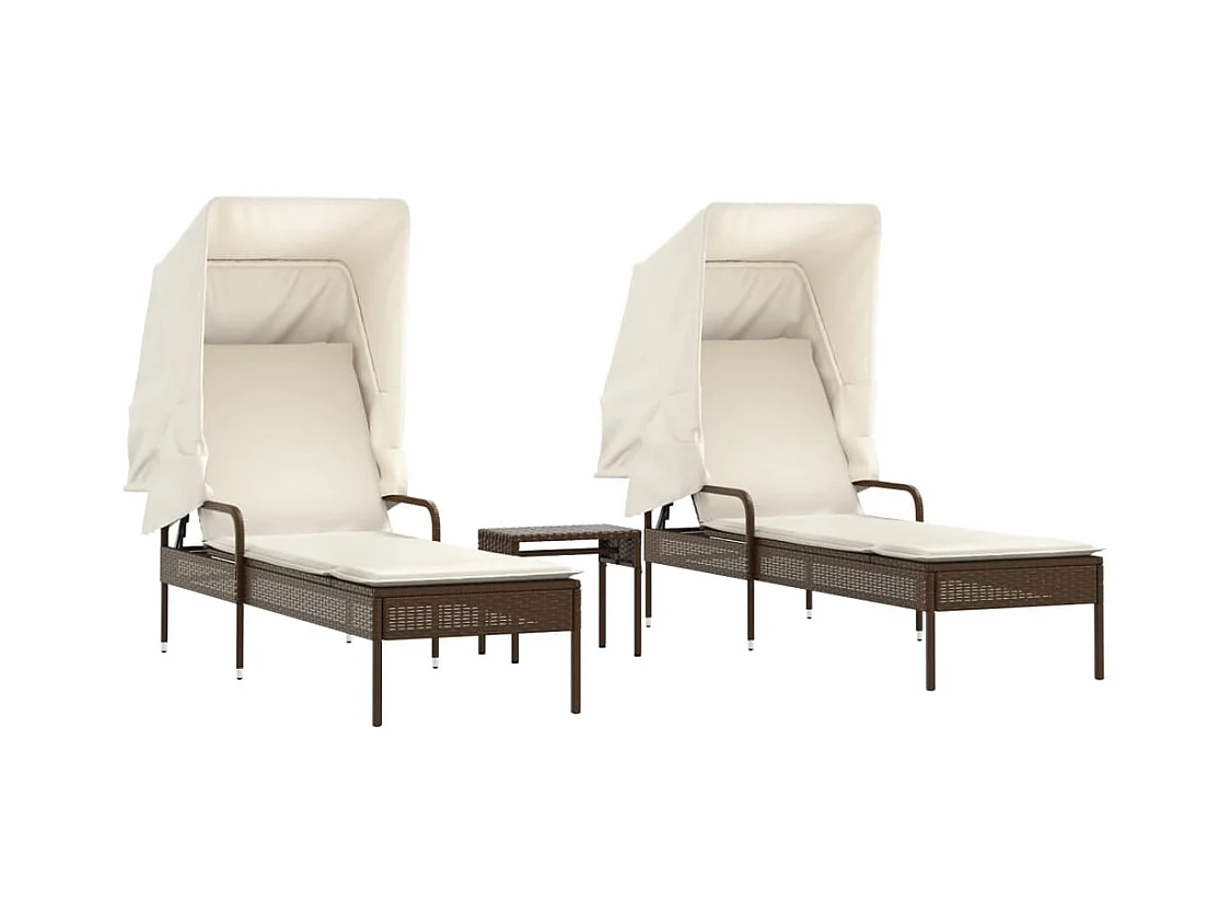 Set van 2 ligstoelen met luifels en tafel in bruin polyrotan