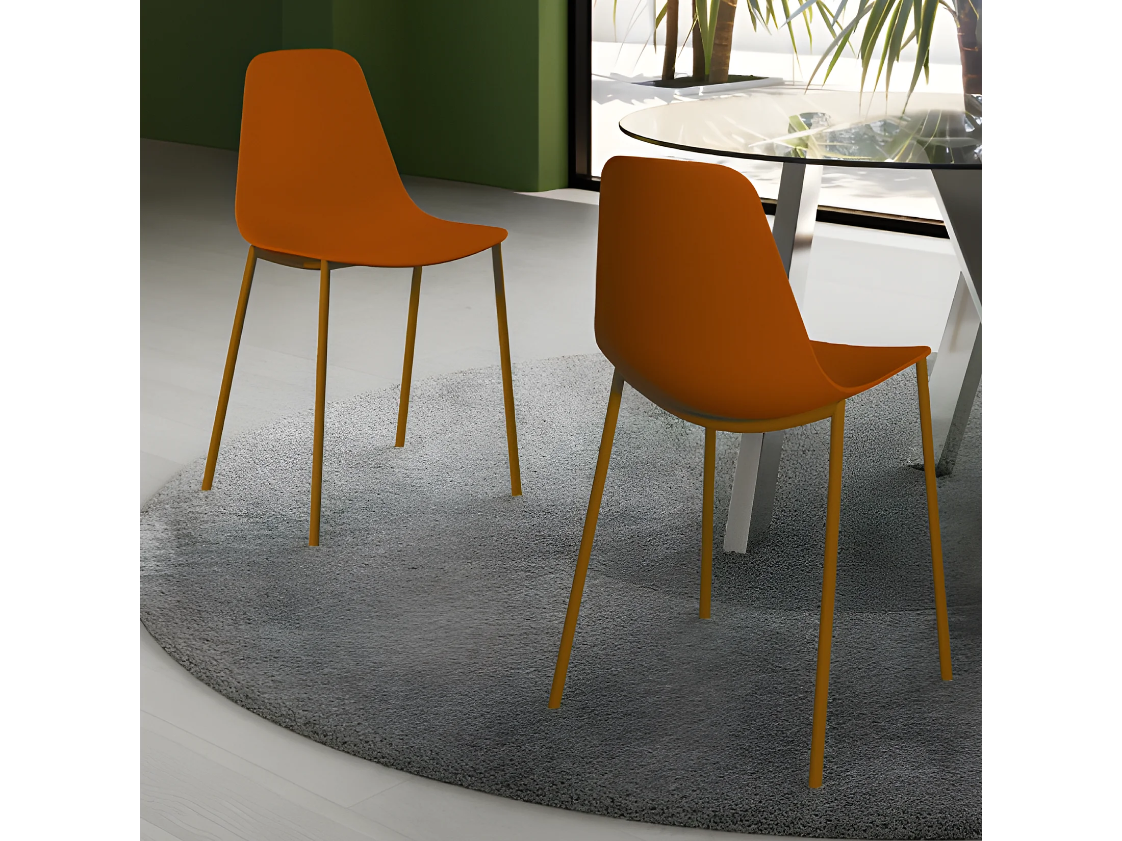 Set van 2 moderne "Kate" roestkleurige polypropyleen woonkamerstoelen met geverfd metalen frame