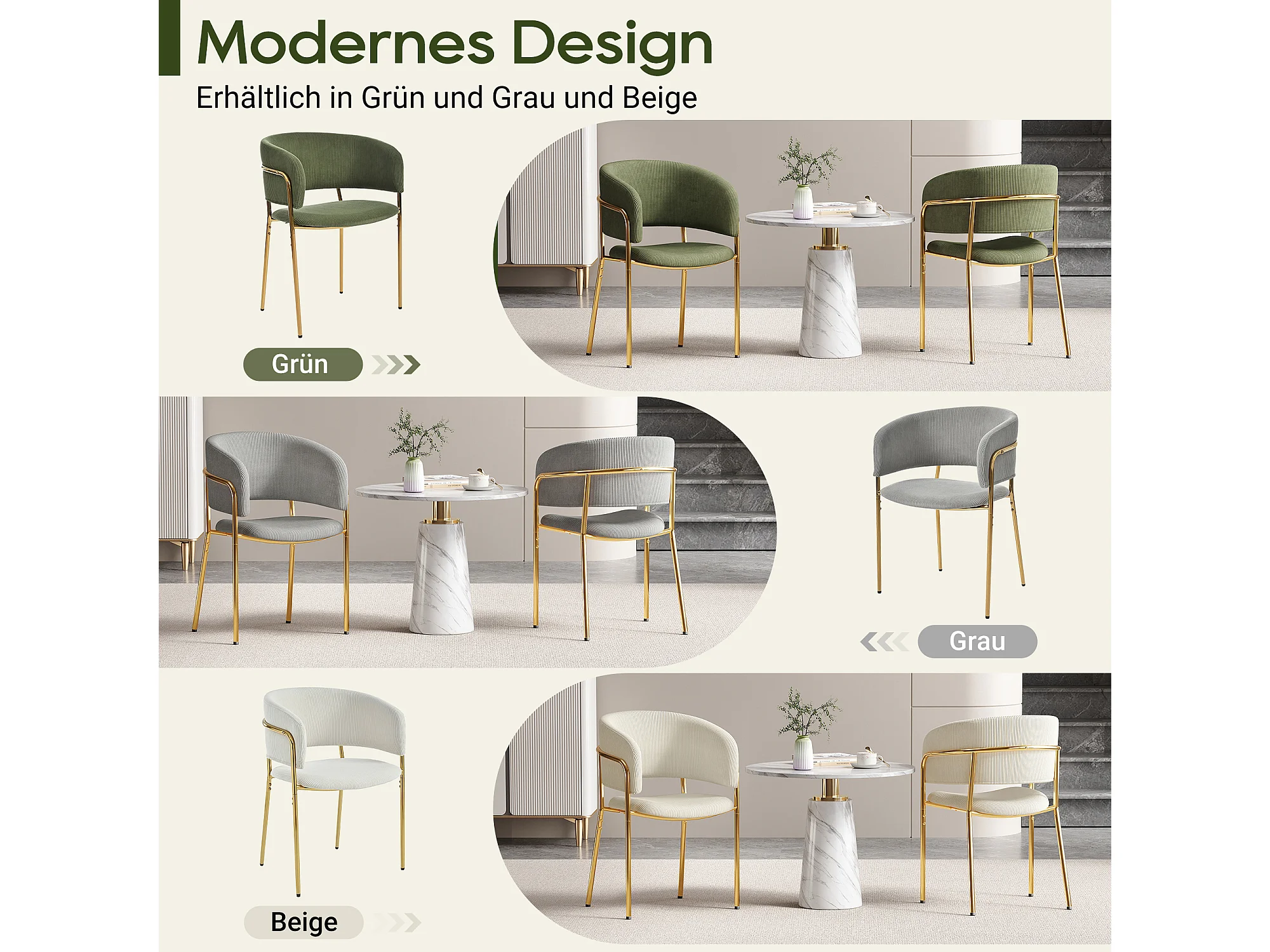 Set van 2 moderne stoelen met schuine poten - 55 x 55 x 80 cm - gouden poten - voor de woonkamer en eetkamer - metaal + hout - beige