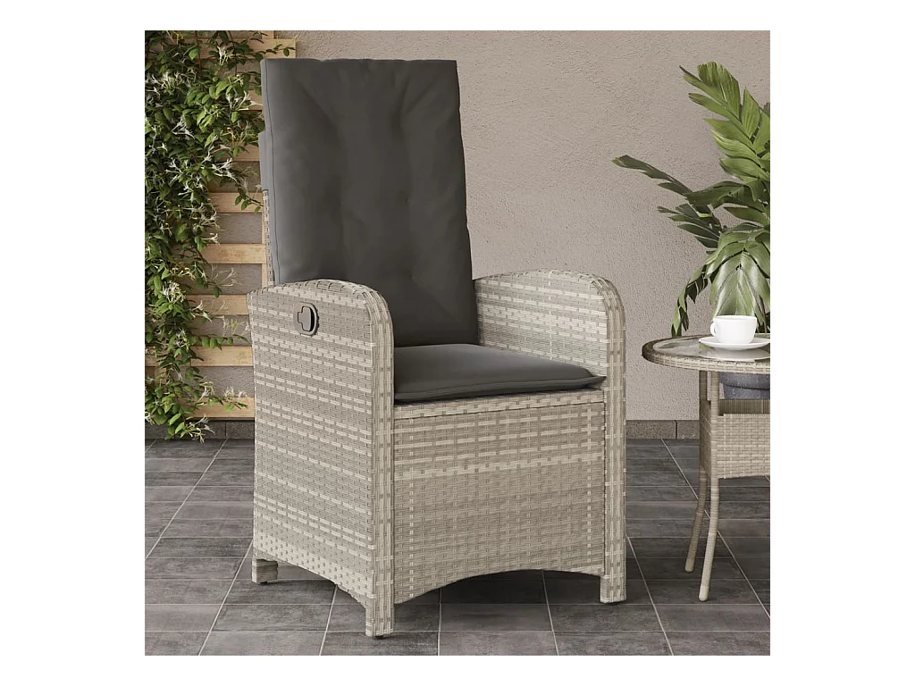 Liggende tuinstoel met lichtgrijze kussens van gevlochten hars