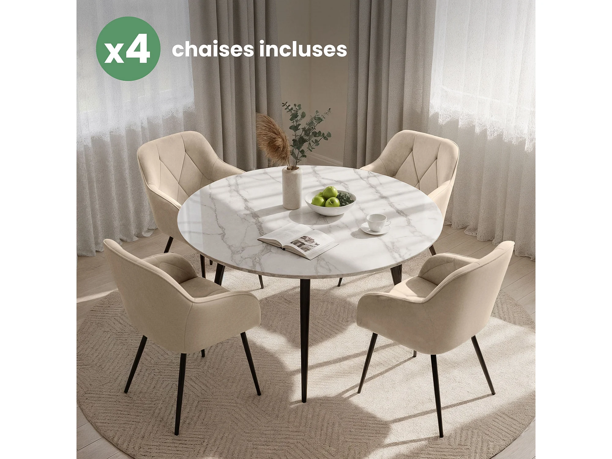 Set van 4 Eetkamerstoelen DIAMANTE met Armleuningen / Gestoffeerde Stoelen / Fluwelen Stoelen en Metalen Poten / Beige met zwarte benen