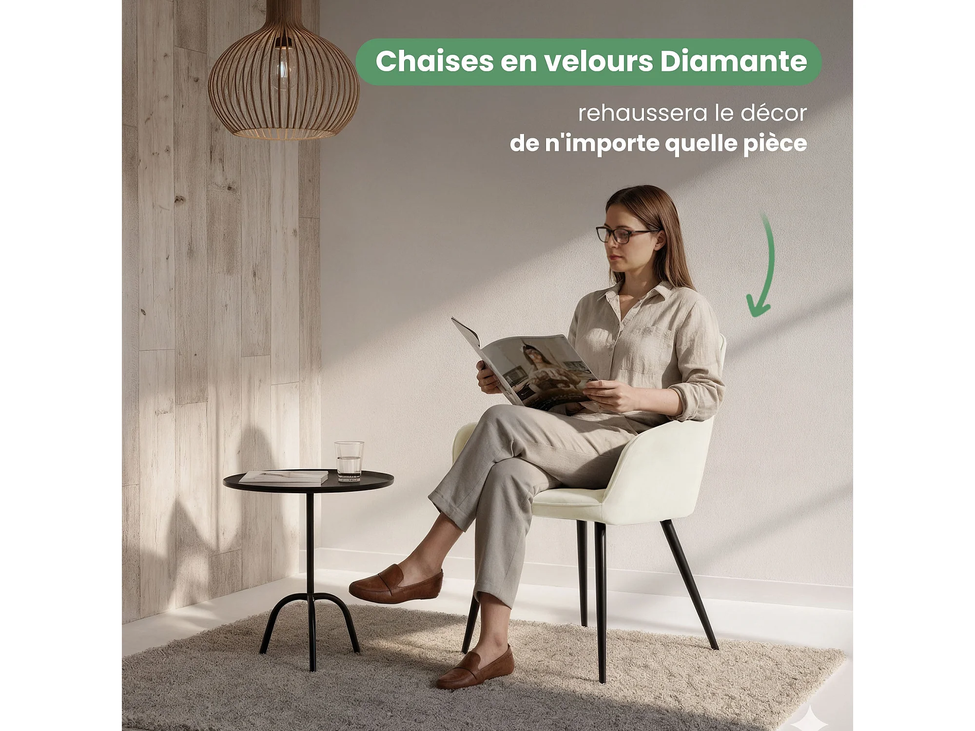 Set van 4 Eetkamerstoelen DIAMANTE met Armleuningen / Gestoffeerde Stoelen / Fluwelen Stoelen en Metalen Poten / Crème kleur met zwarte benen