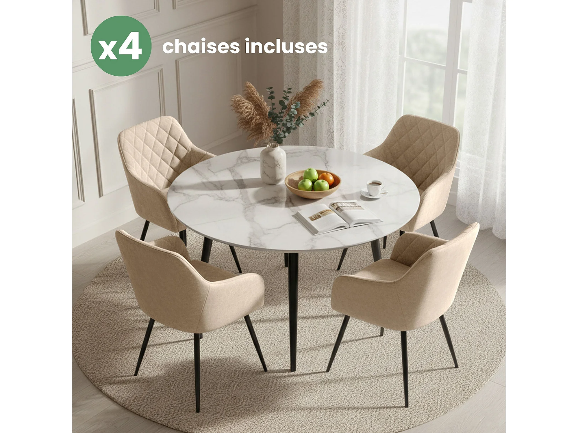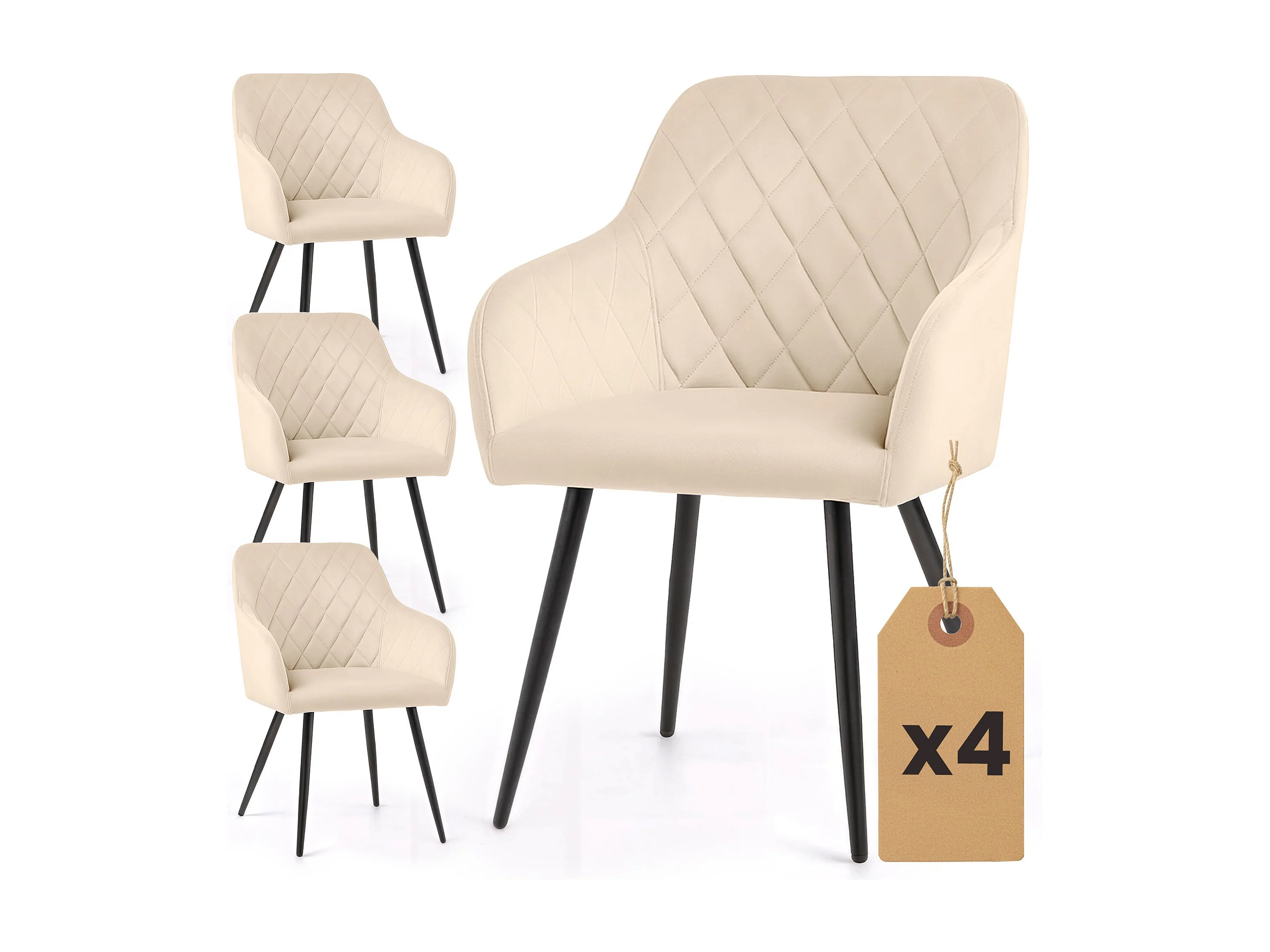 Set van 4 Eetkamerstoelen VELTO met Armleuningen / Gestoffeerde Stoelen / Fluwelen Stoelen en Metalen Poten / Beige met zwarte benen
