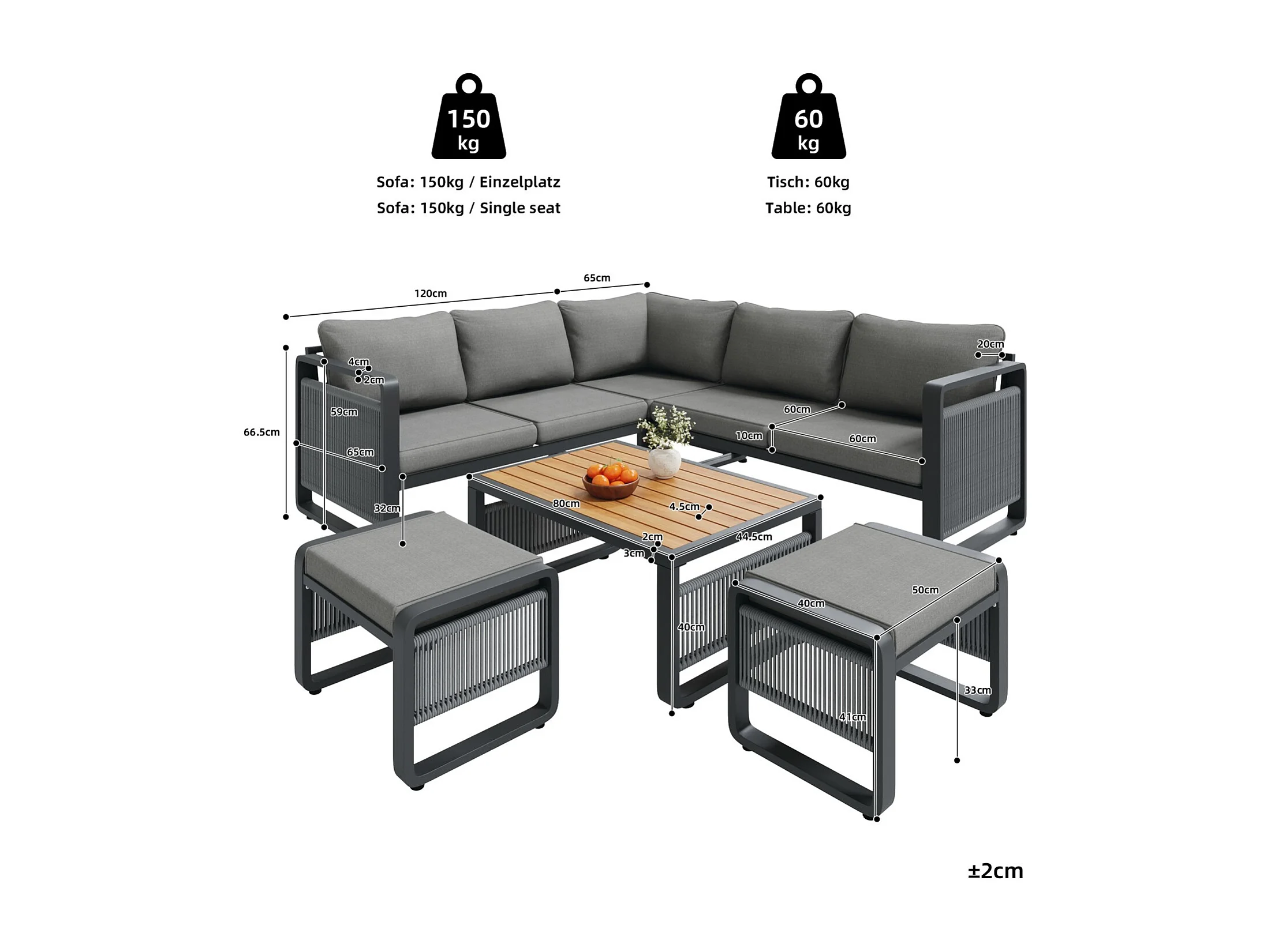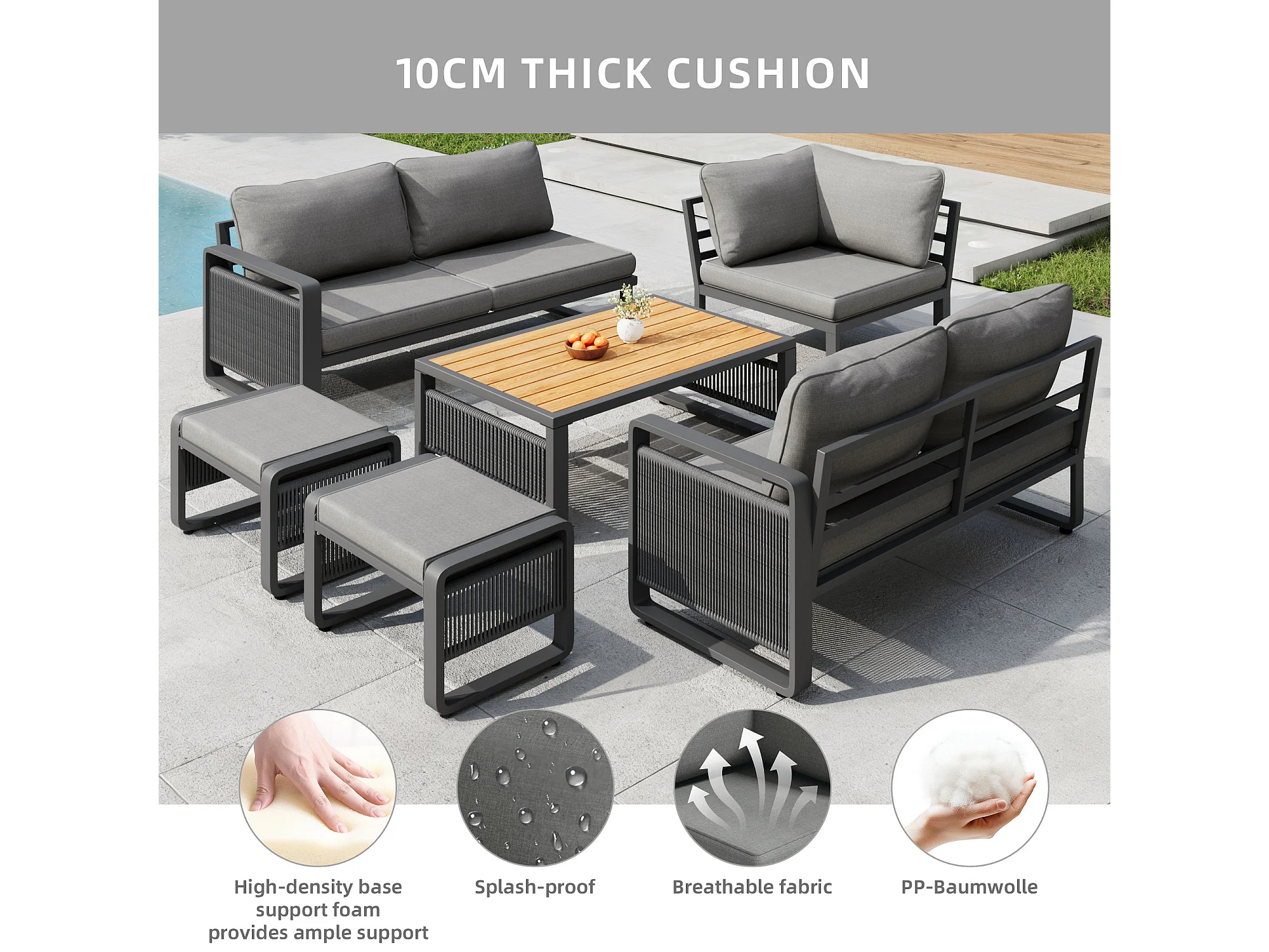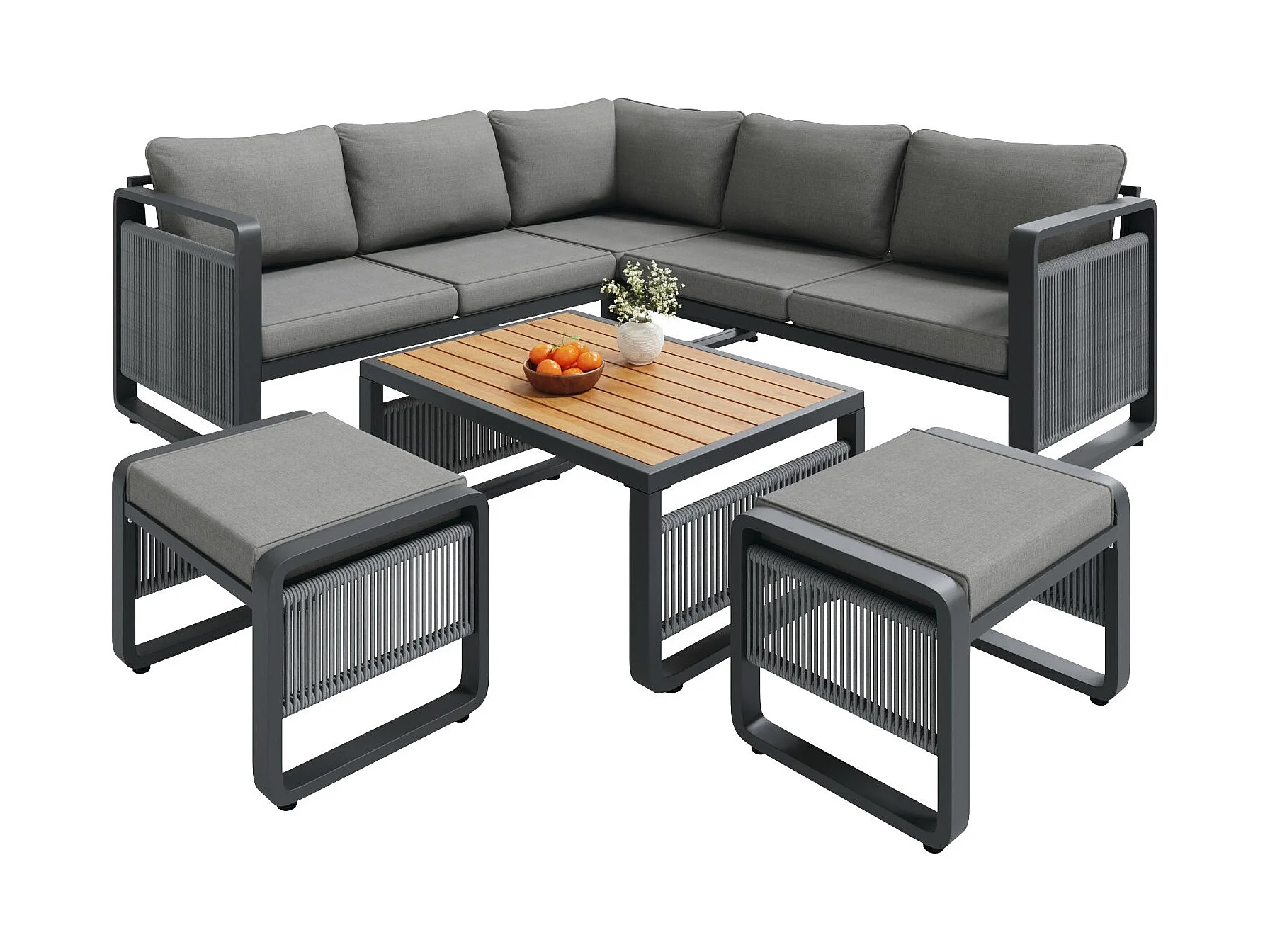 Set van 6-7 ligstoelen voor in de tuin, handgeweven touw, verstelbare voetsteunen, grijs