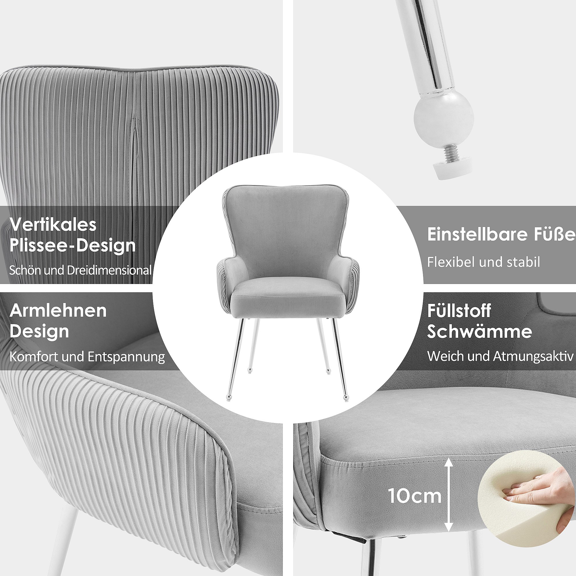 Set van 6 fluwelen stoelen - 83 x 53 x 57 cm - Vier zilveren metalen poten - met armleuningen en verstelbare voeten - Grijs