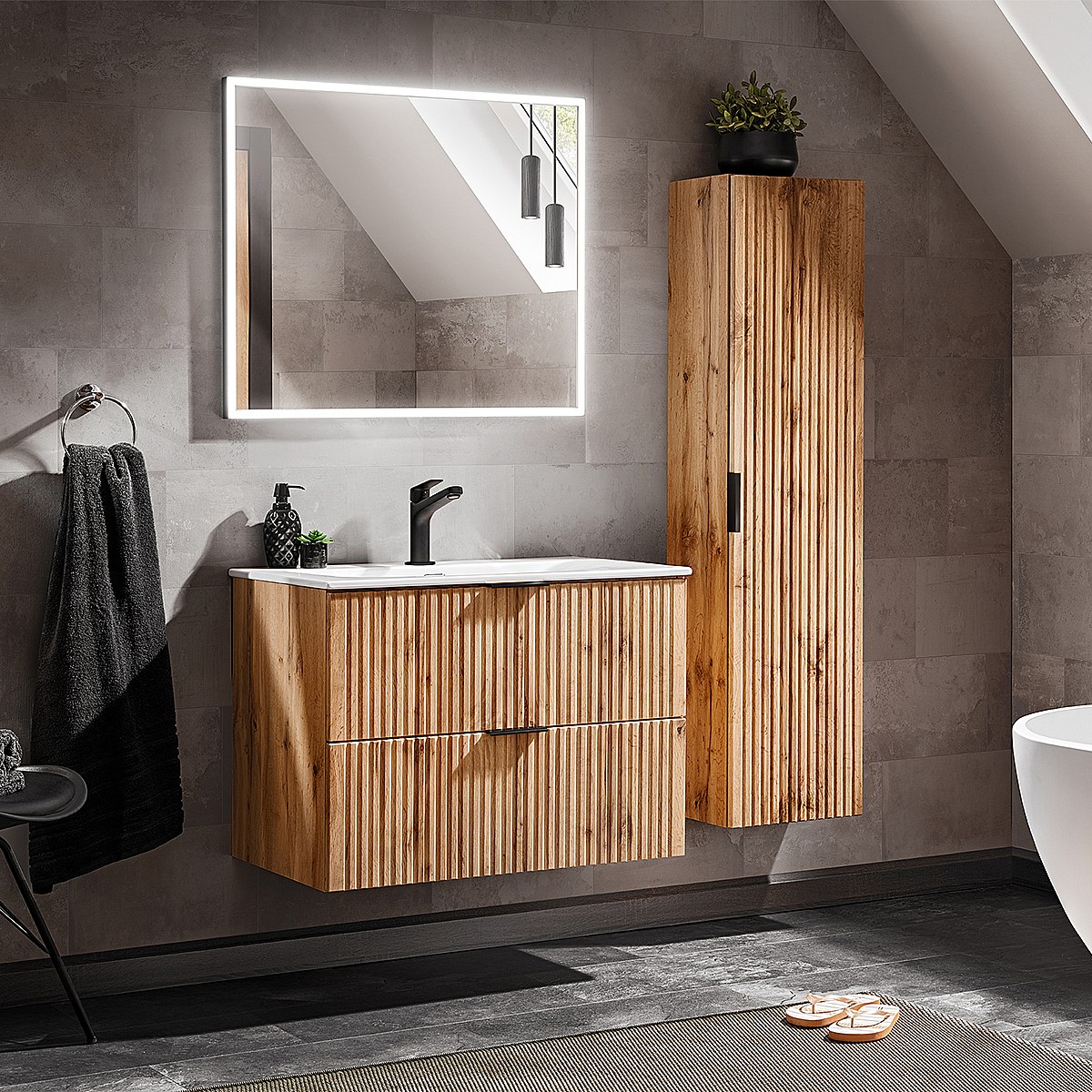 Set van 80cm enkele wastafel met LED spiegel en Adriel houten kolom