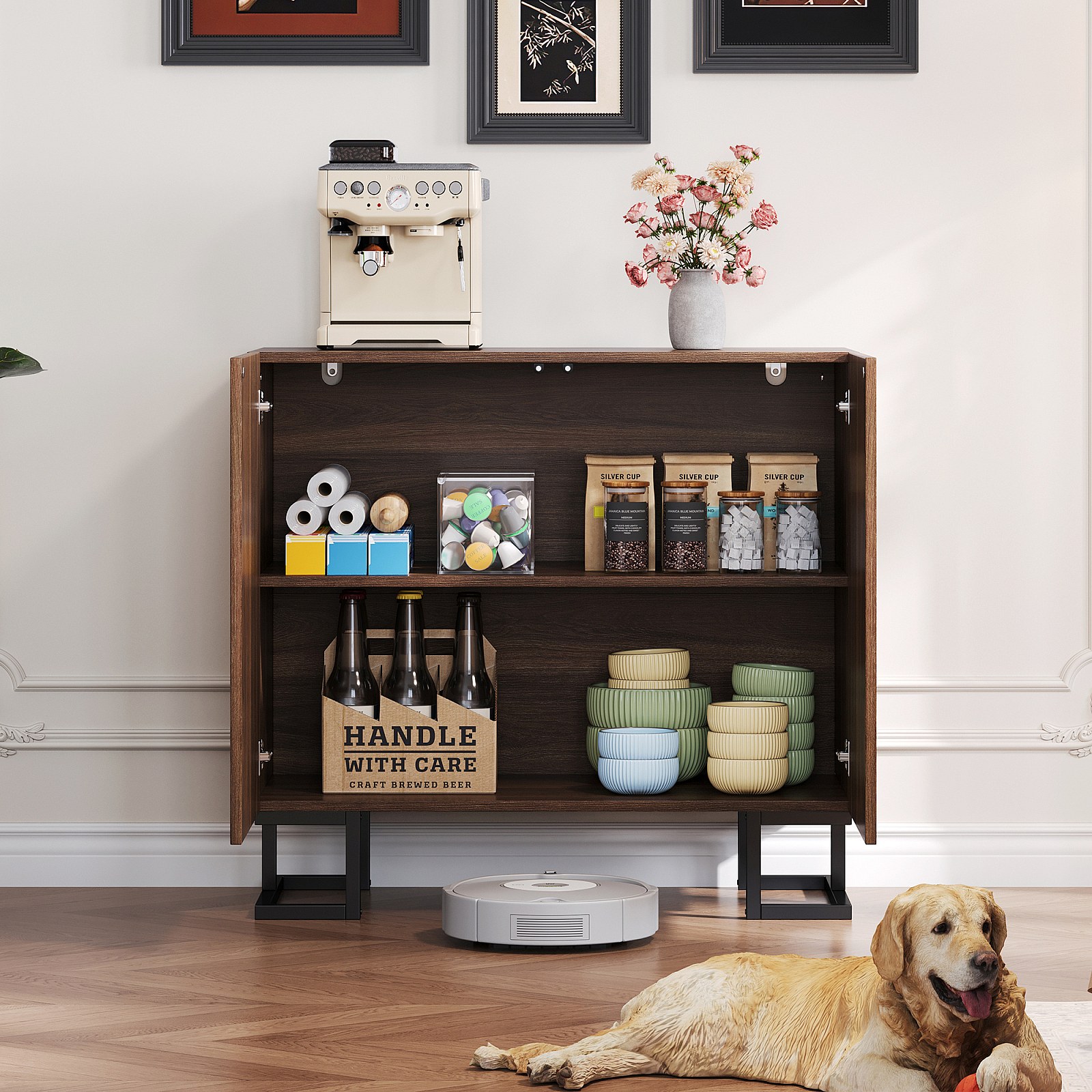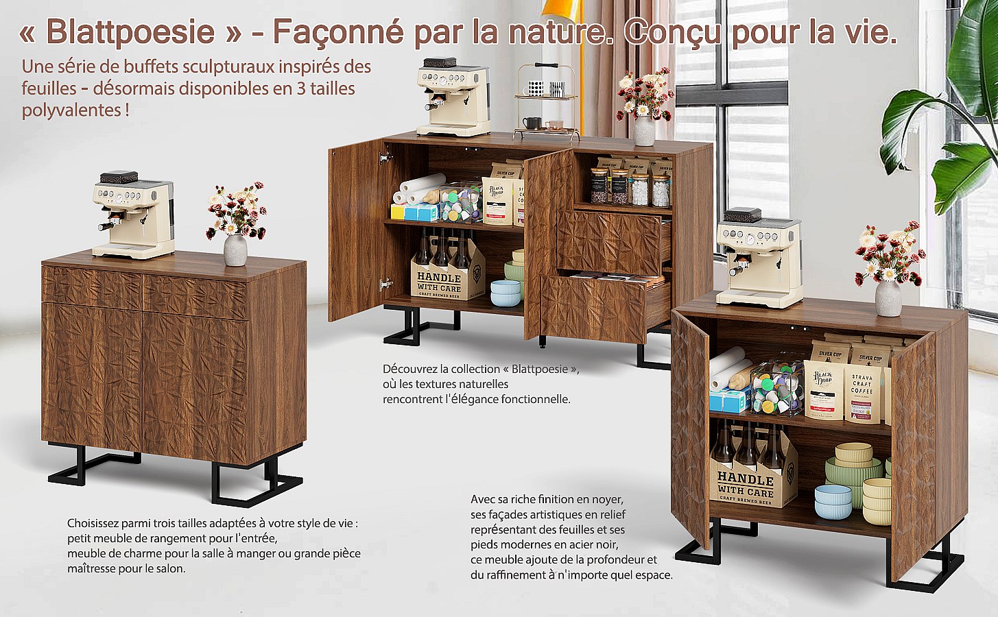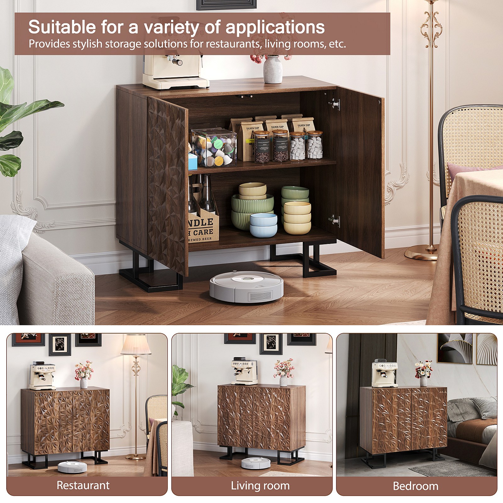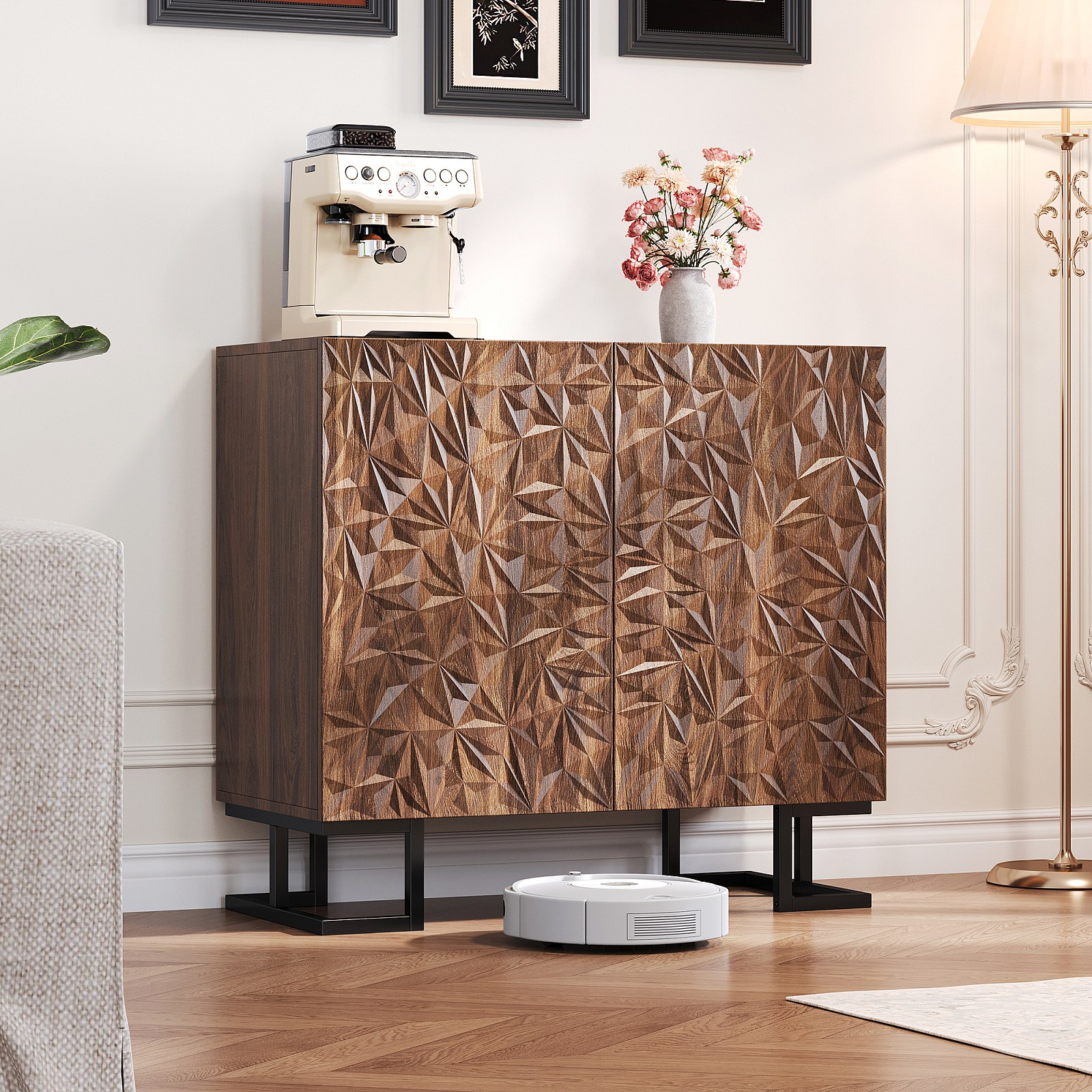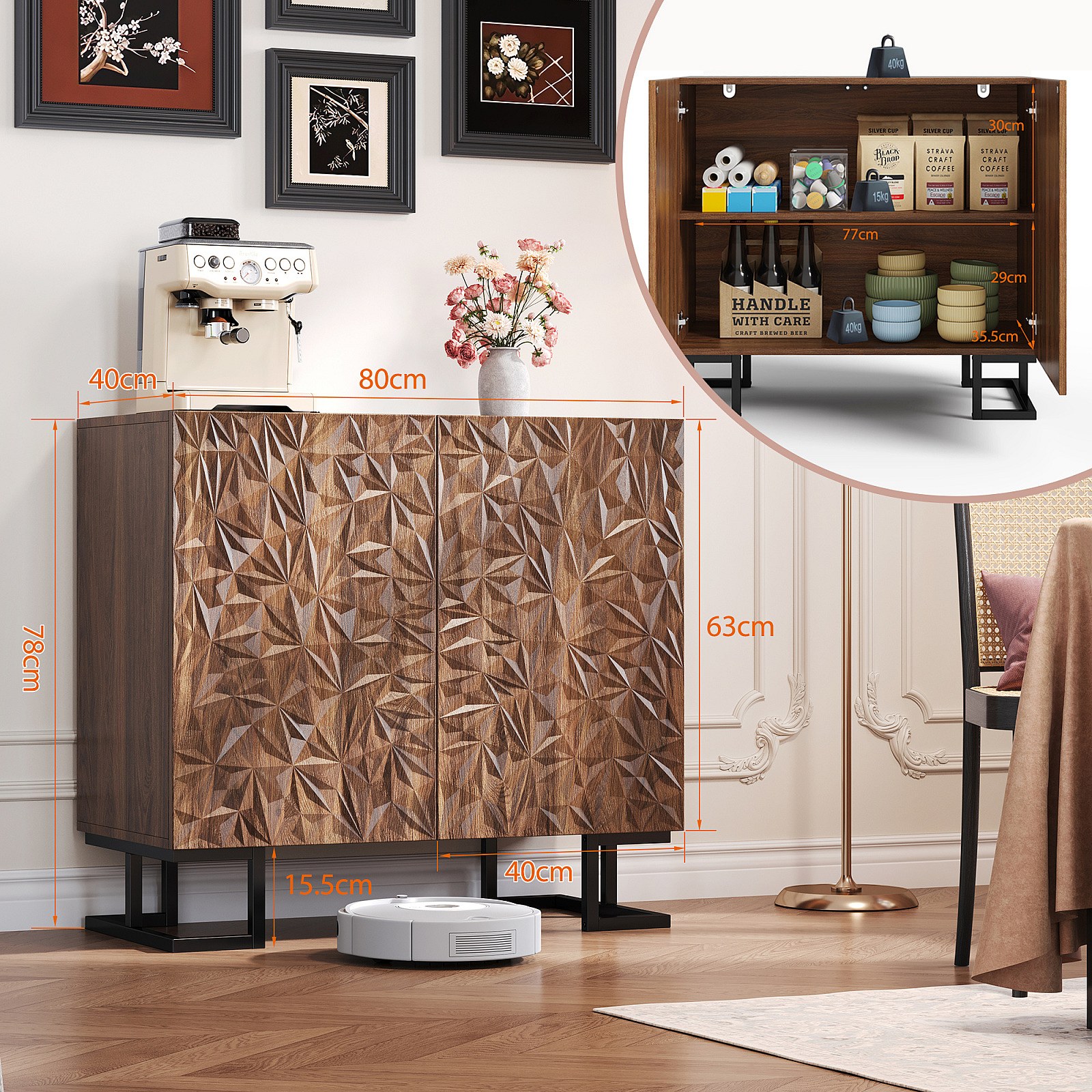 Sideboard 80×40×78 cm serie in donker notenhout met bladreliëf, Push-to-Open deuren en metalen poten – Modern design voor woonkamer en hal