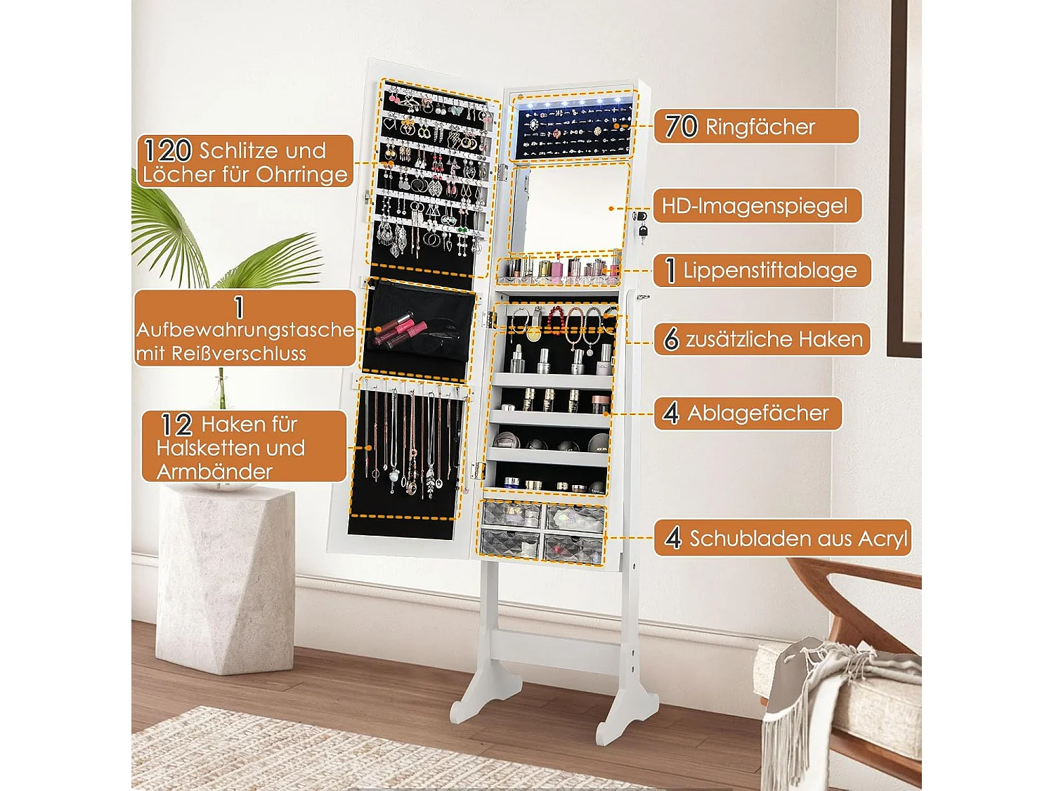JV10221WHDE Sieradenkast met spiegel sieradenspiegelkast afsluitbaar op wieltjes vrijstaand 42 x 38 x 157 cmVH32443
