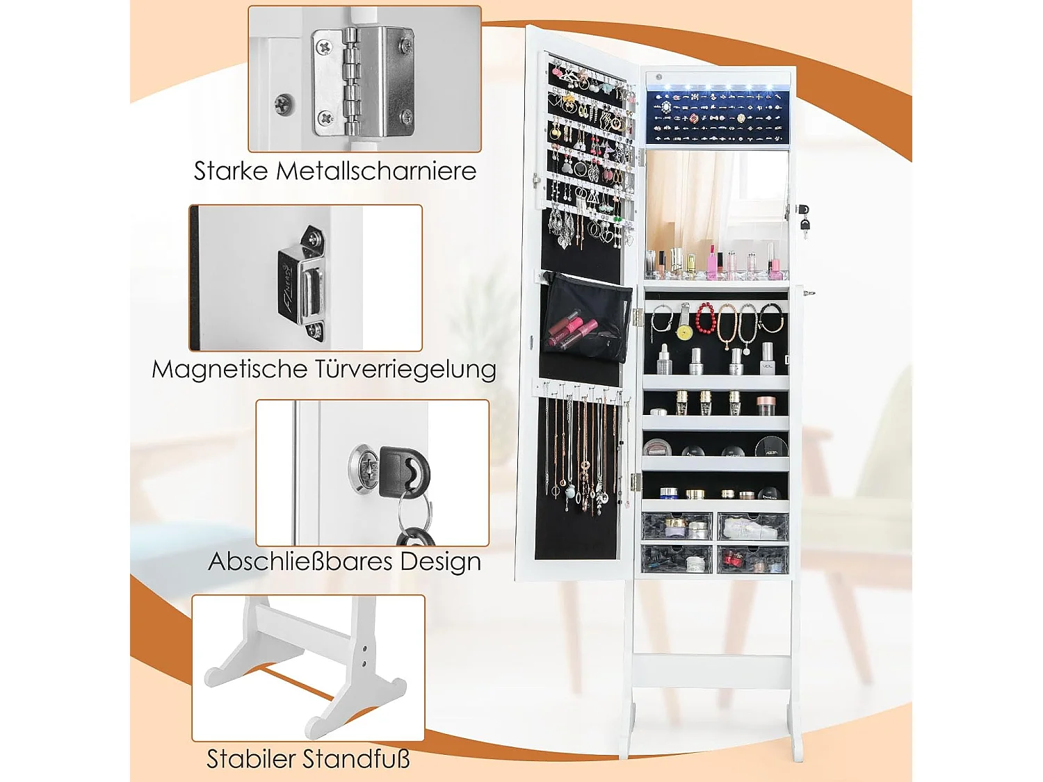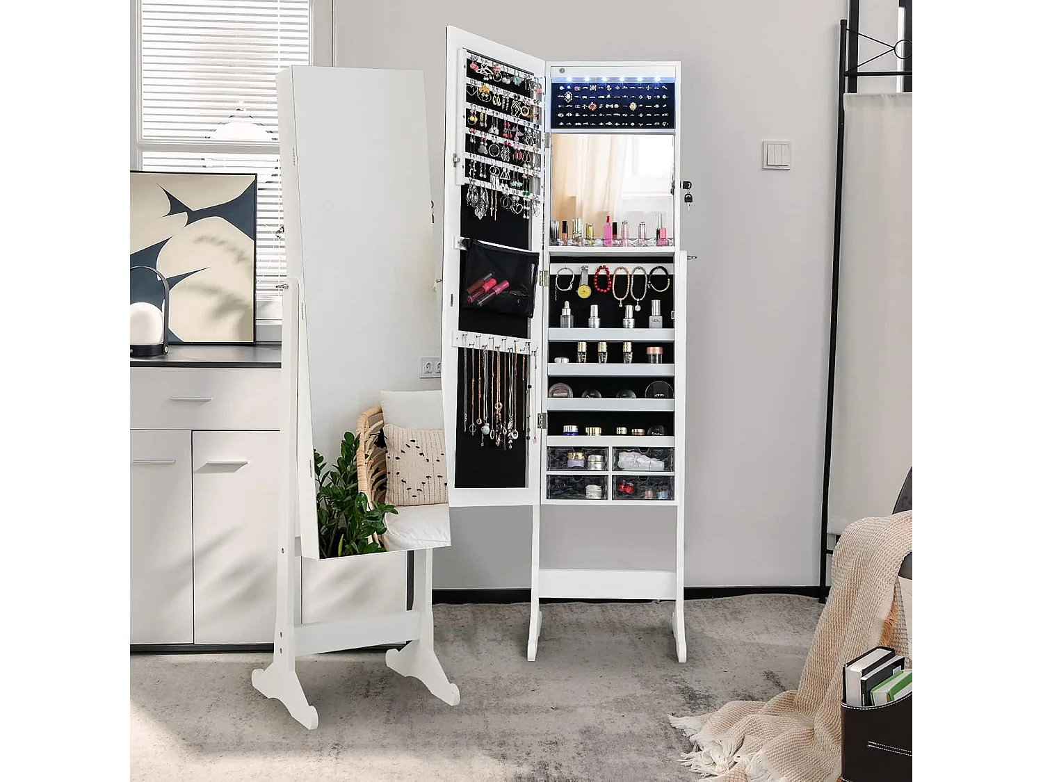Sieradenkast, staande spiegel, afsluitbaar, 2-in-1 full-body spiegel met sieradenopslag, spiegelkast met 12 leds, vrijstaand (wit)VH32203