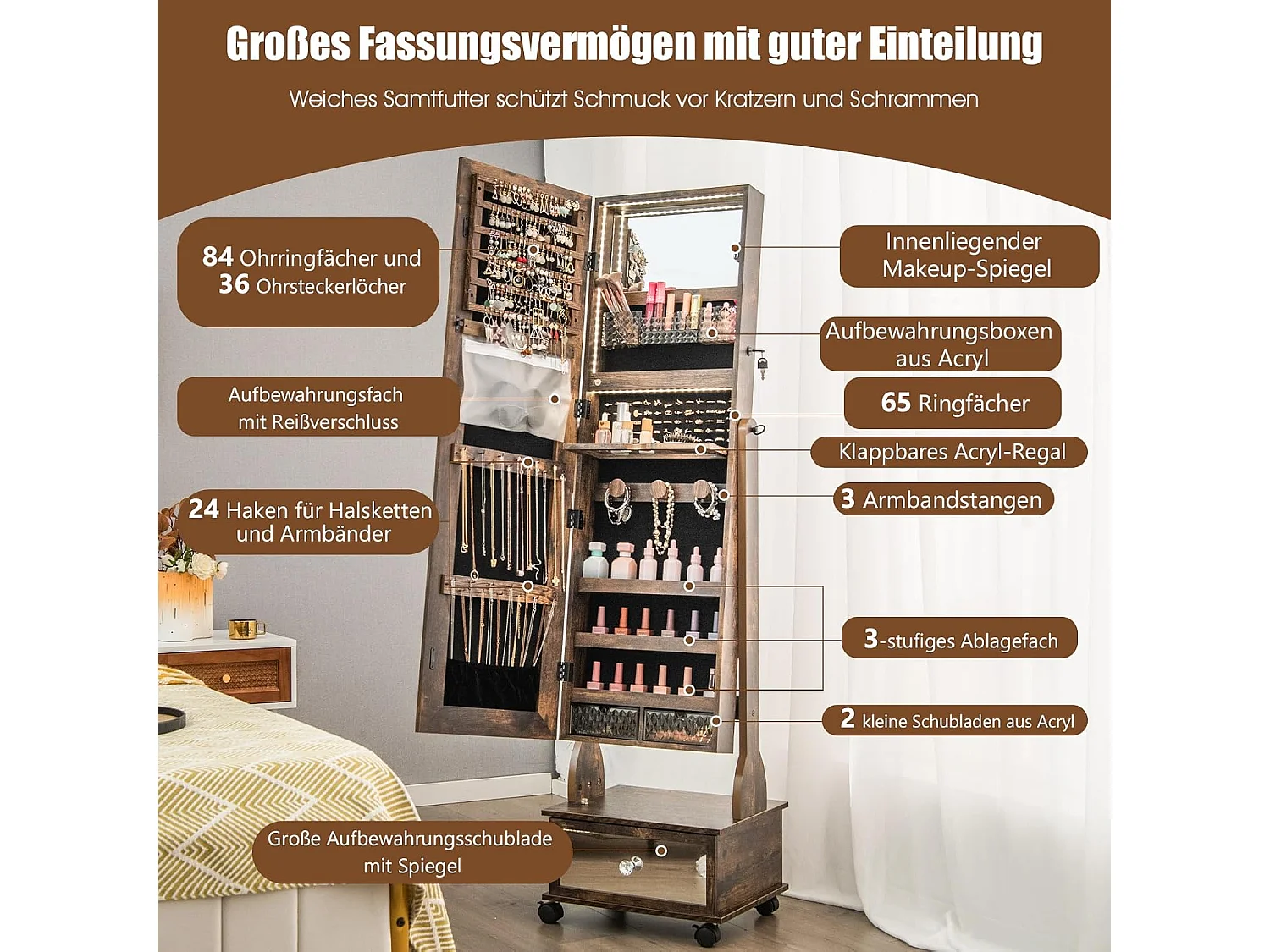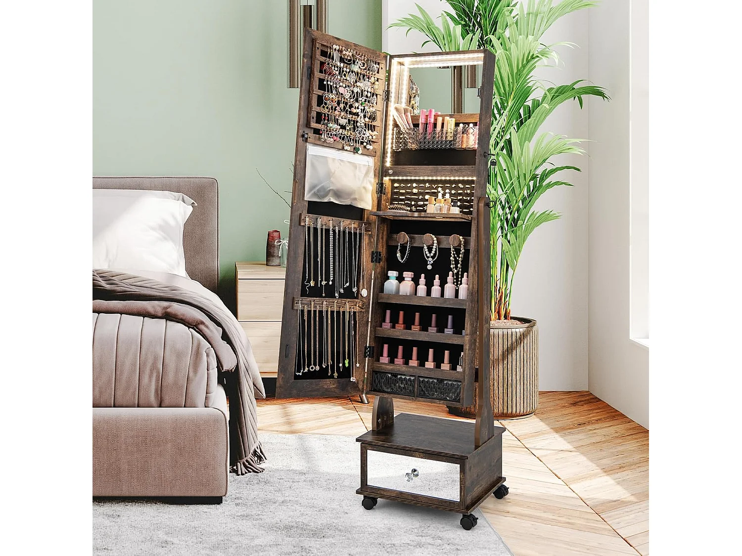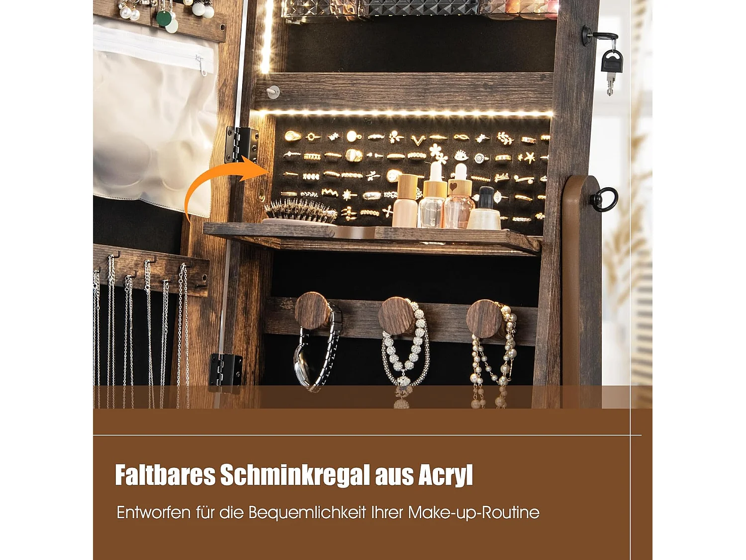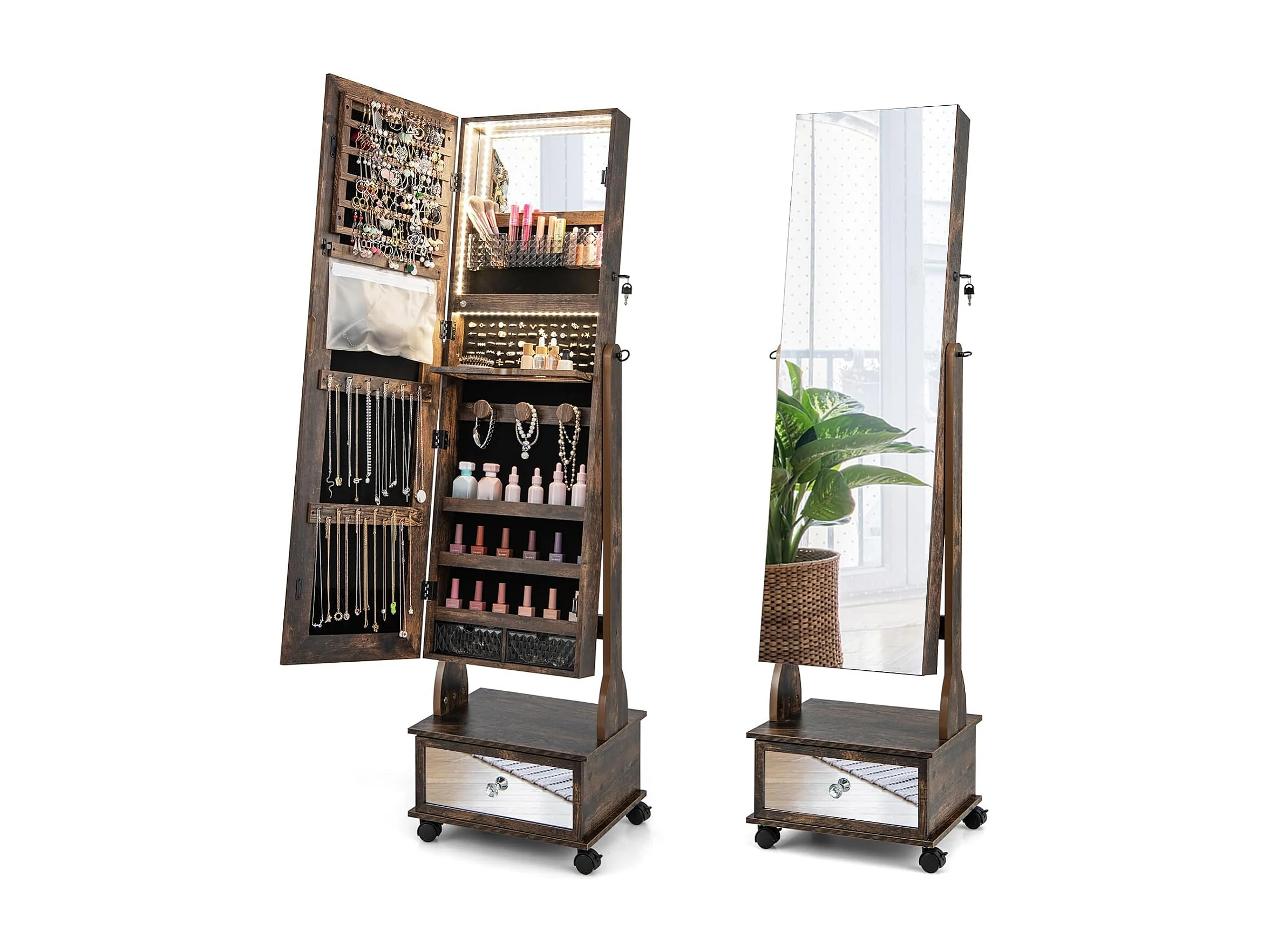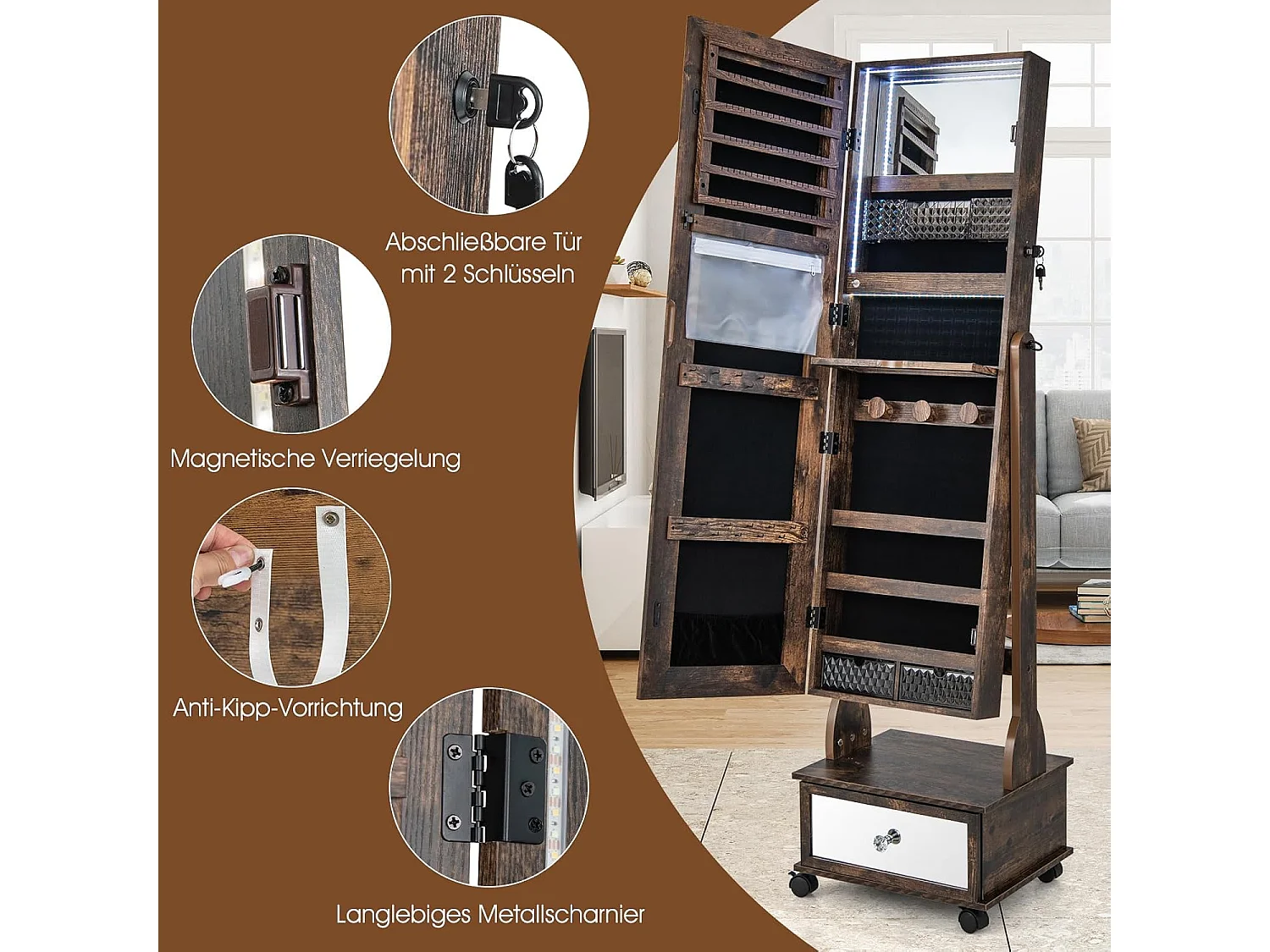 Sieradenkast met 3 spiegels, verstelbare sieradenspiegel met lade,spiegelkast, sieraden, afsluitbaar,oorbellen, make-up, 42 x 35 x 159 cm (rustiek bruin)VH33455