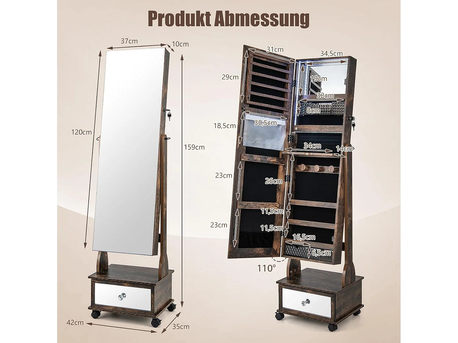 Sieradenkast met 3 spiegels, verstelbare sieradenspiegel met lade, wielen en lampen, spiegelkast,voor kettingen,make-up, 42 x 35 x 159 cm (rustiek bruin)VH33455