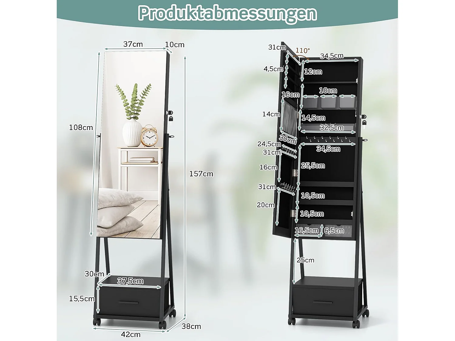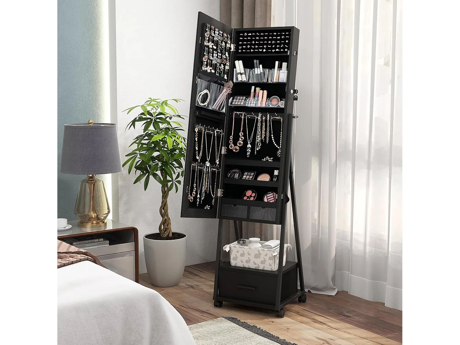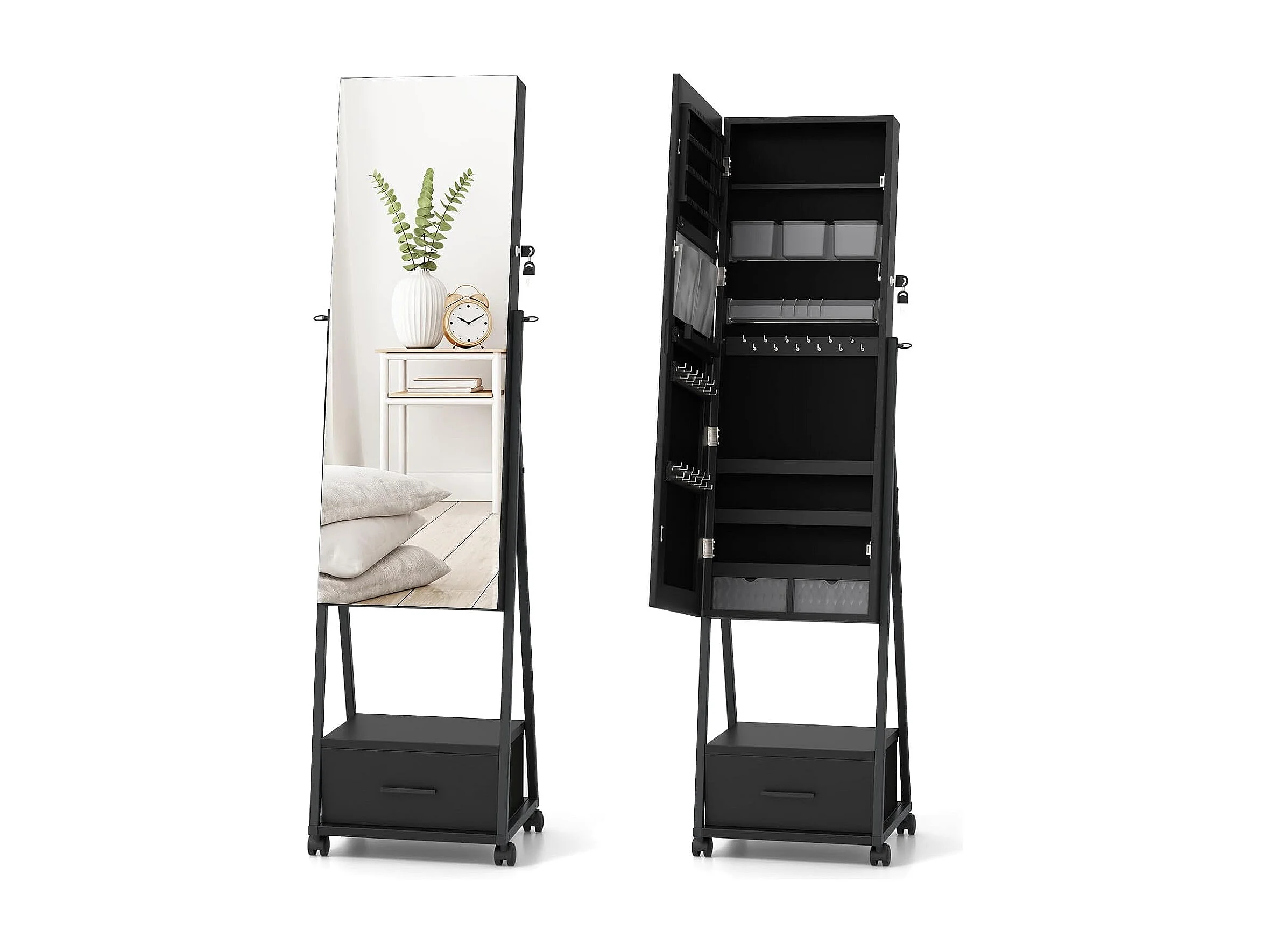 Sieradenkast met spiegel, sieradenspiegelkast met lade, op wieltjes, afsluitbaar, vrijstaand, 42 x 38 x 157 cm (zwart)VH32443