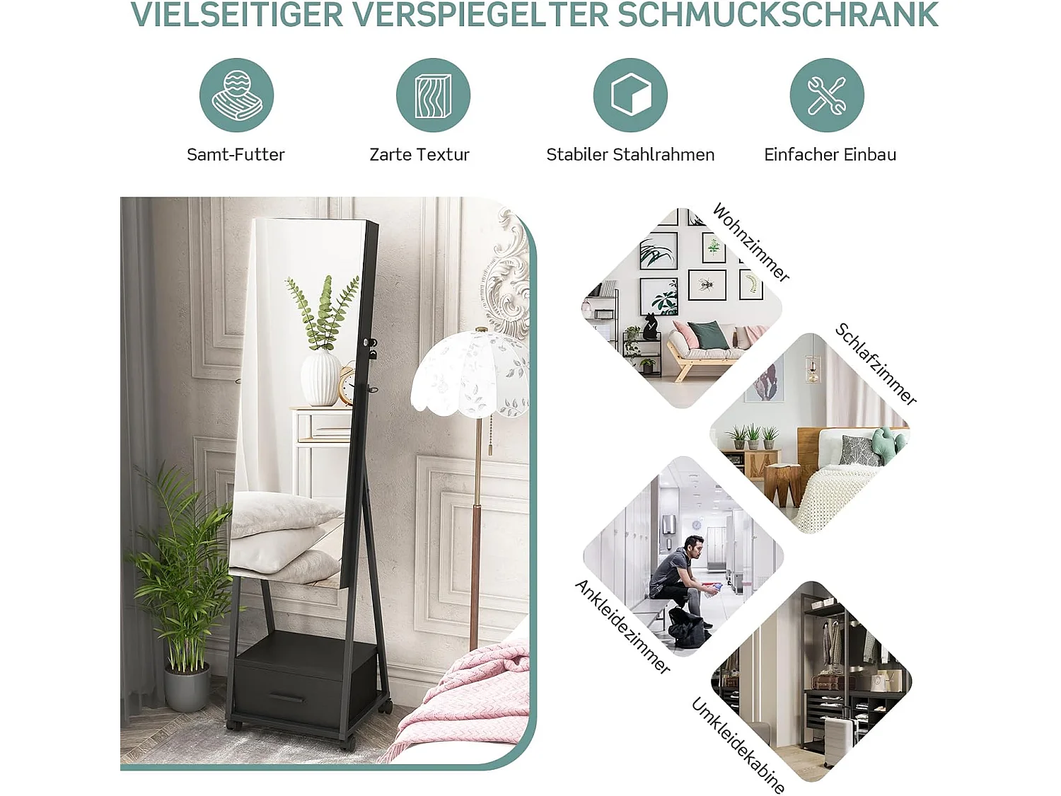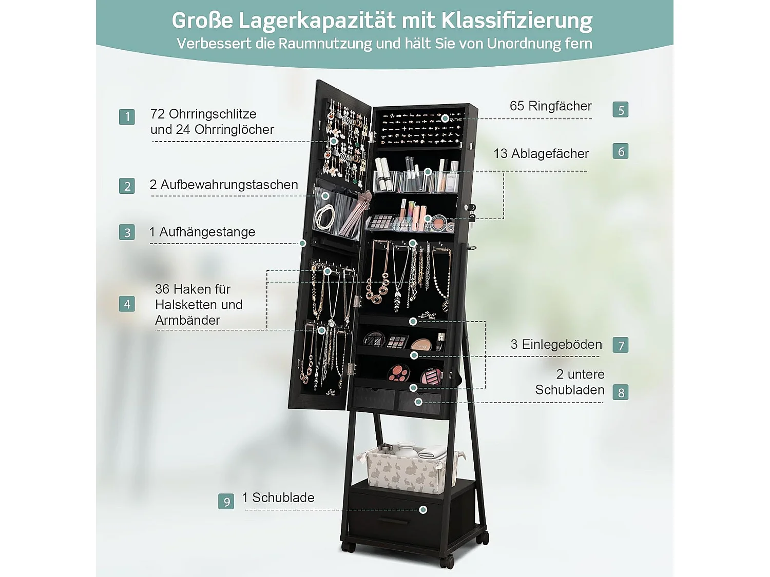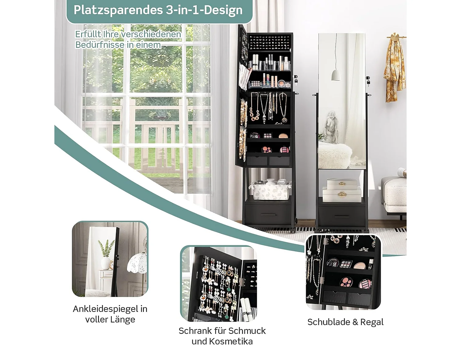 Sieradenkast met spiegel, sieradenspiegelkast met lade, op wieltjes, afsluitbaar, vrijstaand, 42 x 38 x 157 cm (zwart)VH32443