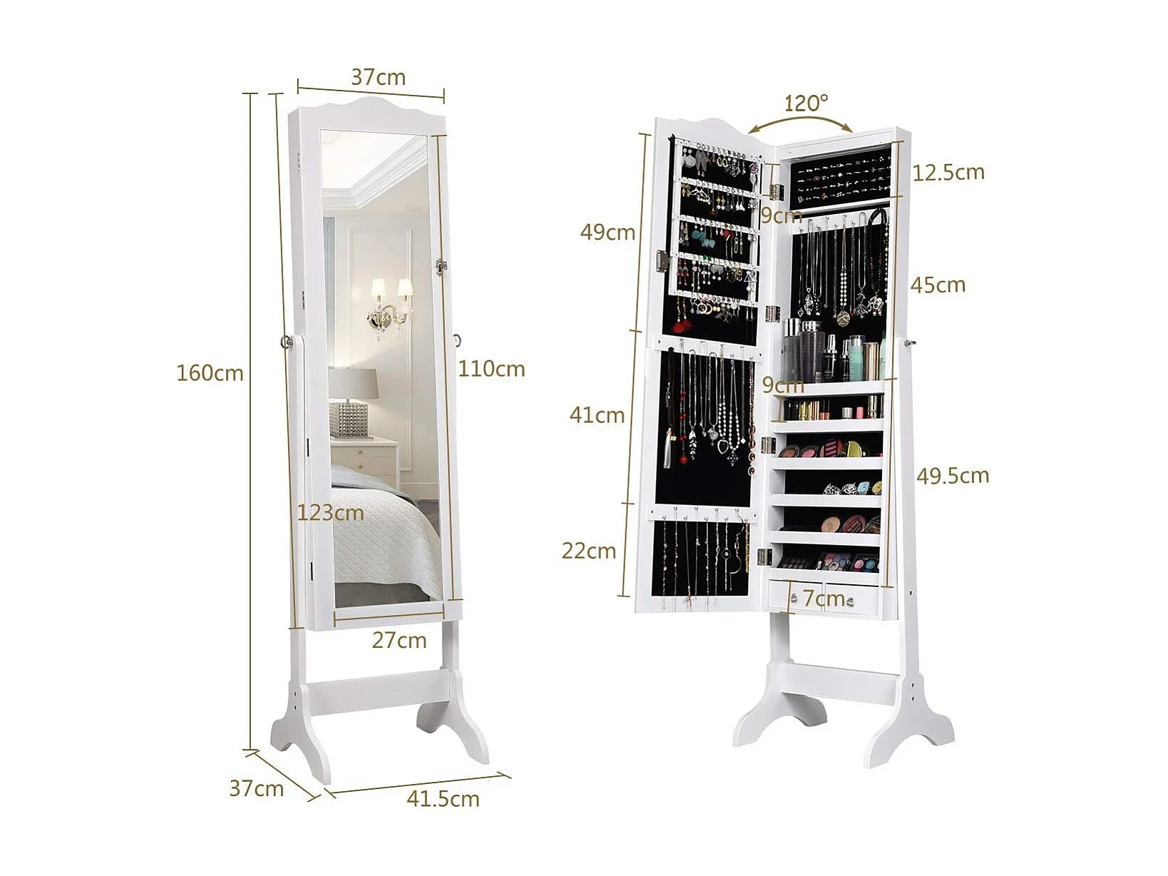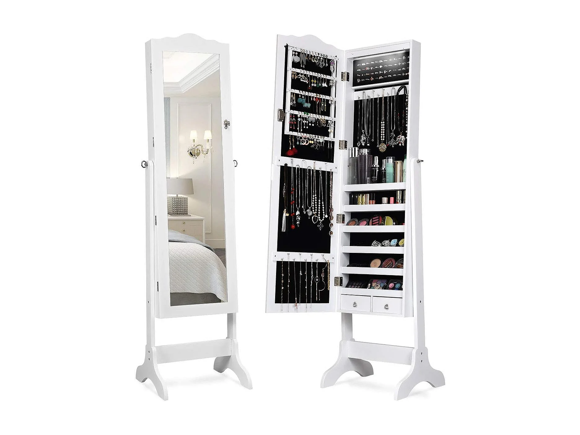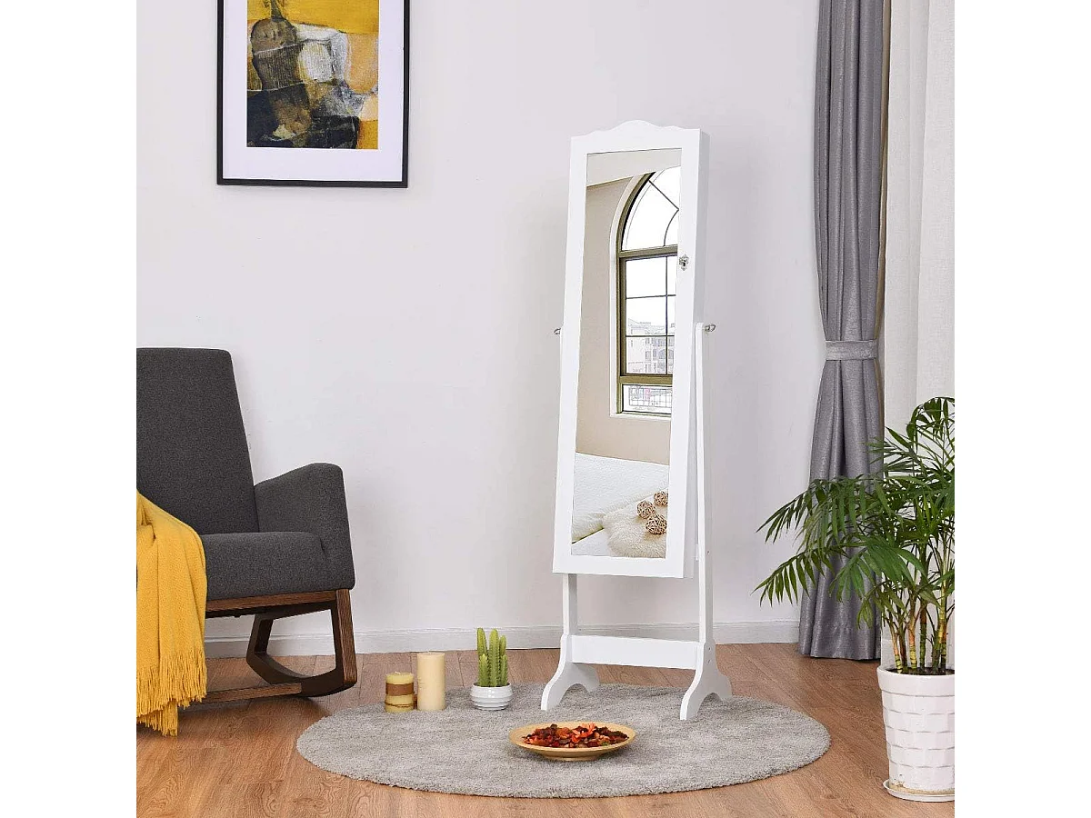 Staande sieradenkast, staande spiegel met 3-kleurige ledlampen, afsluitbare sieradenopslag met sieradenrek, legplankenVH33247