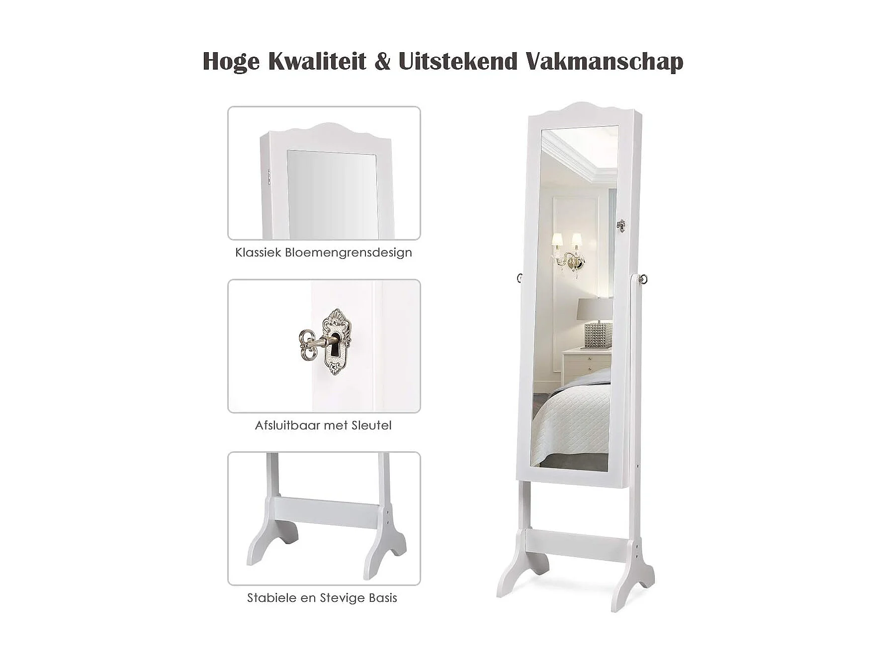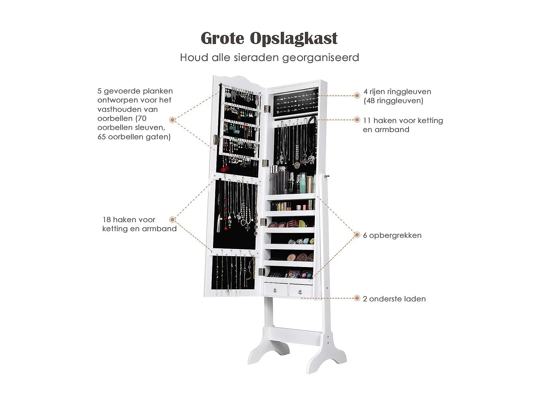 Sieradenkast, sieraden organisator met spiegeldeur over de volle lengte, afsluitbare vrijstaande sieradenkast met 14 LED-lampen, grote opbergruimte (Wit)VH32993