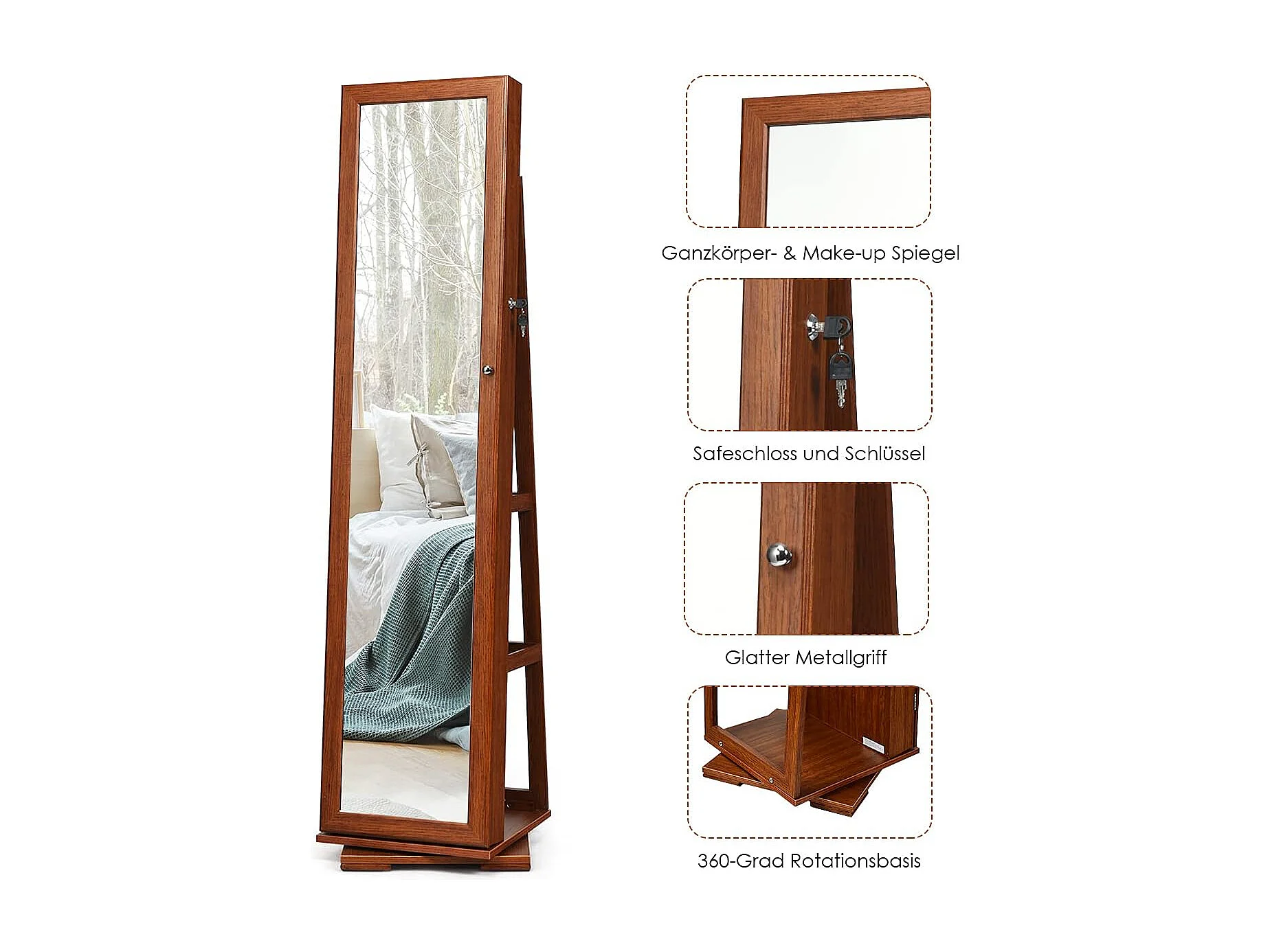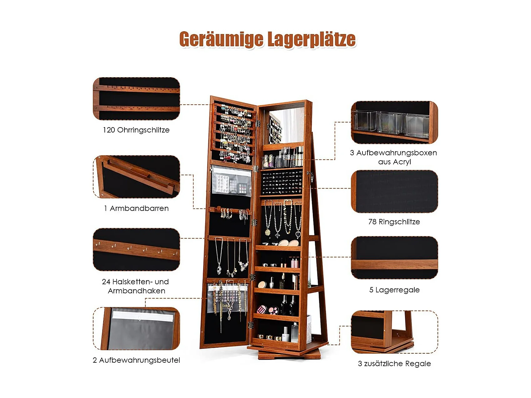 Sieradenkast met led, spiegelkast, 360 graden draaibaar, met frameloze full-body spiegel, sieradenorganizer afsluitbaar, sieradenopslag (donkerbruin)VH32652