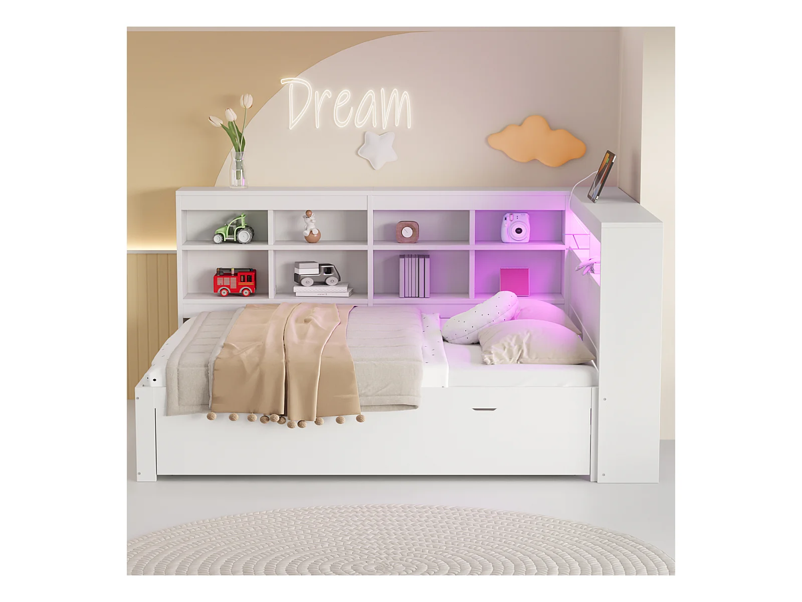 Slaapbank 140x200 cm in wit massief hout – XXL lades, LED, USB-aansluiting, planken en grote opbergruimtes