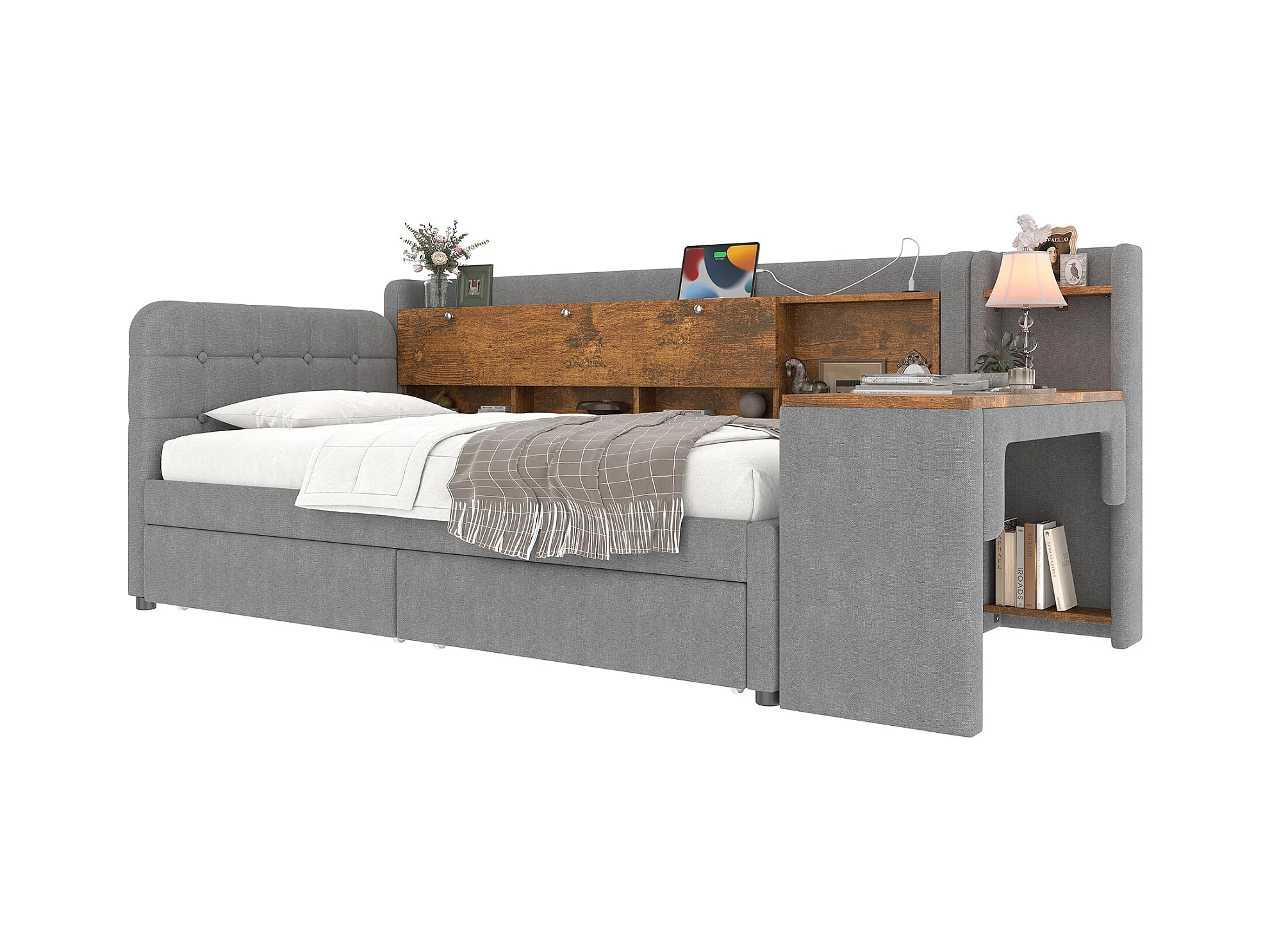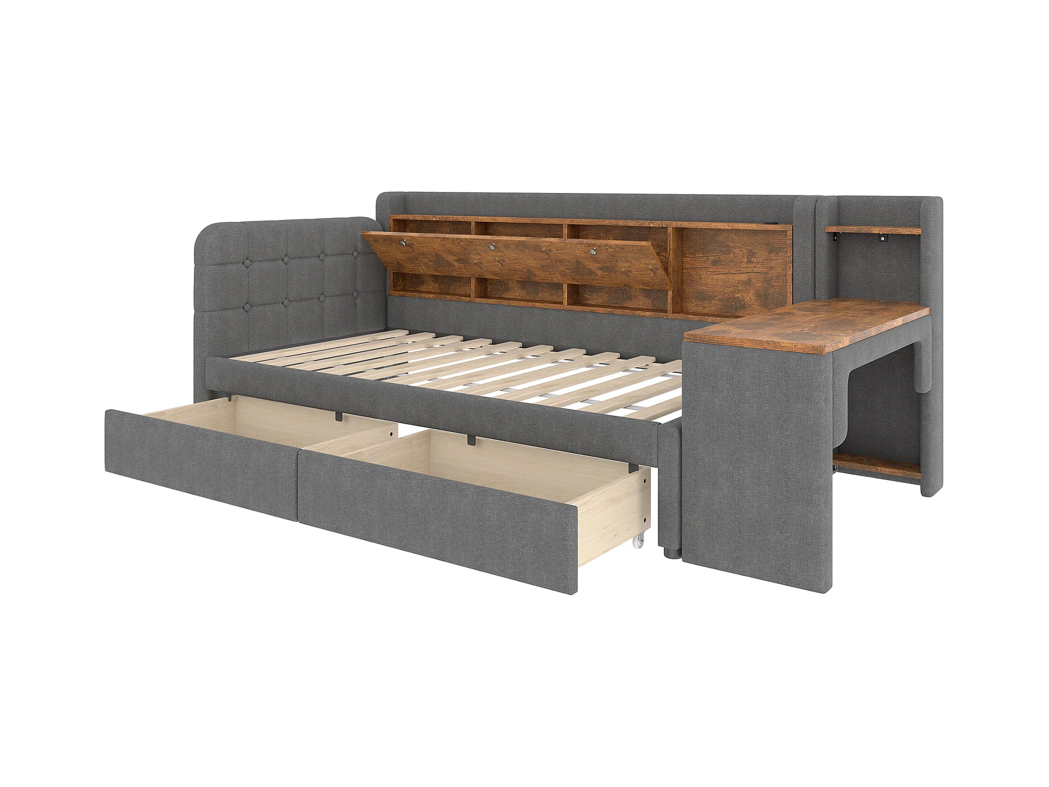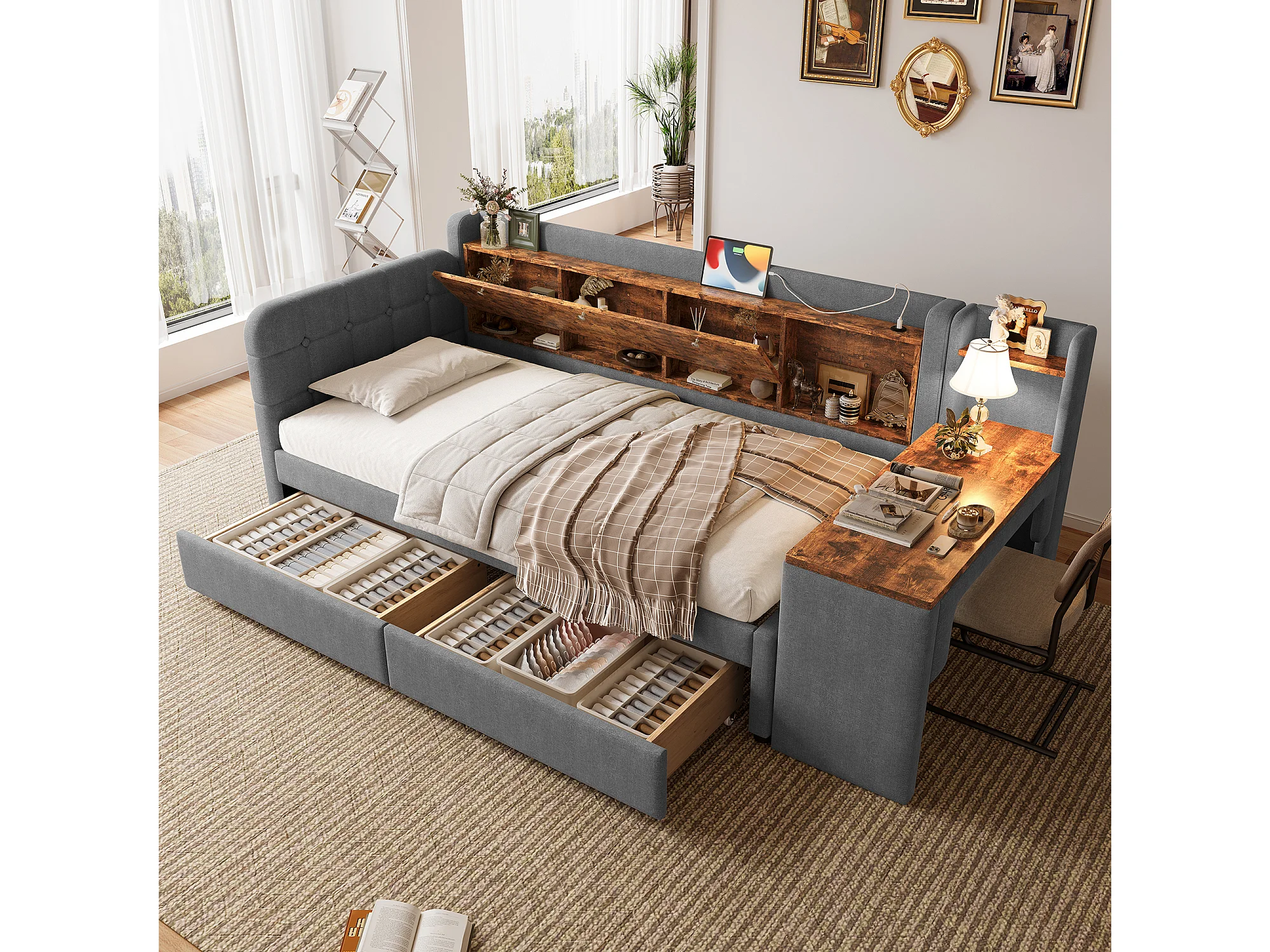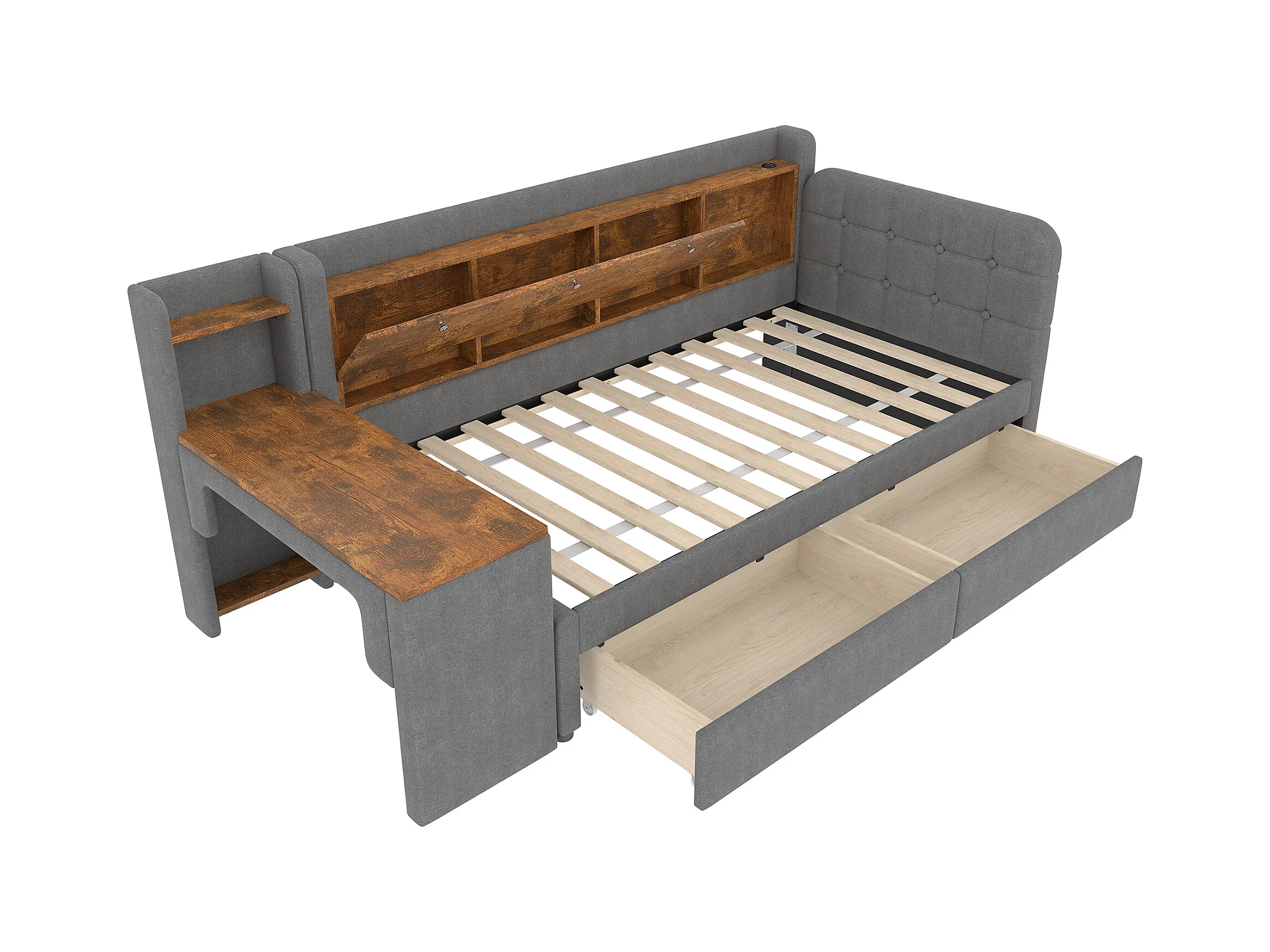 Slaapbank 90x200 cm, grijs linnen, volwassen bed met bureau en 2 lades, USB-aansluiting - zonder matras
