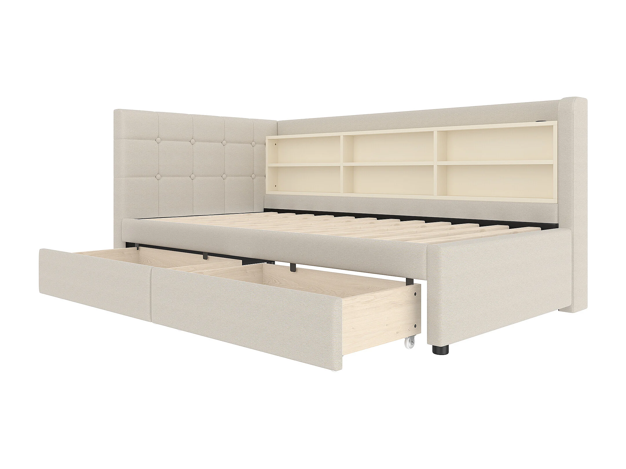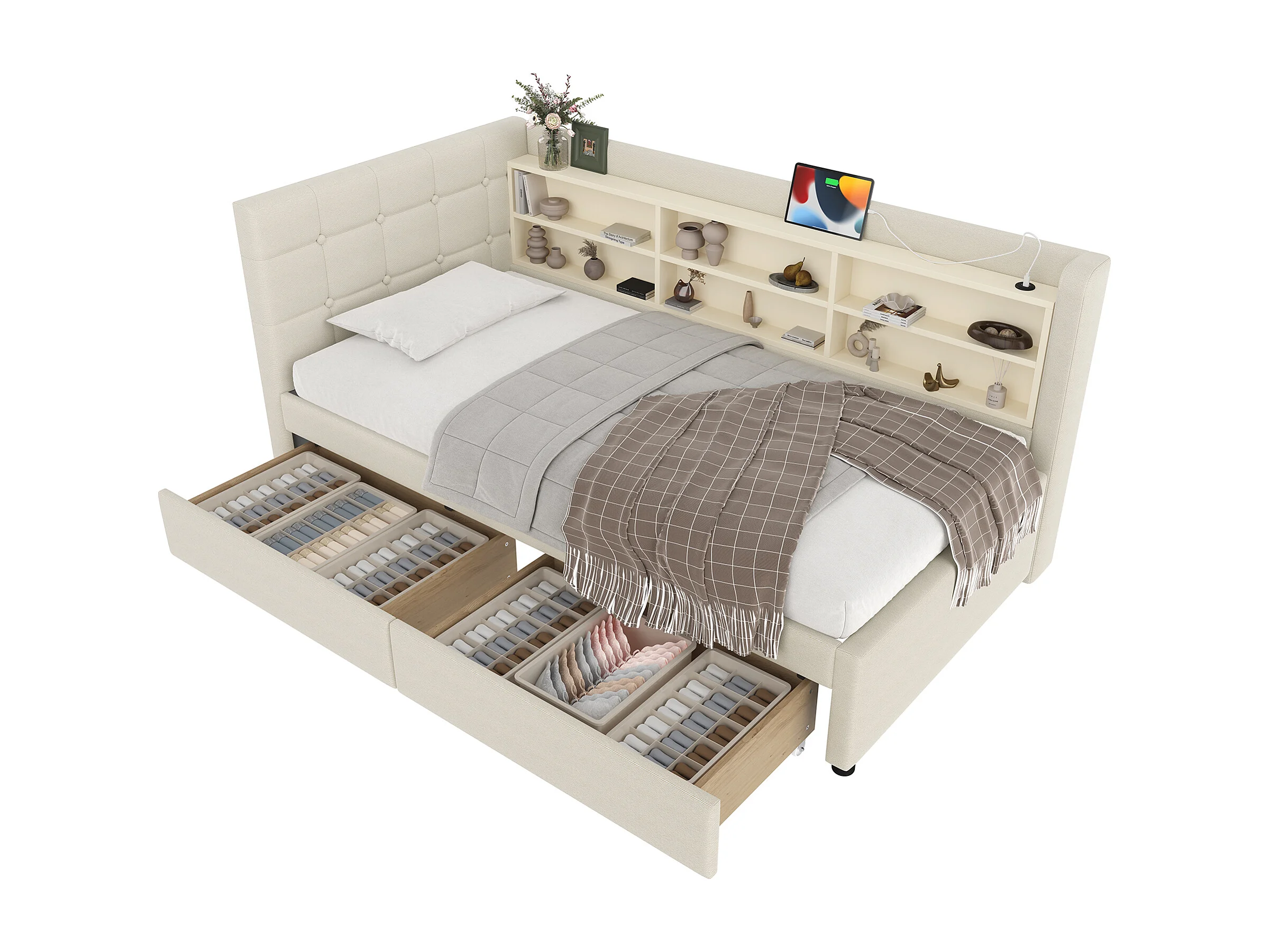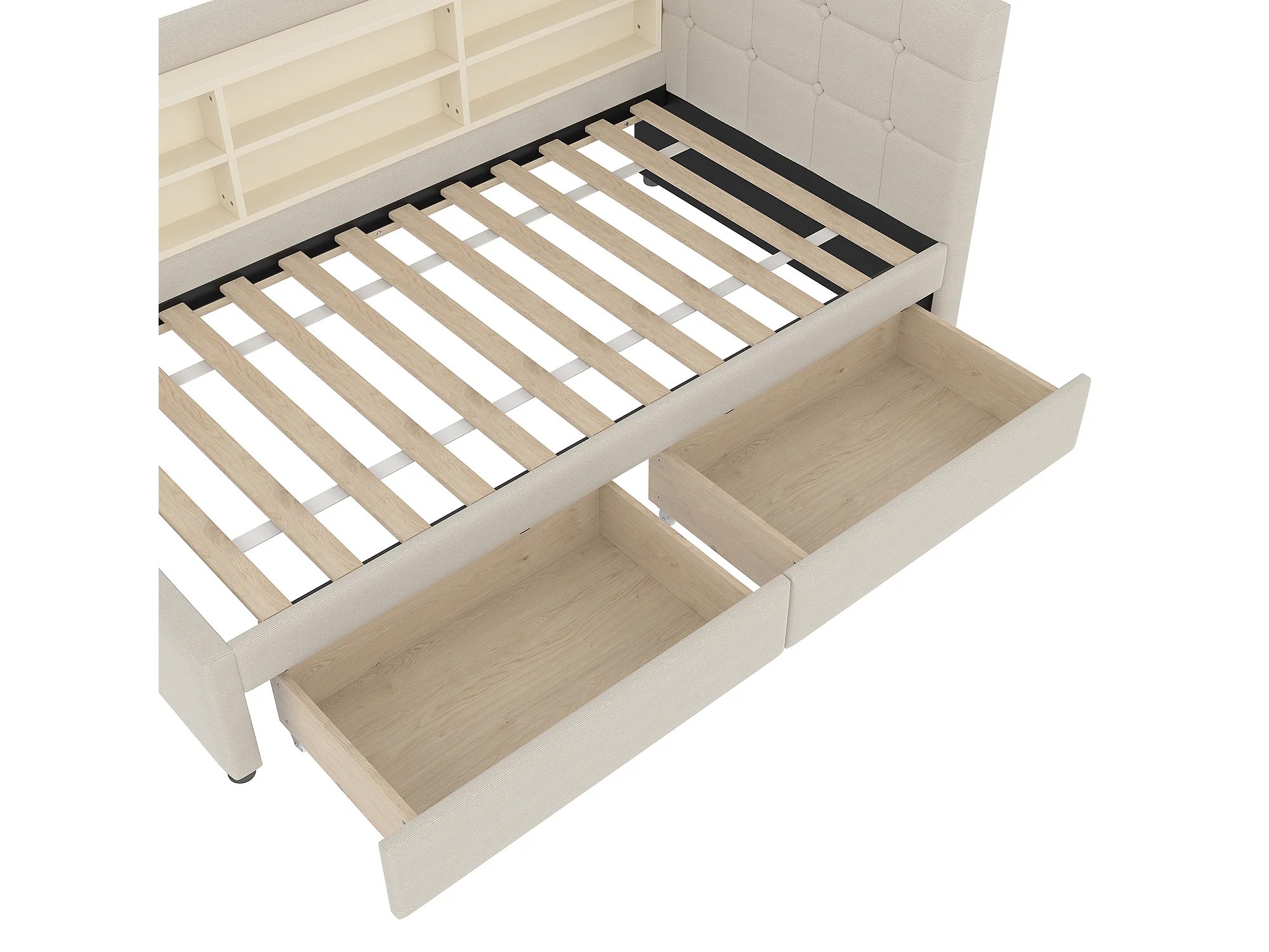Slaapbank 90×200 cm - met 2 laden - USB + Type-C aansluiting - met opbergvak - linnen - beige (matras niet inbegrepen)