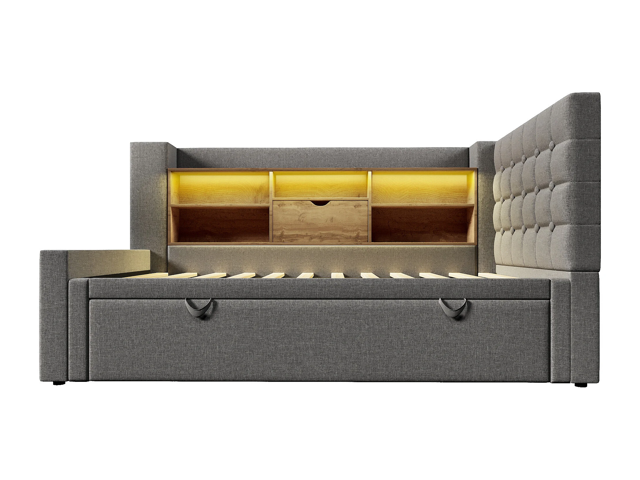 Slaapbank 90x200cm - met uitschuifbaar bed - met LED-verlichting en opbergruimte - met USB - linnen stof - grijs​ (matras niet inbegrepen)