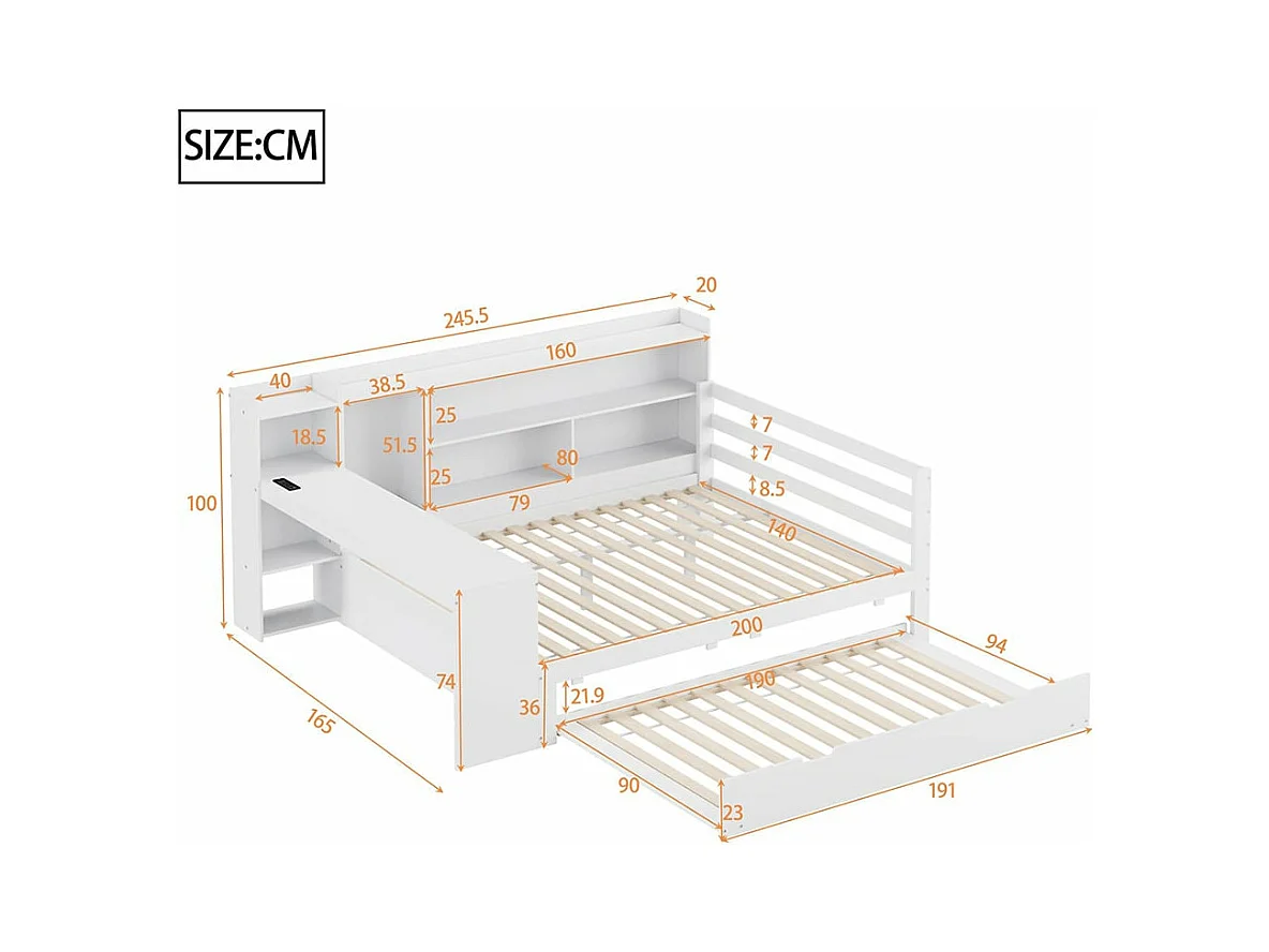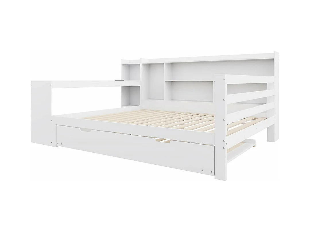 Slaapbank in massief hout 140*200 cm, met bureau, legplanken, opbergvakken, met stopcontacten, onderschuifbed, wit