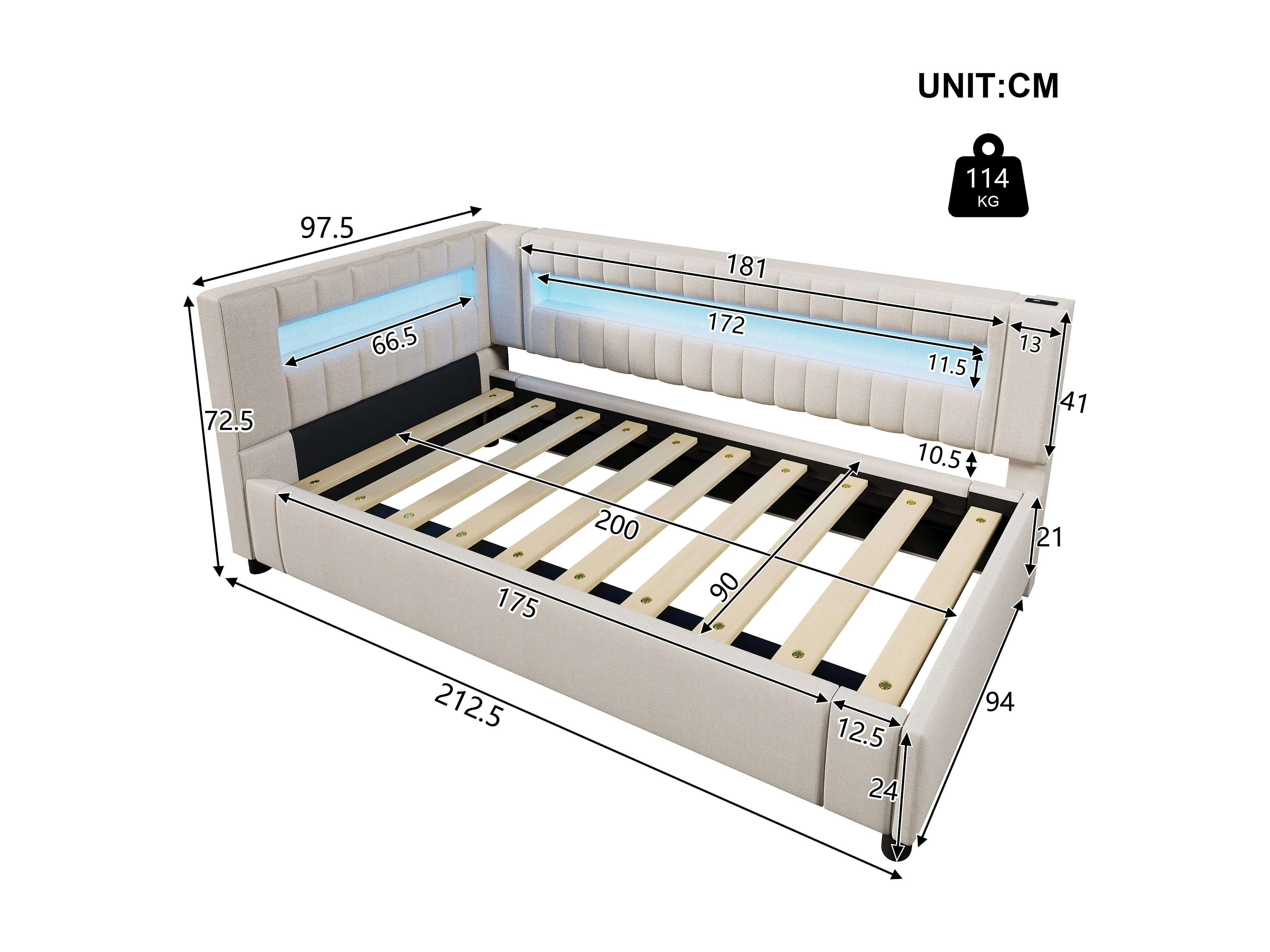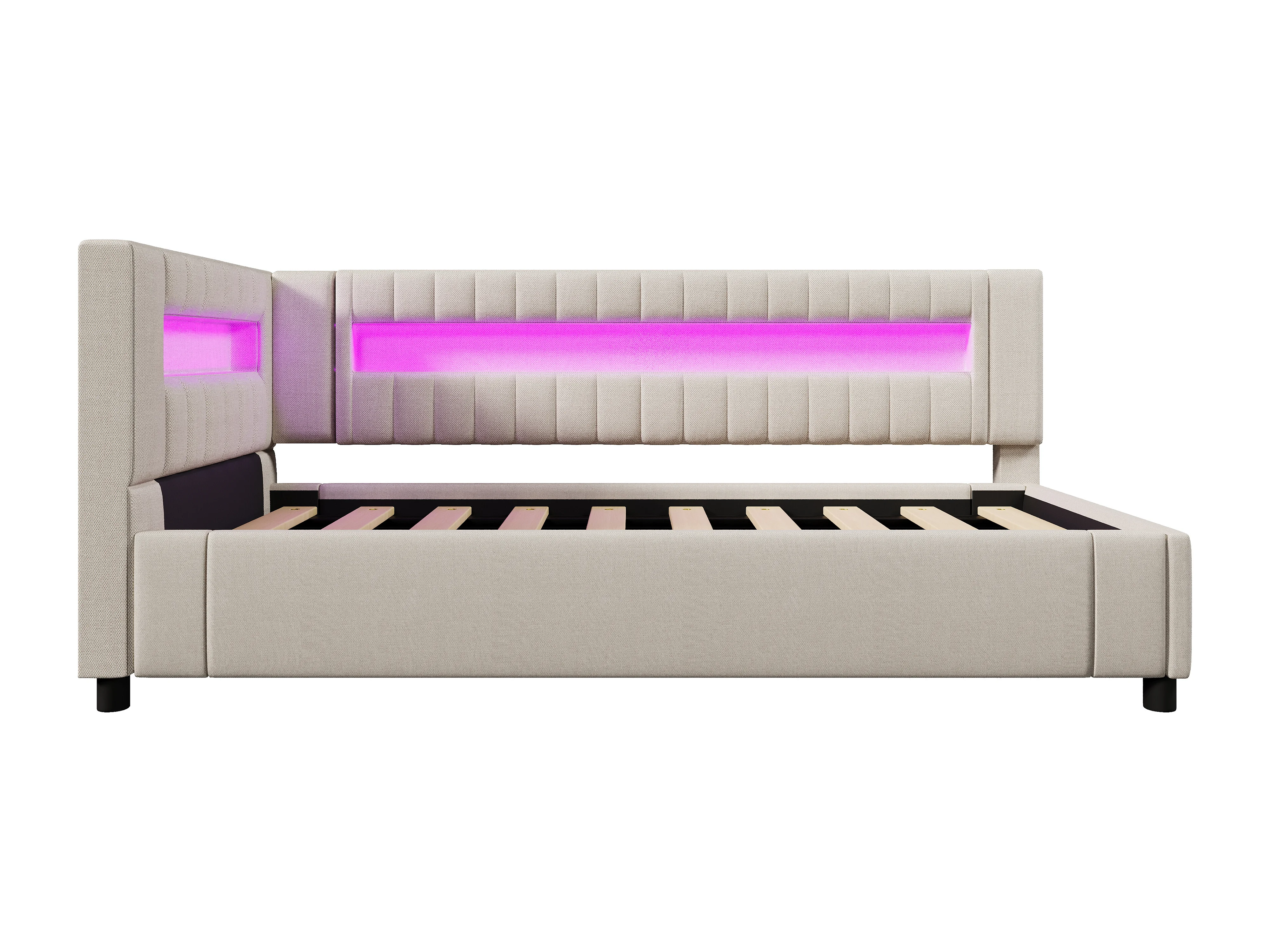 Slaapbank met opbergruimte 90x200 cm - met LED-lichtstrip - met USB- + TYPE-C-aansluitingen - linnen - beige (zonder matras)