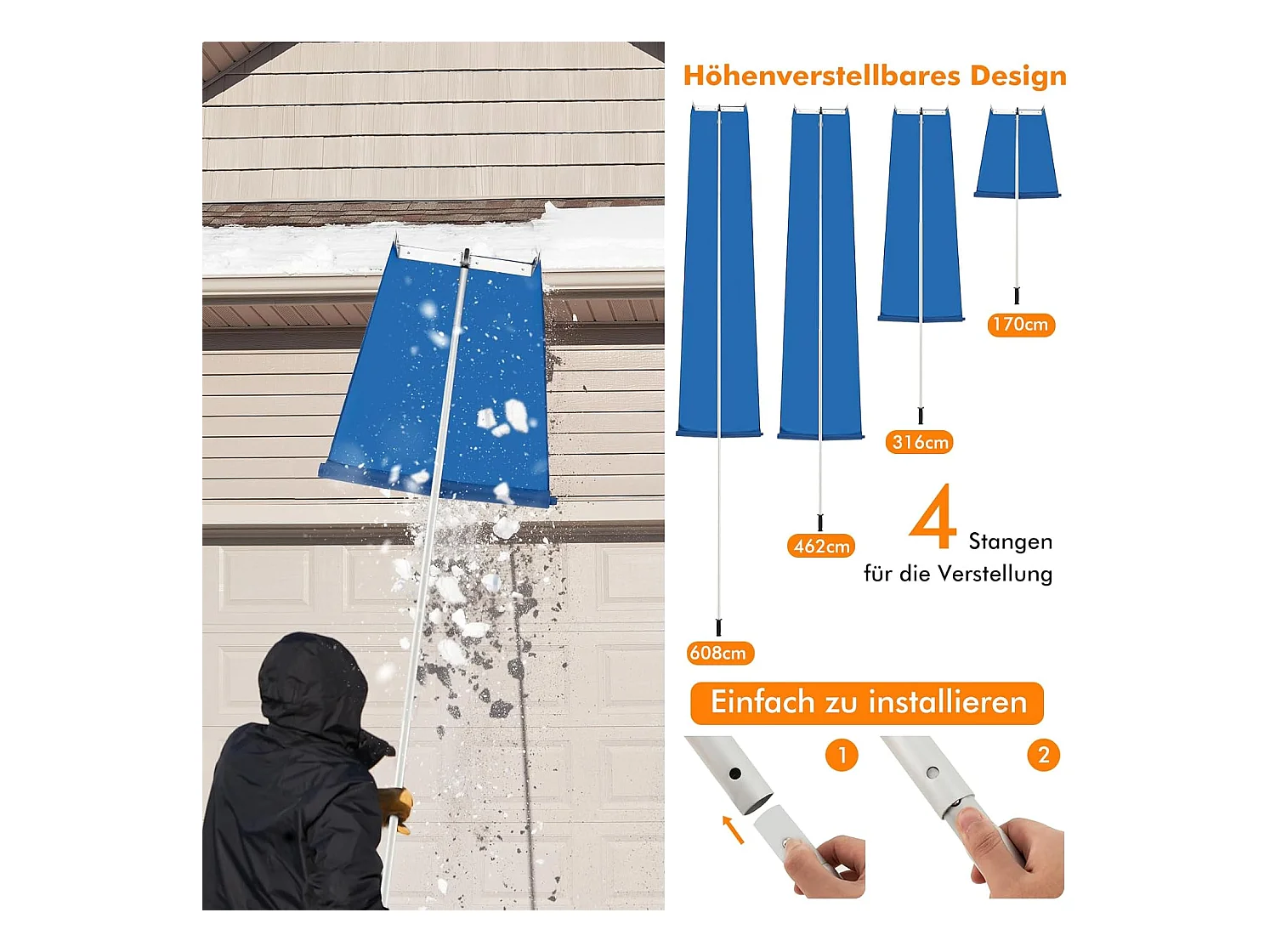 Sneeuwruimer voor dak, sneeuwruimer met telescoopsteel, antislip handgreep en klittenbandsluiting, dakruimer, sneeuwschuiver van aluminium, instelbereik 170-608 cm