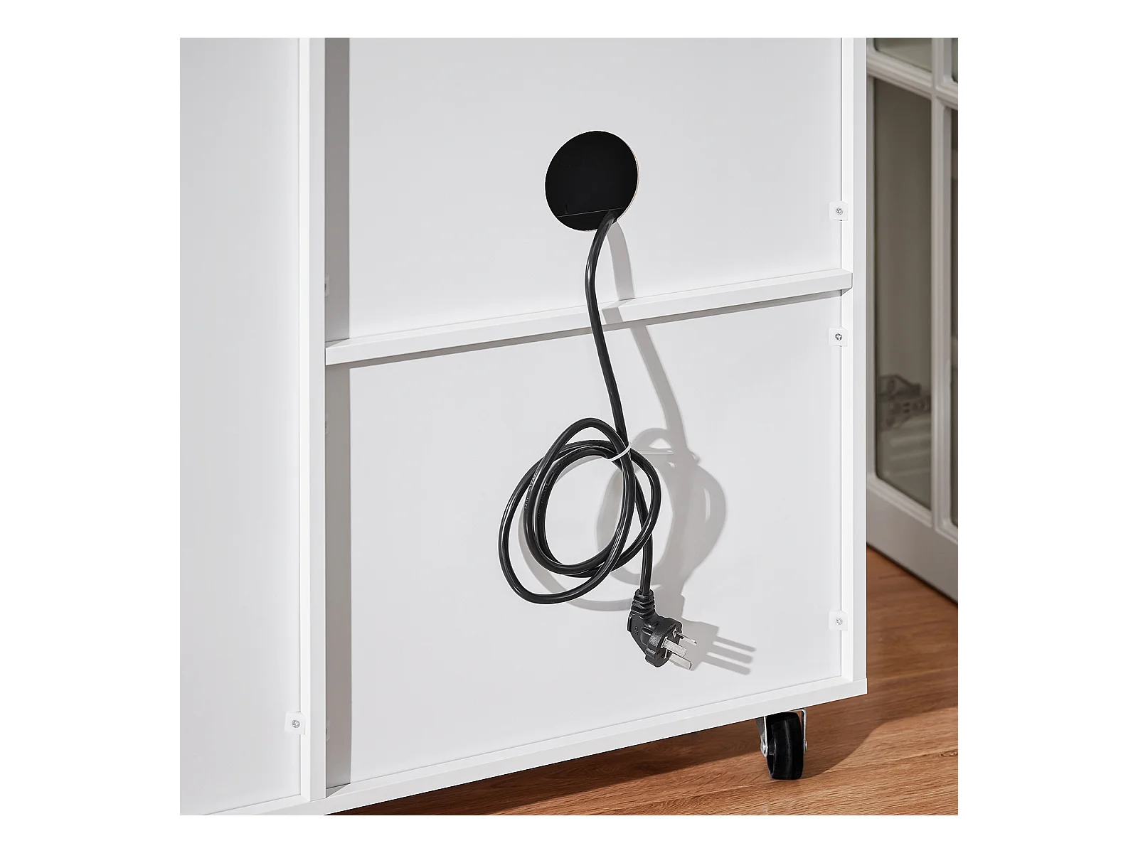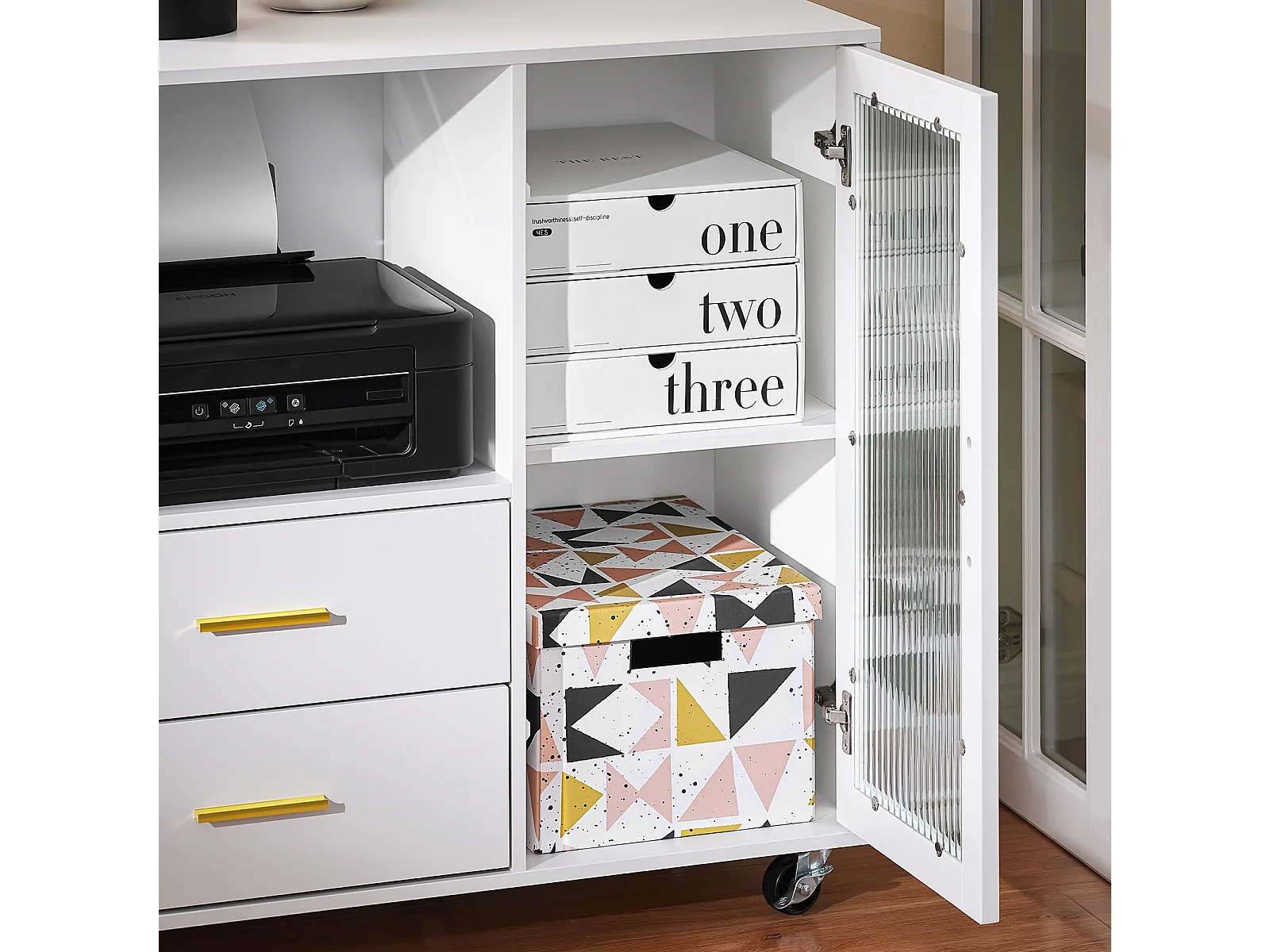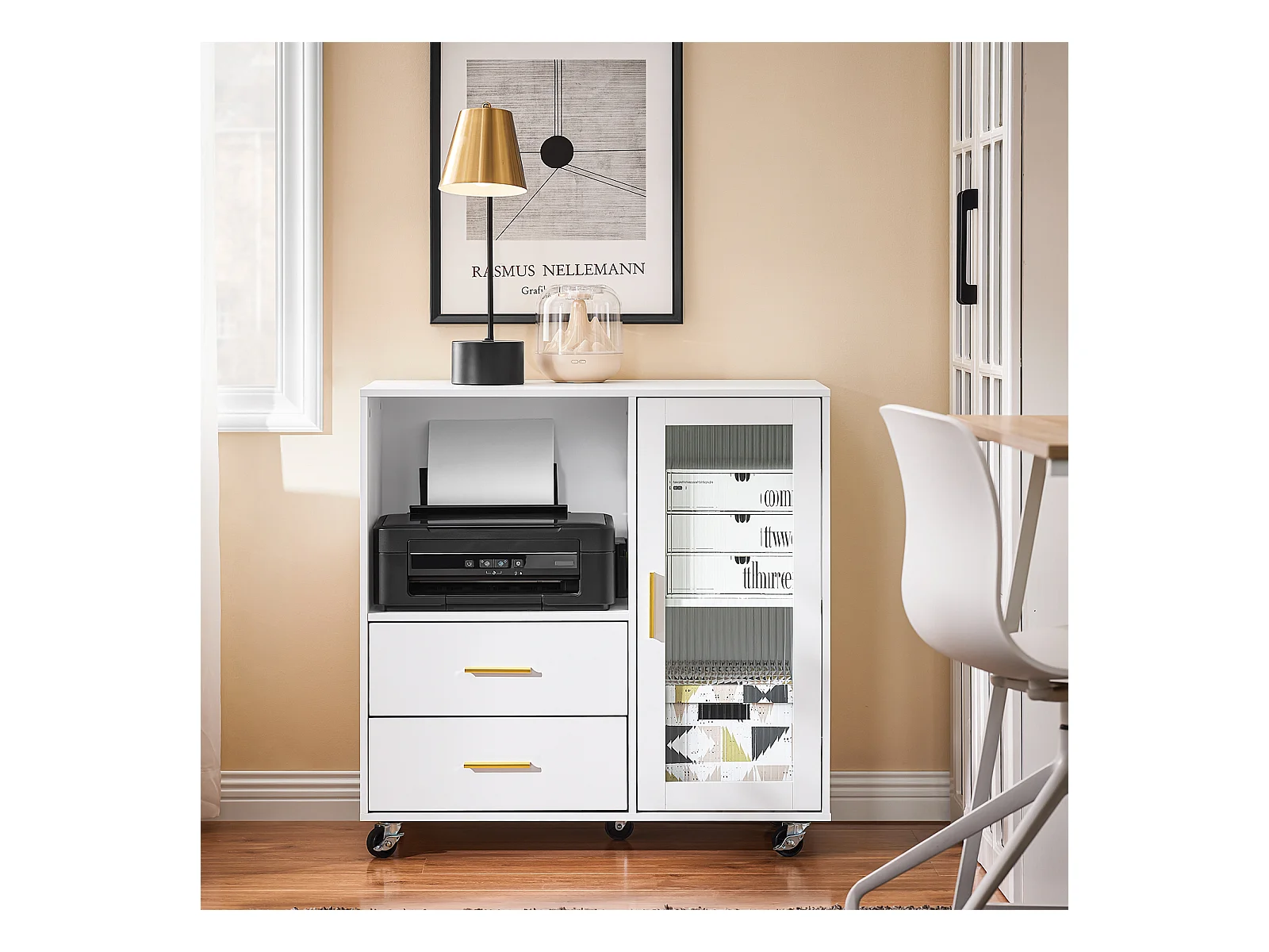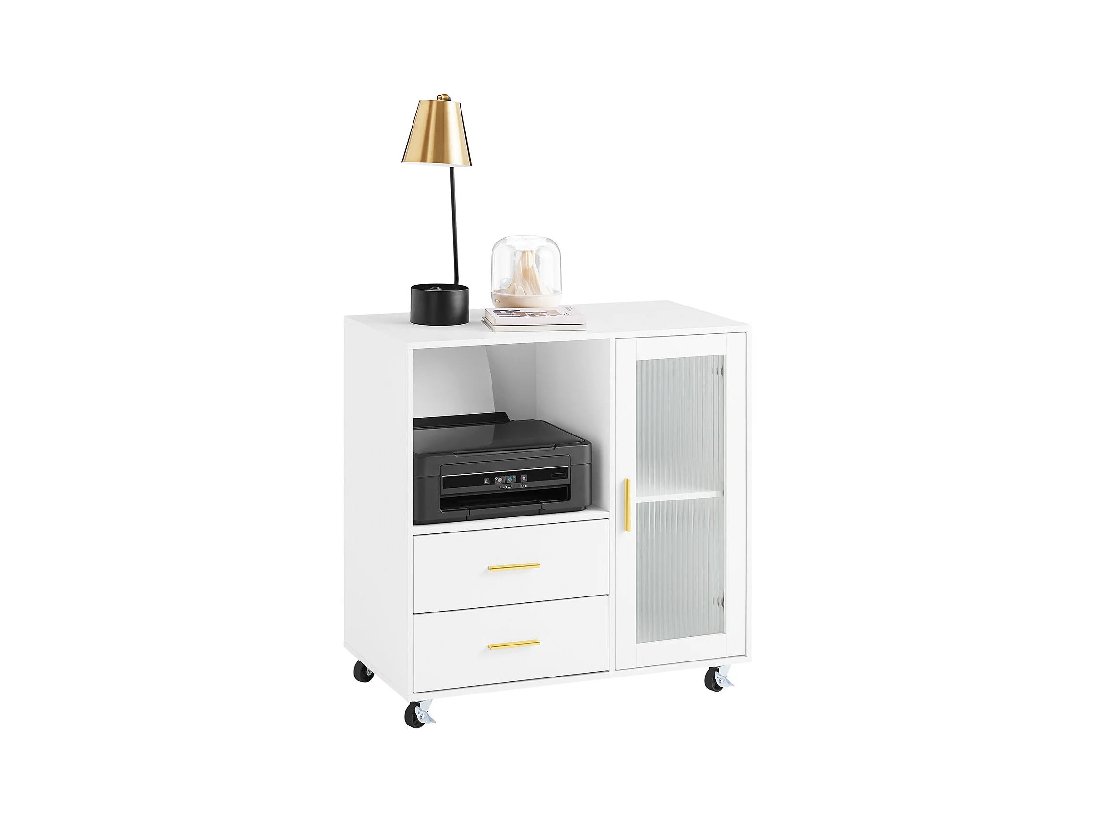 SoBuy ASK09-W Bureaukast met wieltjes, rolprinterhouder, bureau-organizer, opbergkast voor kantoor, opbergdoos met 2 laden, 1 glazen deur