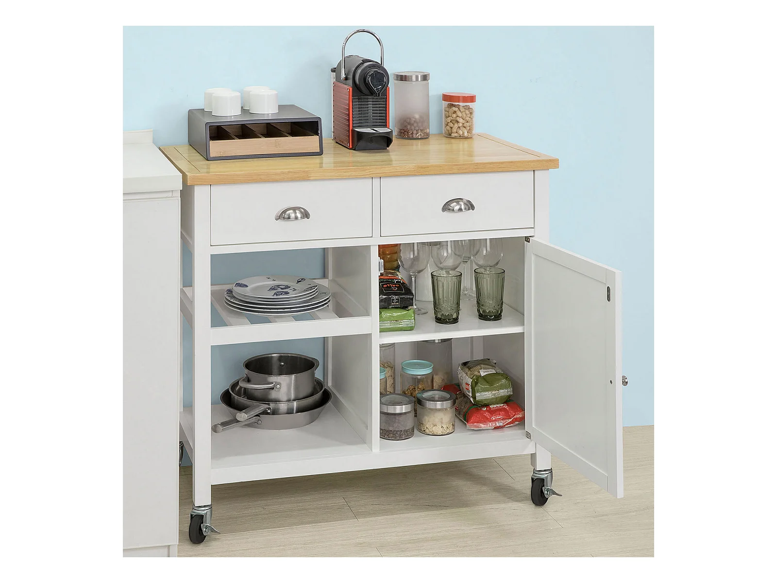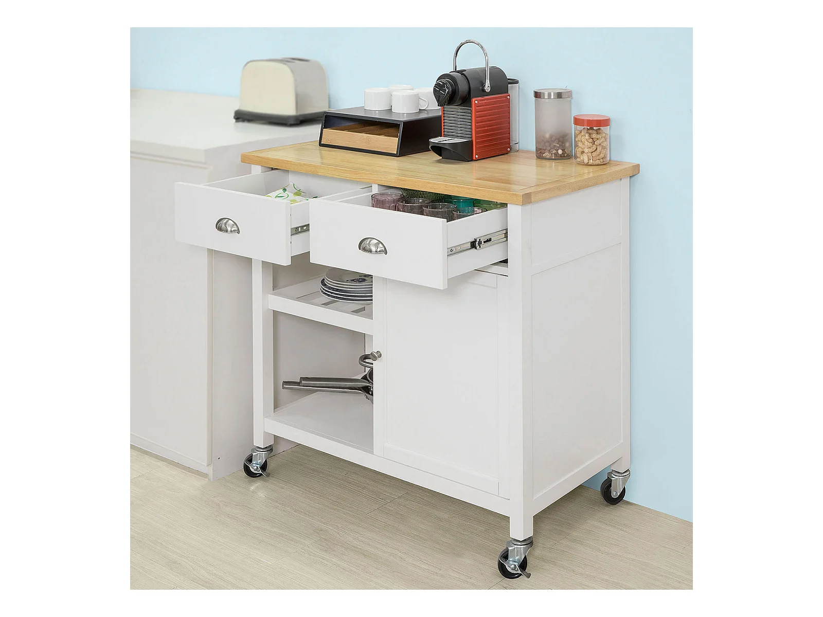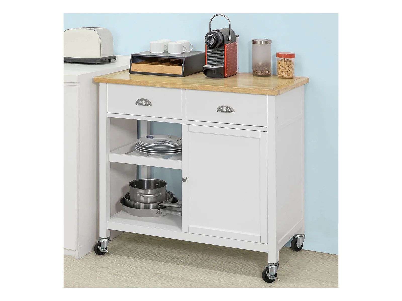 Multifunctionele keukentrolley, opklapbaar blad, 2 lades, wielen, wit en naturel (L120 x D40 x H89 cm)