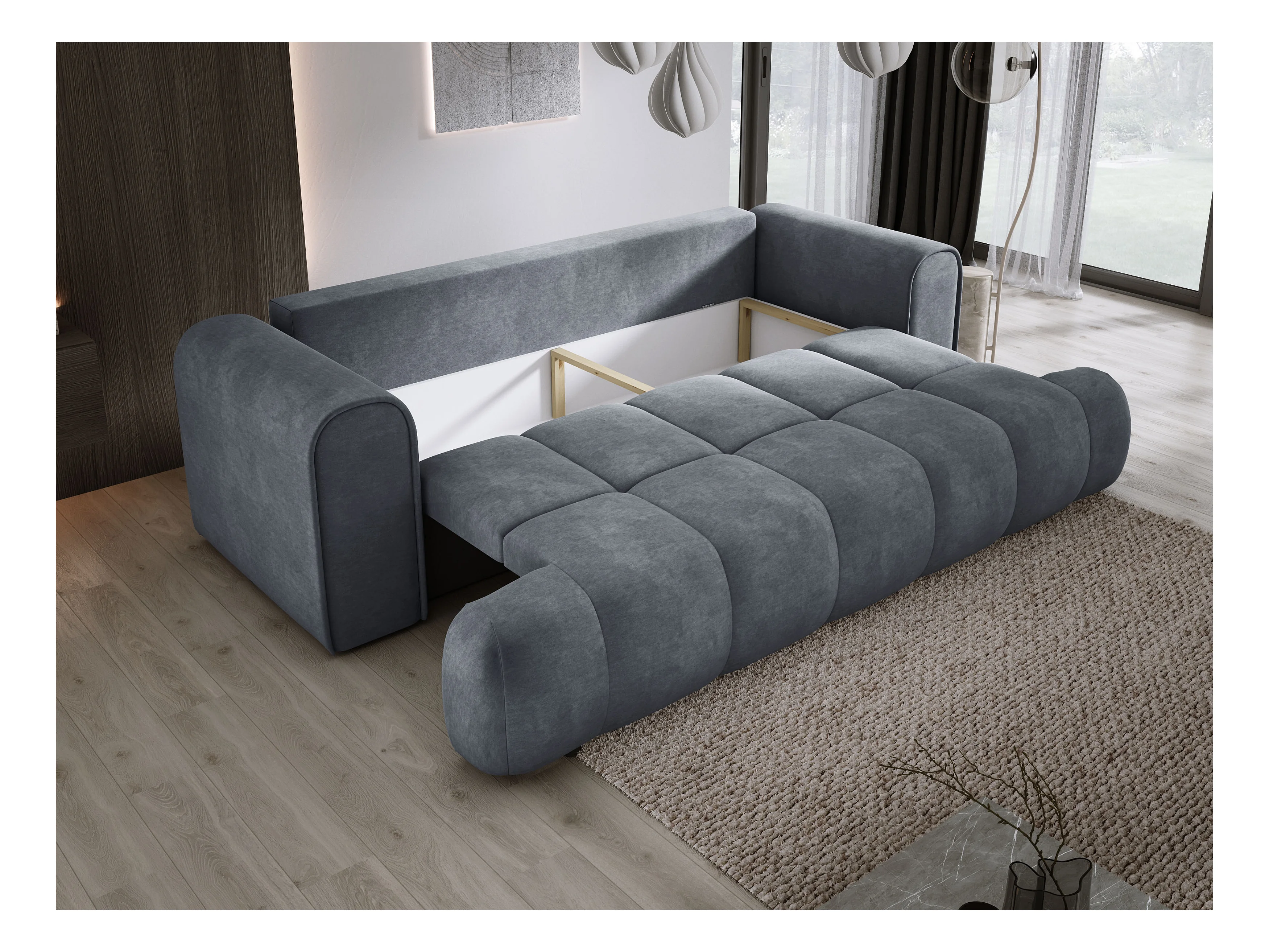 BOULI 4-zitsbank met Raven-stof, slaapfunctie 130x210cm, lichtbestendig, vrijstaand, opbergruimte, 264x162x82cm, rechter grijs