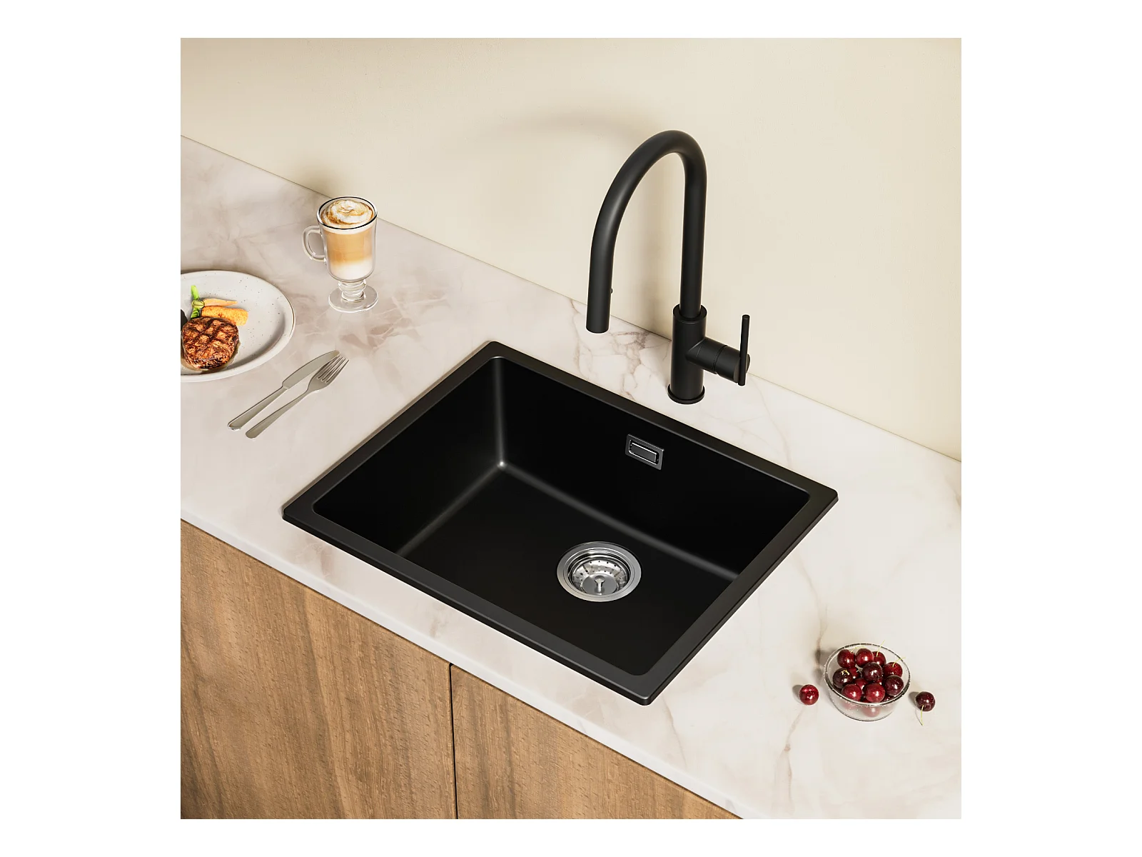 1-kom kwarts- en harsgootsteen, 3 montageopties, 55 * 44 * 20 cm + koudwaterkeukenkraan, zwart