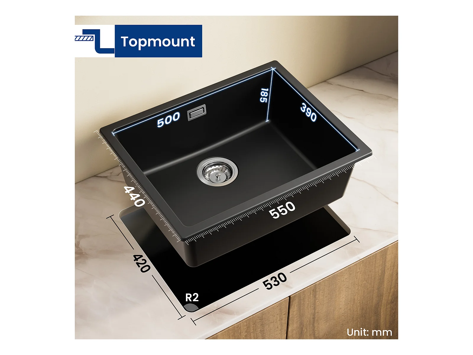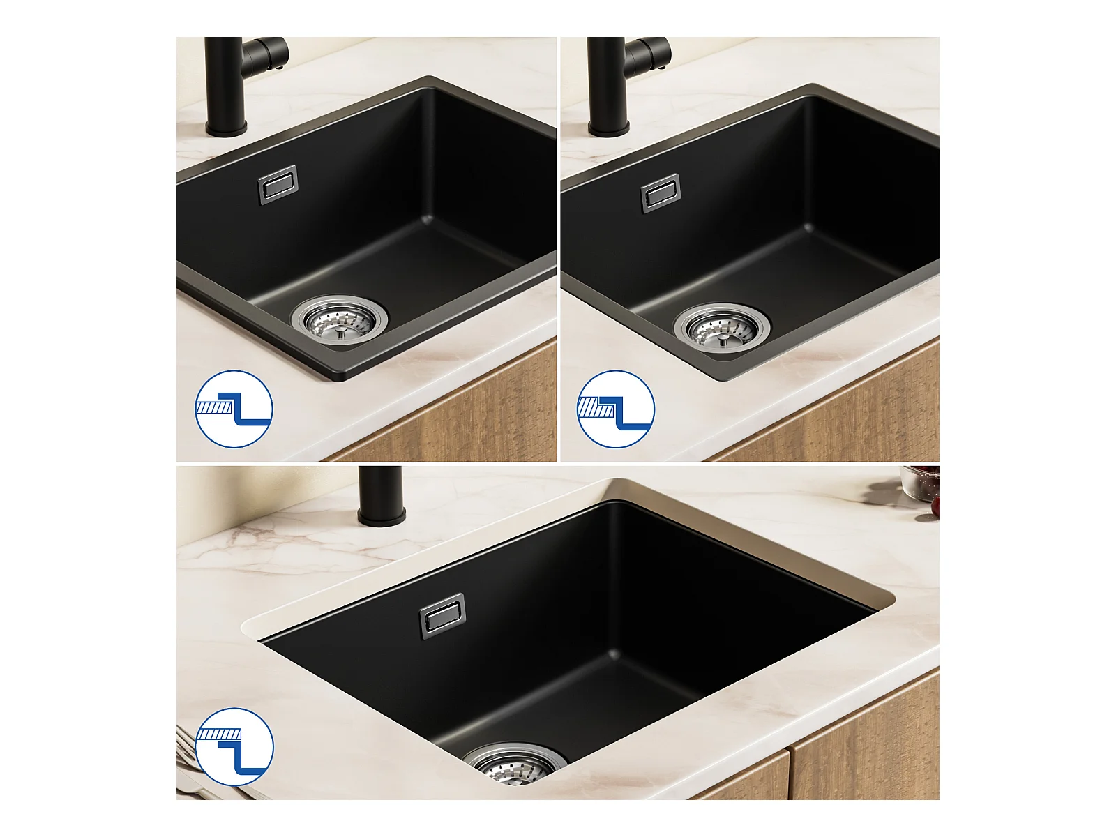 CECIPA MAX 1 spoelbak in kwarts en hars, aanrecht in zwartgrijs graniet, kwartsspoelbak 3 montagemogelijkheden, 55*44*20cm