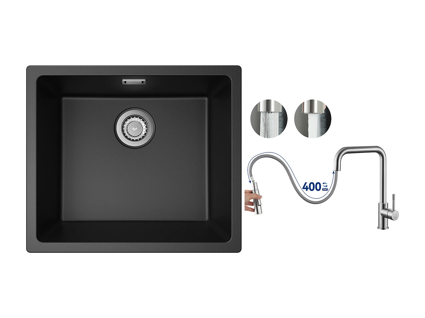 spoelbak in kwarts en hars, 3 montagemogelijkheden, 50*44*20cm + keukenmixer met uittrekbare spray